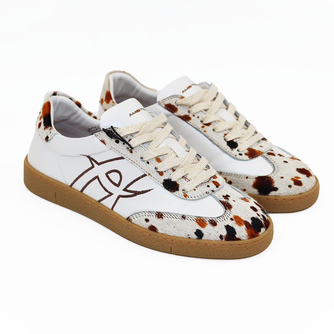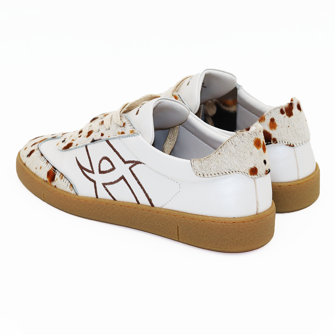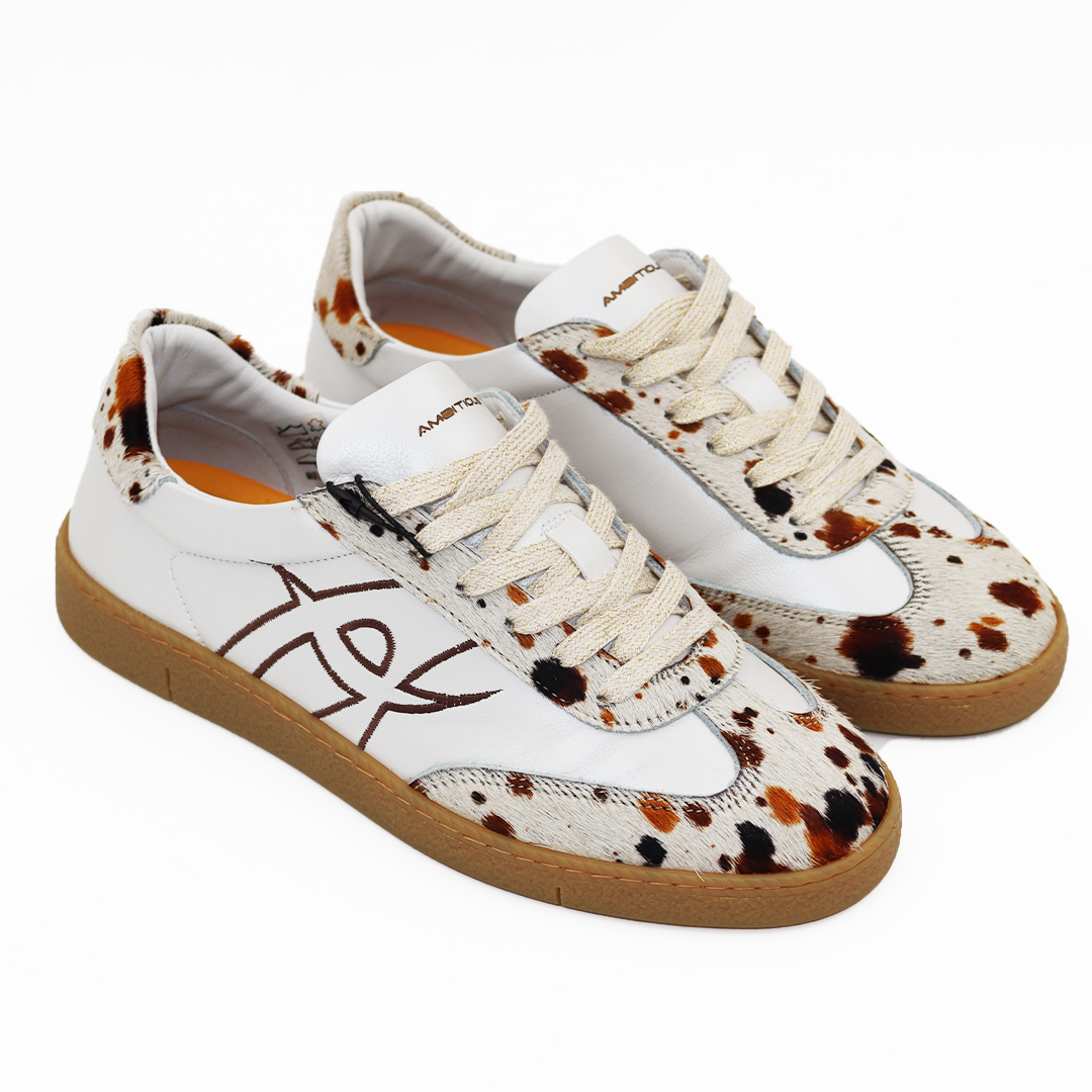 Ambitious kožne ženske patike u beloj boji na manjem đonu sa dlakom u kravljem animal printu na peti i prstima