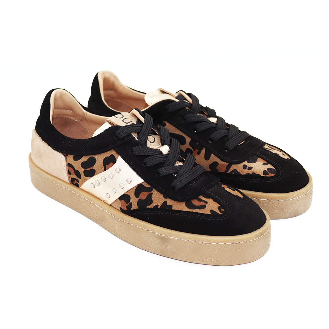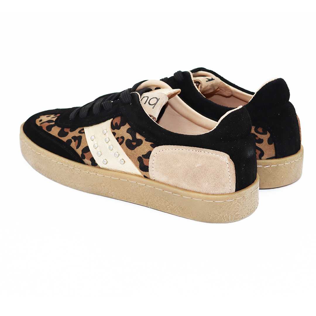 Bueno crne kožne patike na manjem đonu sa zlatnim detaljima i leoprad animal printu sa strane