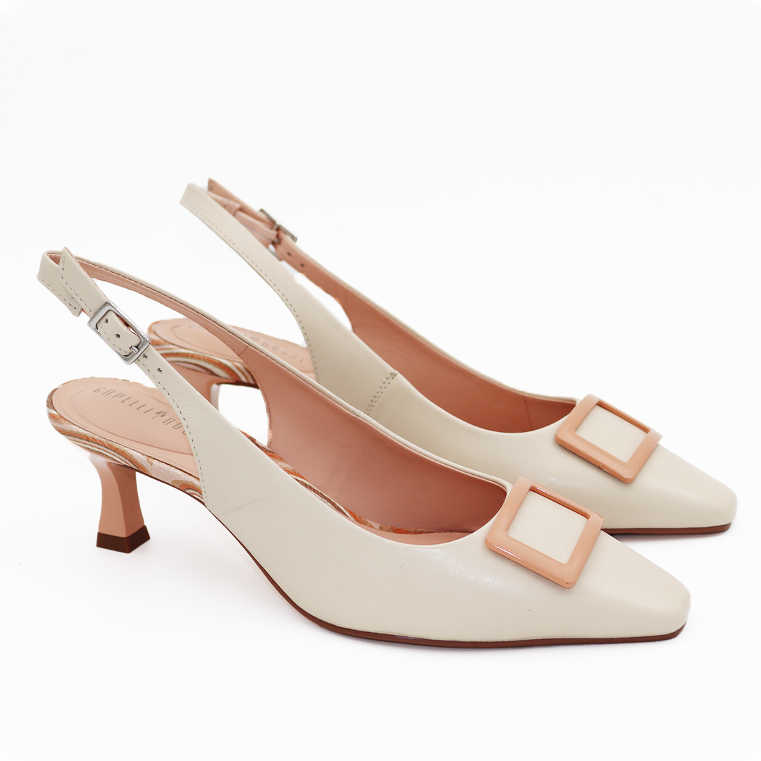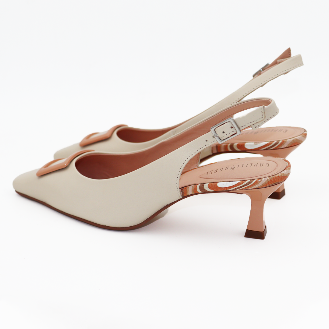 Capelli Rossi kožne krem sandalete na špic sa bež šnalom na špicu i bež potpeticom od 5 cm, sa bež-krem kožnim dezenom na peti.