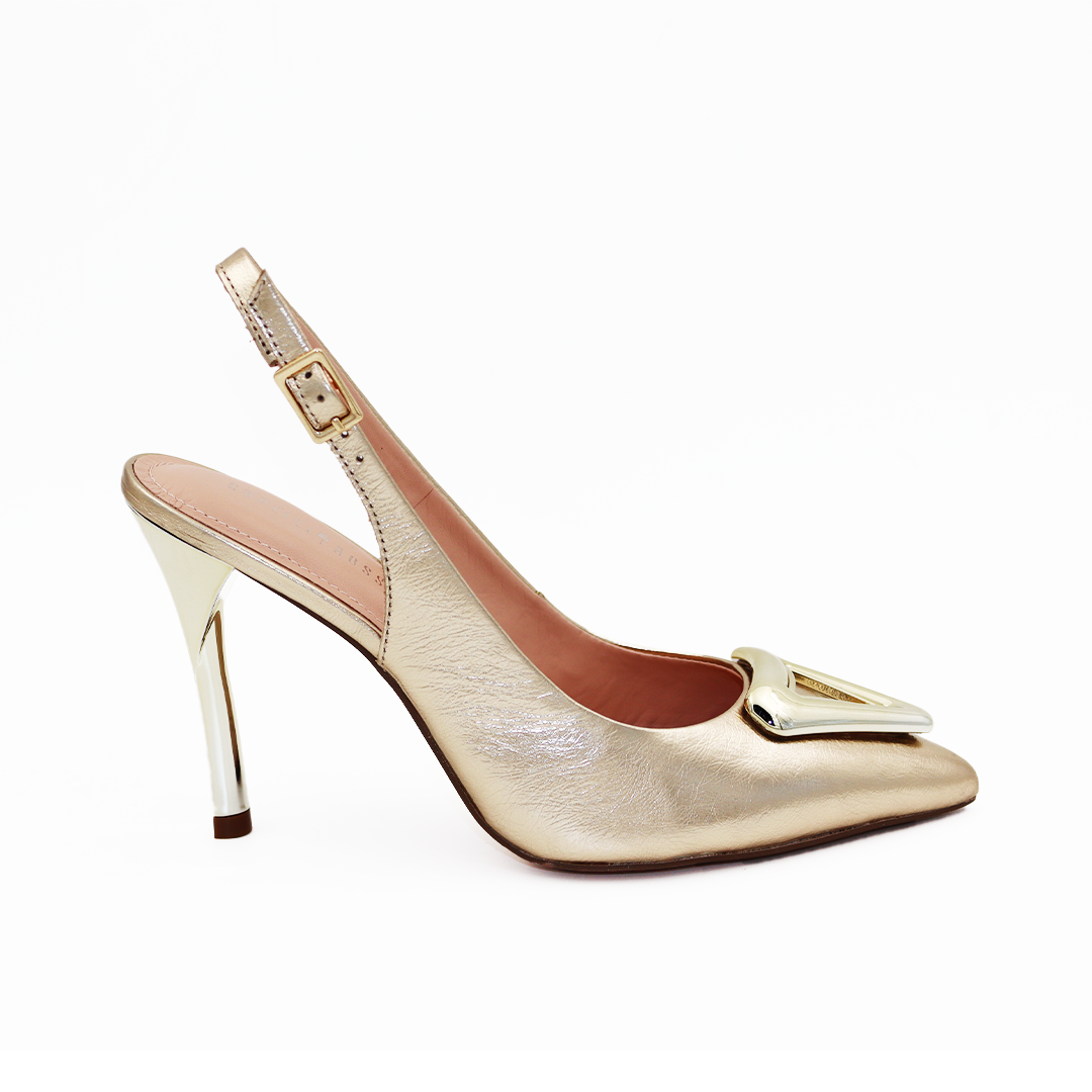 Capelli Rossi sandalete na štiklu u metalik zlatnoj boji sa dekorativnom šnalom na špicu i zlatnom metalik štiklom od 9 cm