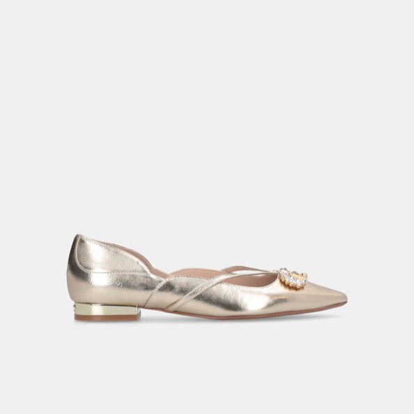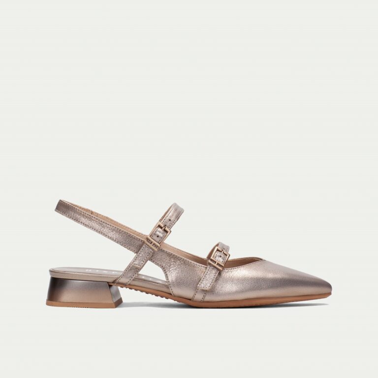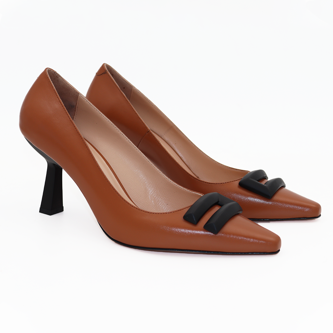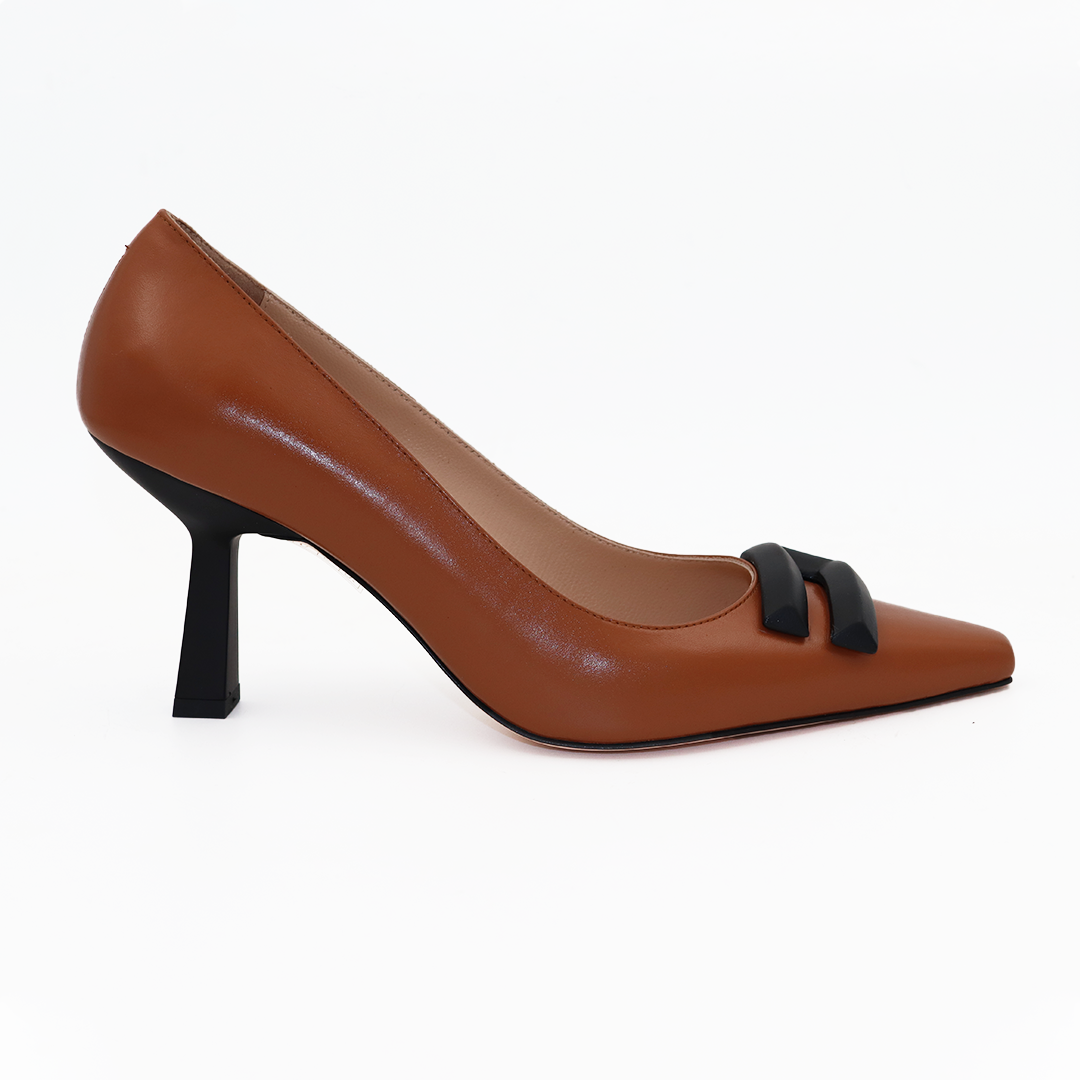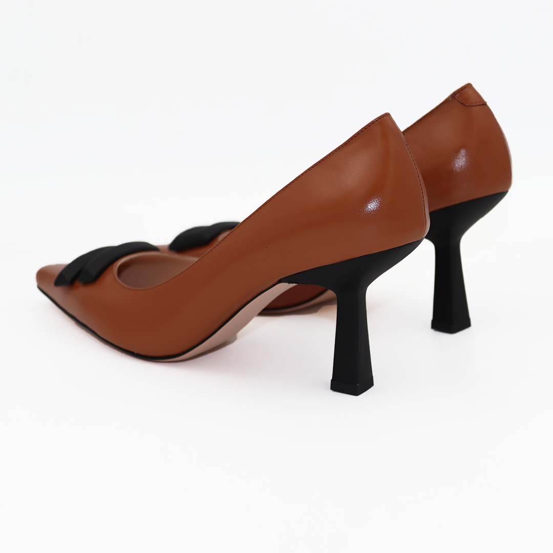 De Mazzio kožne braon cipele sa crnom šnalom na špicu i crnom potpeticom od 8 cm.