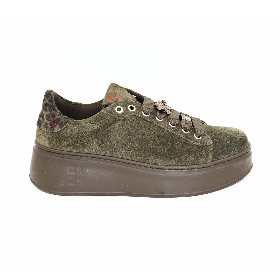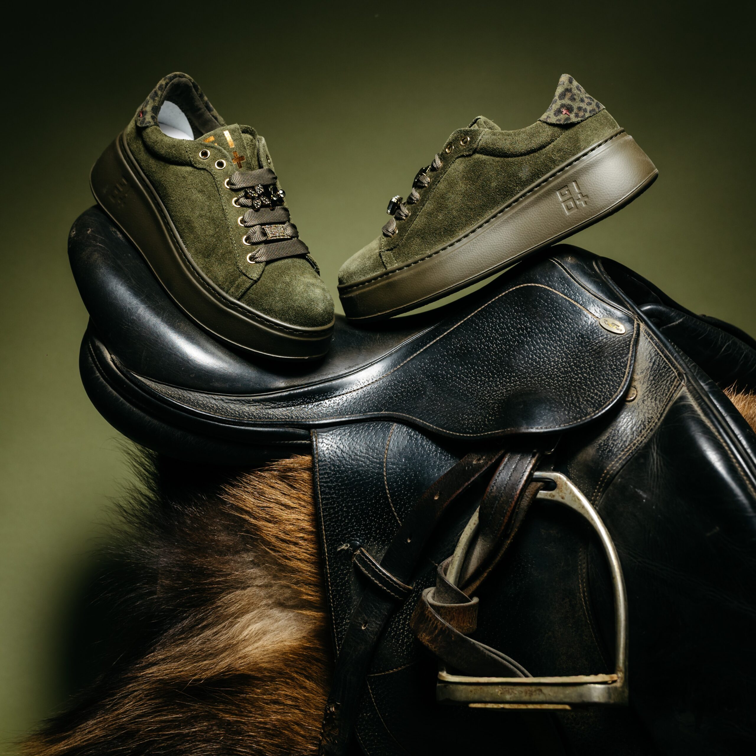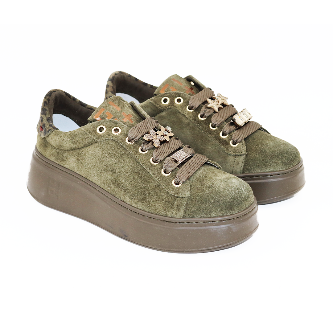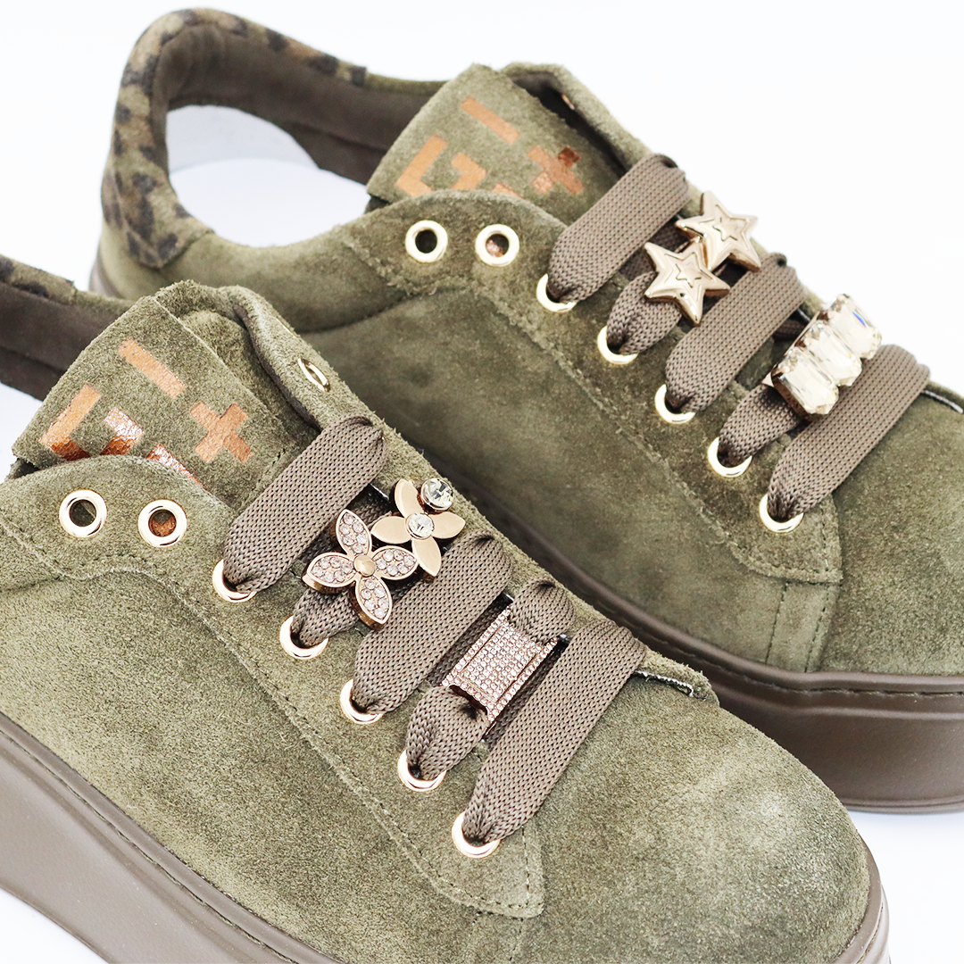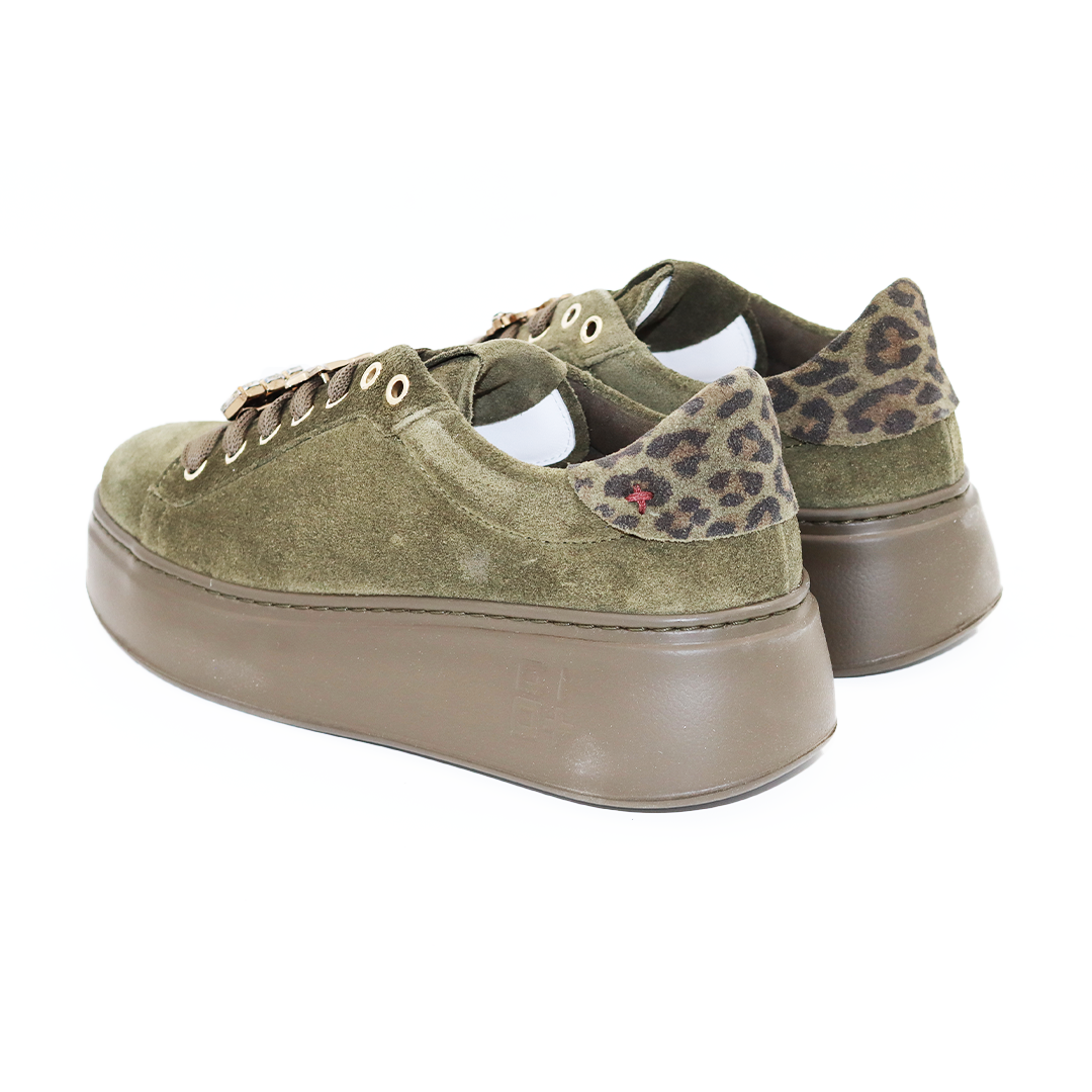 Gio Piu kožne italijanske kožne velur patike u zelenoj boji sa zelenim leopard printom na peti i dekorativnim šnalama na pertlama
