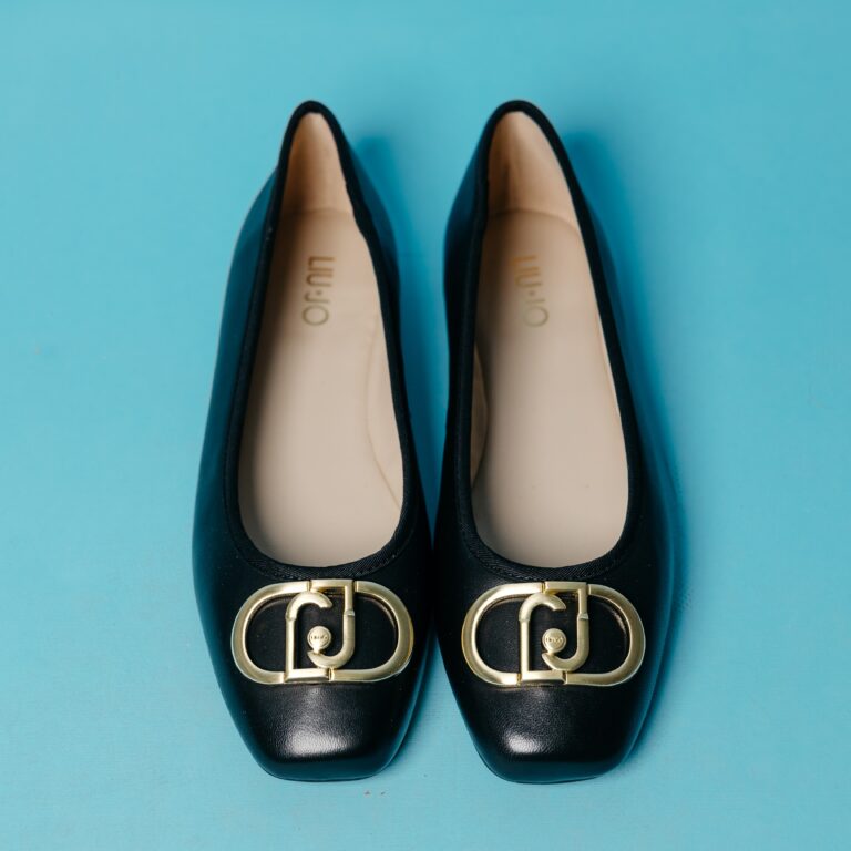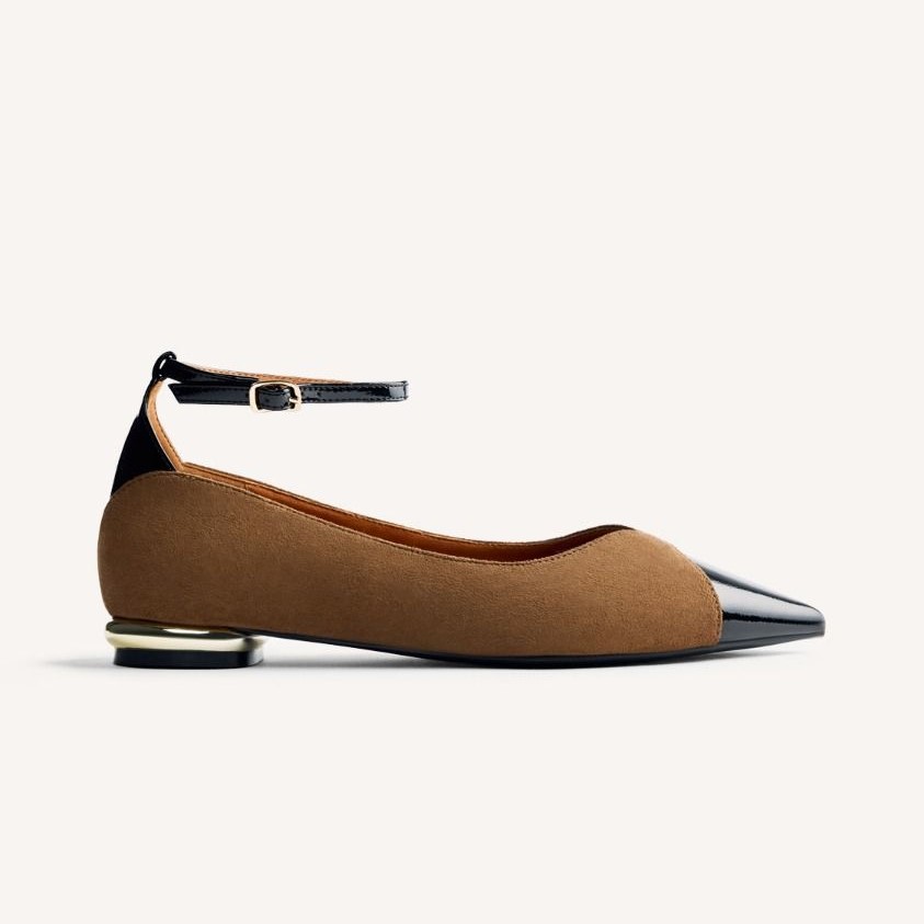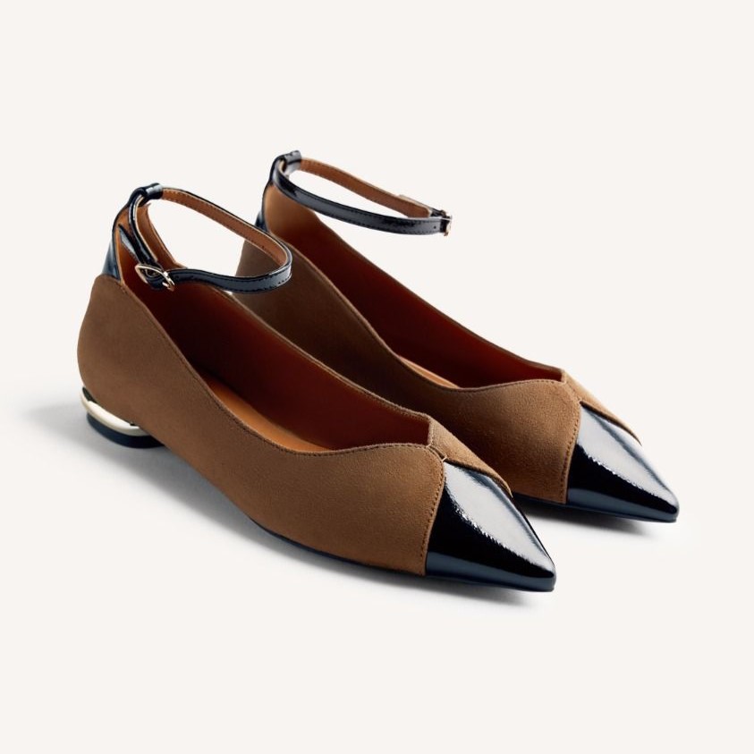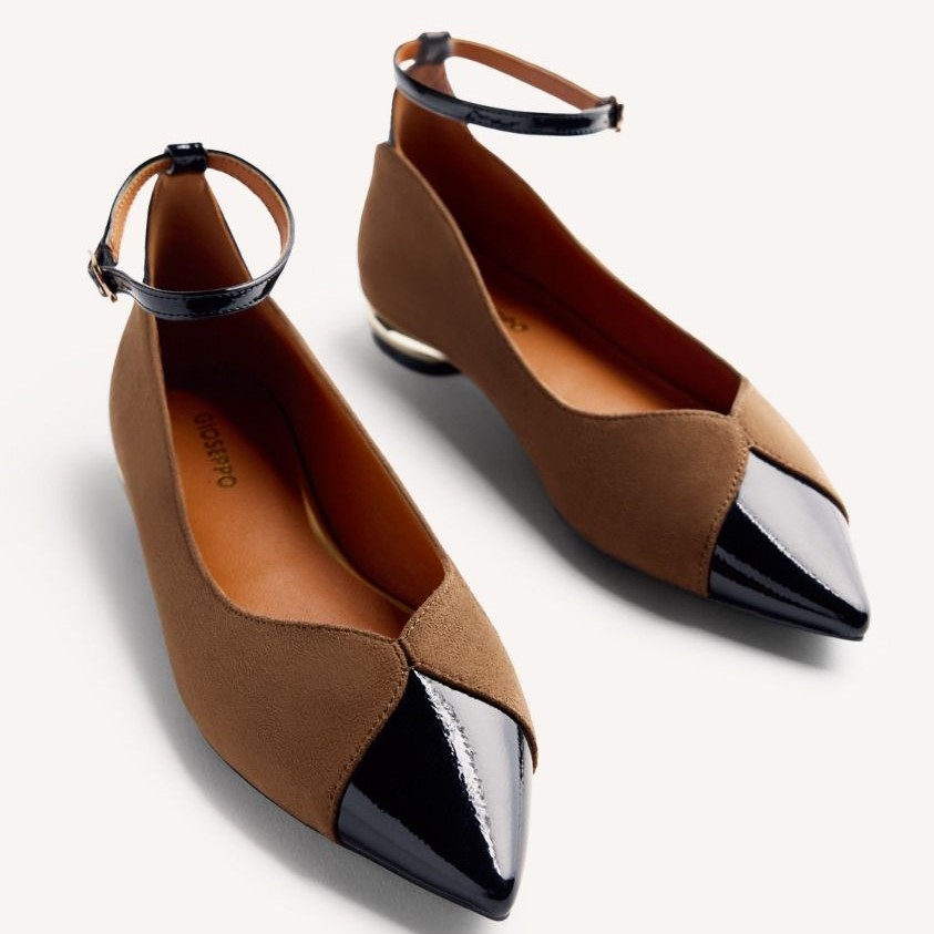 Gioseppo taupe ravne cipele na špic sa crnim kaišem oko zgloba i lakovanim crnim špicem