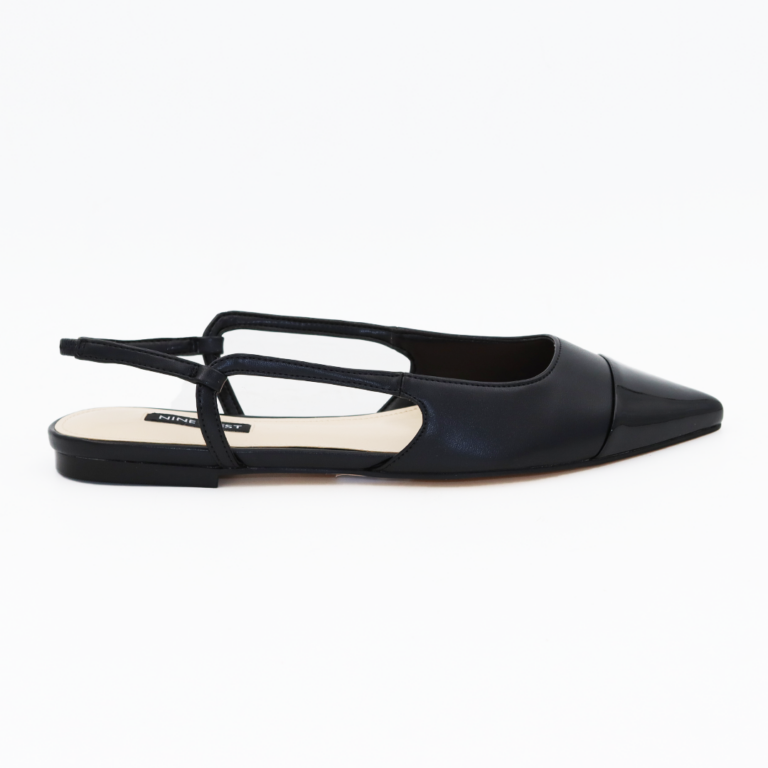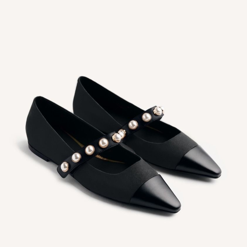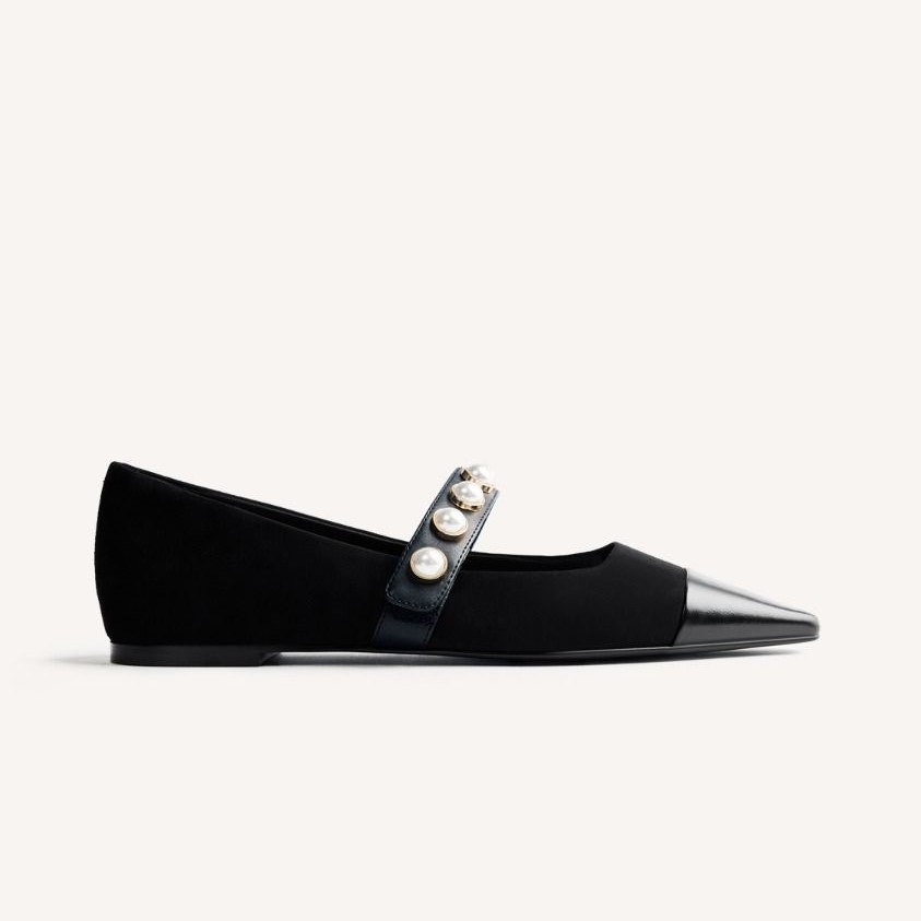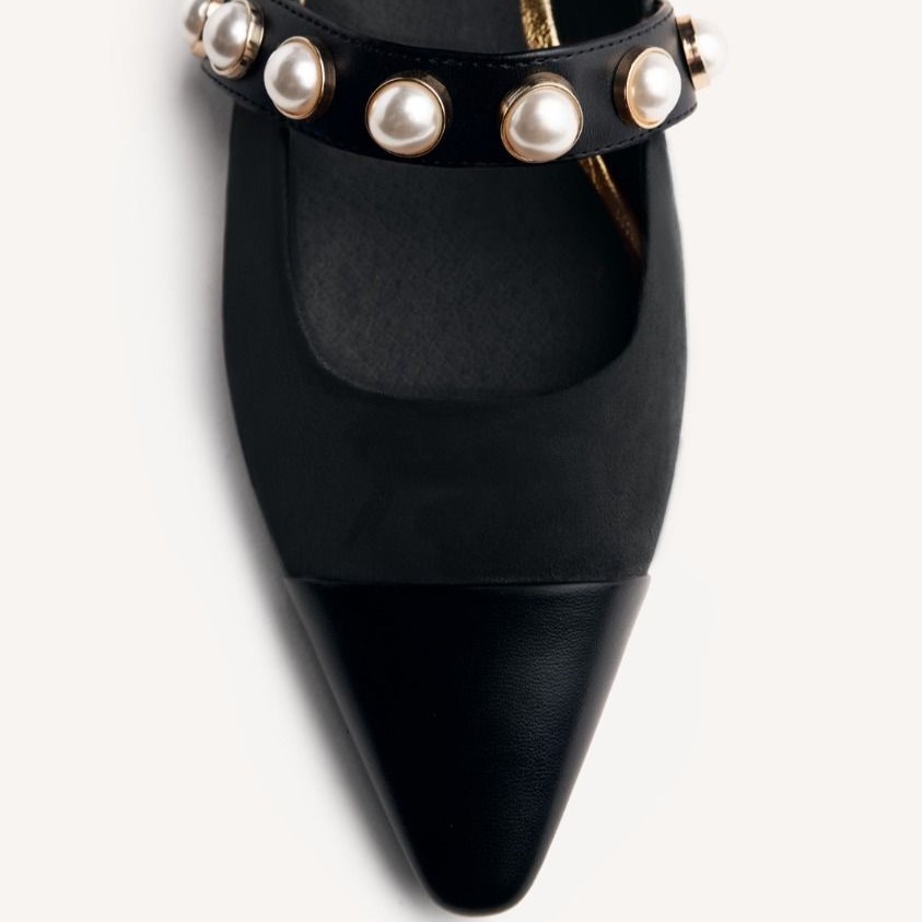 Gioseppo ravne crne cipele u veluru sa kožnim crnim špic vrhom i kaišem sa biserima preko risa
