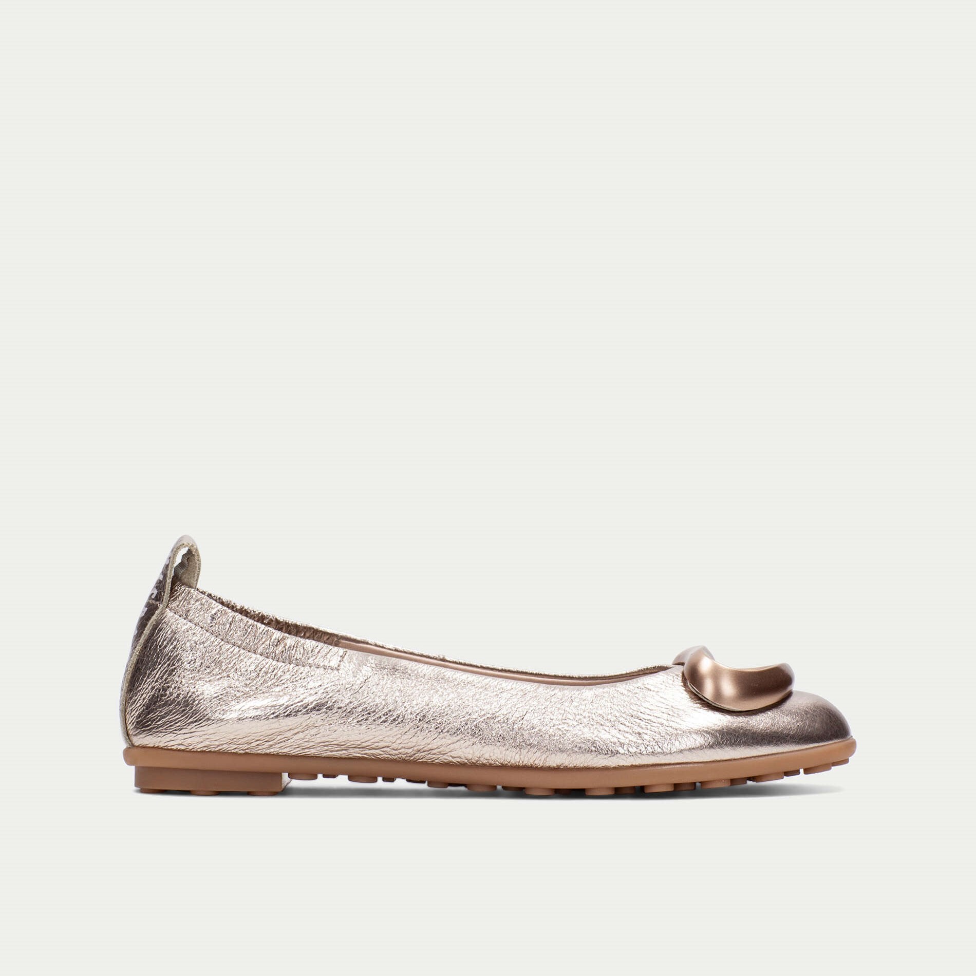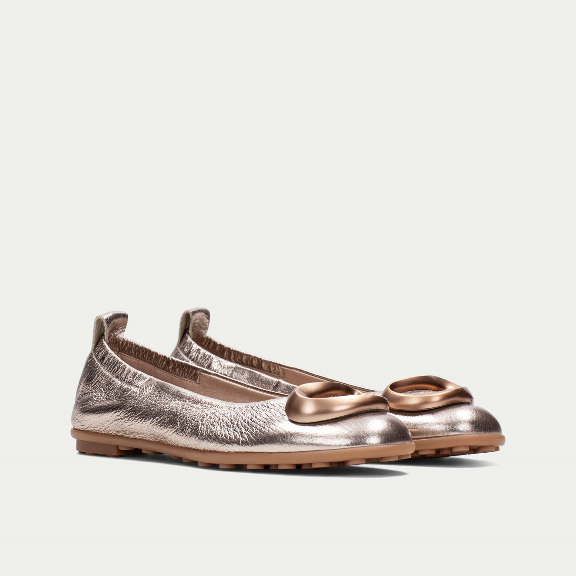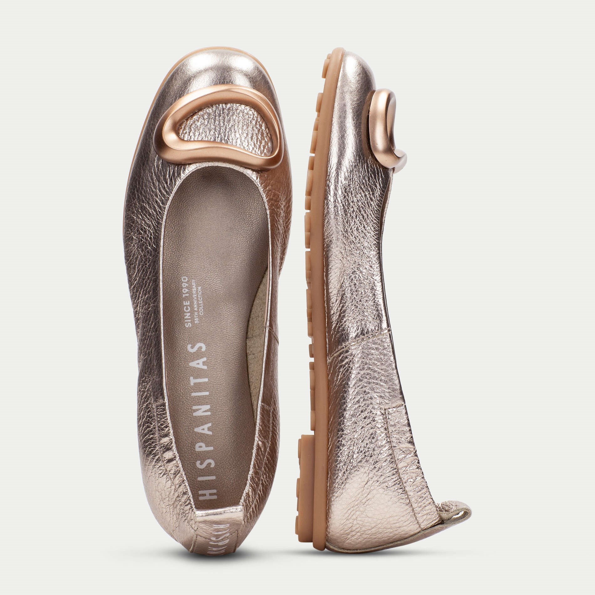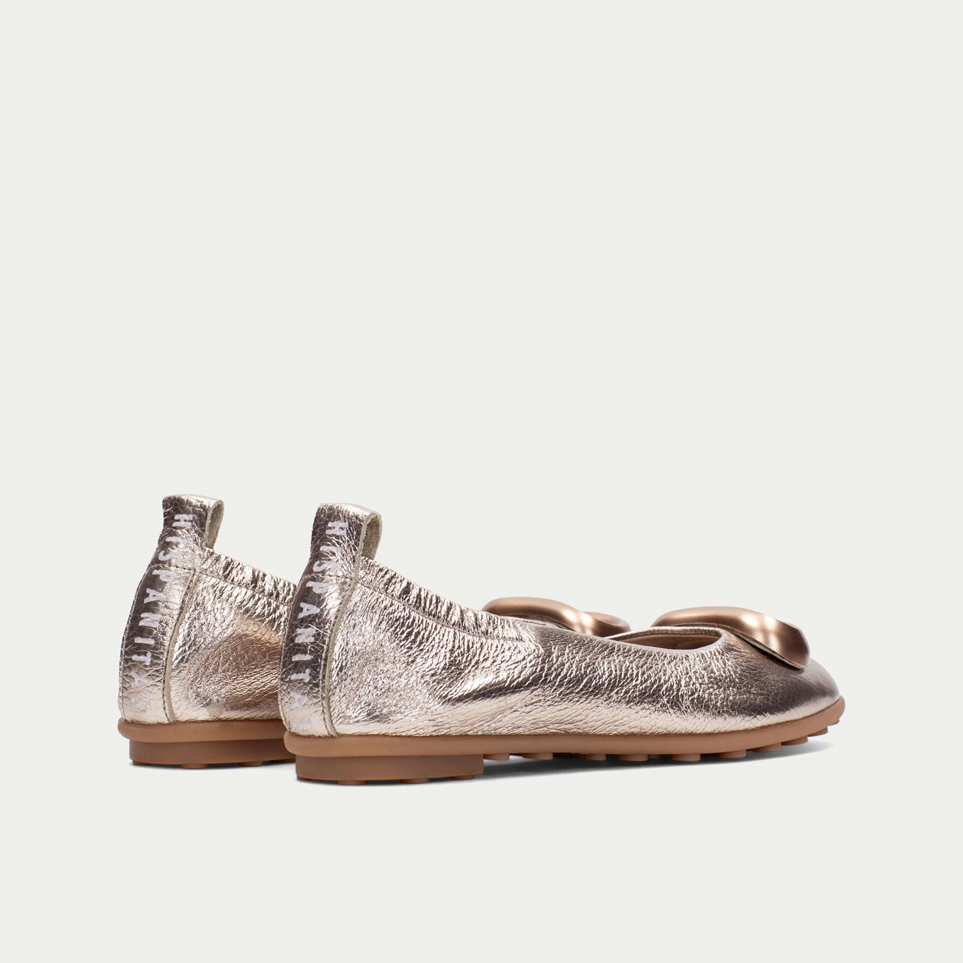 Hispanitas preudobne kožne baletanke sa ojačanim đonom u antico zlatnoj boji sa zlatnom šnalom na zaobljenom vrhu.