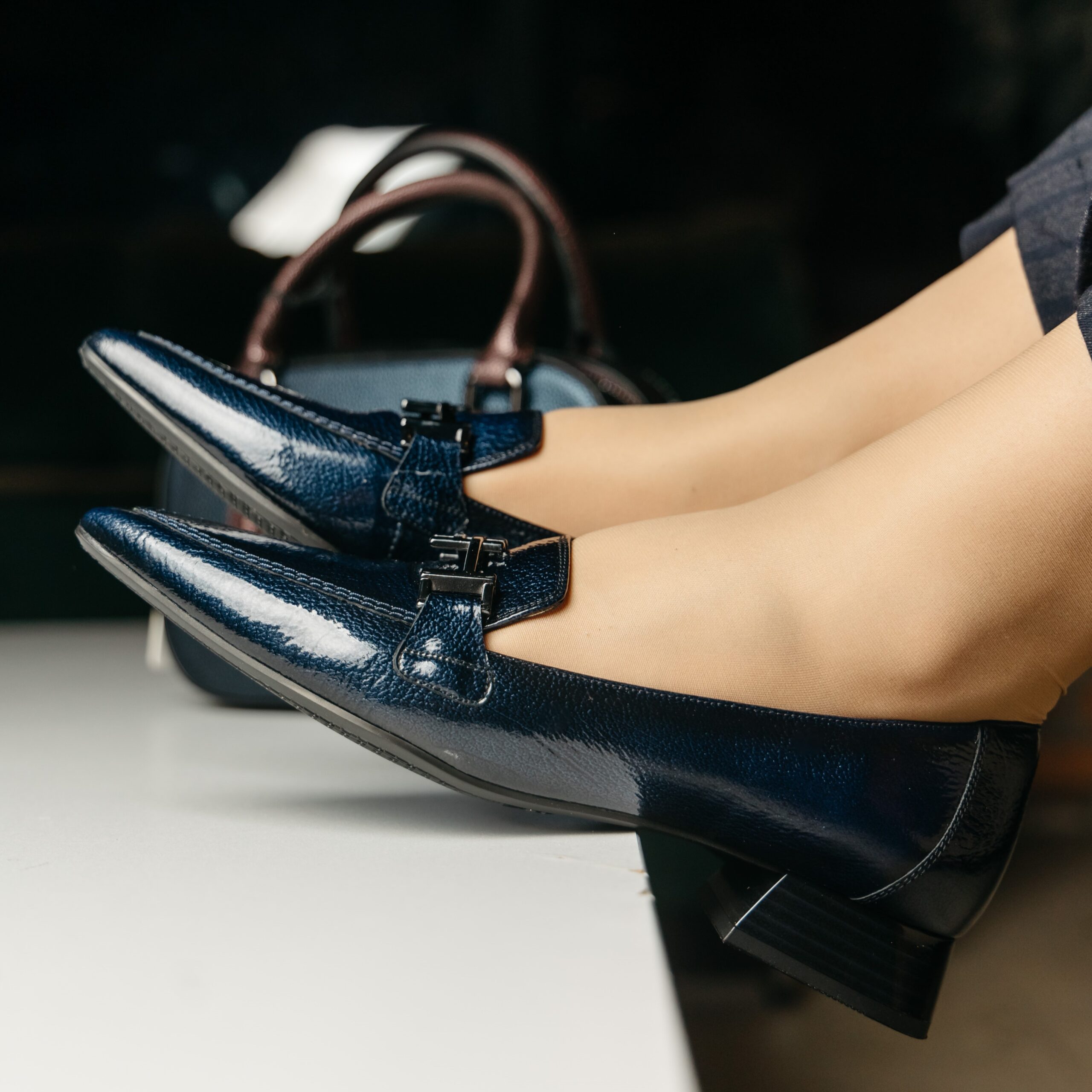 Hispanitas teget kožne lakovane cipele na špic sa srebrnom mat šnalom na risu.