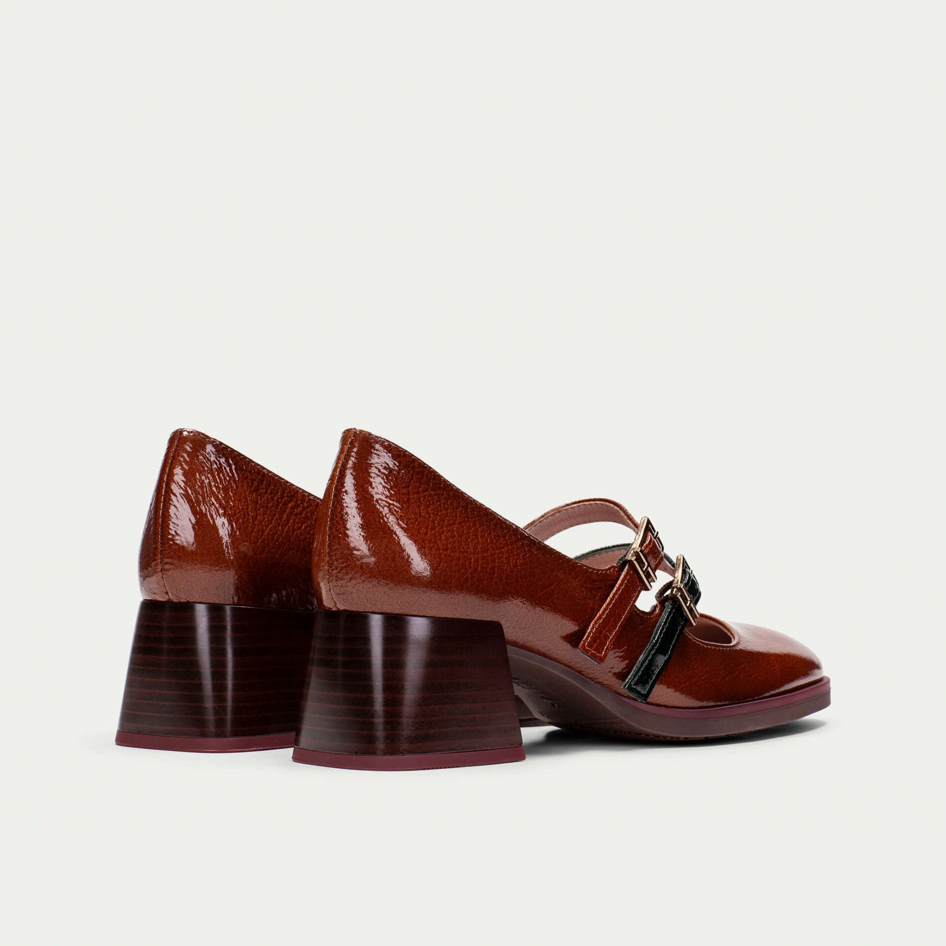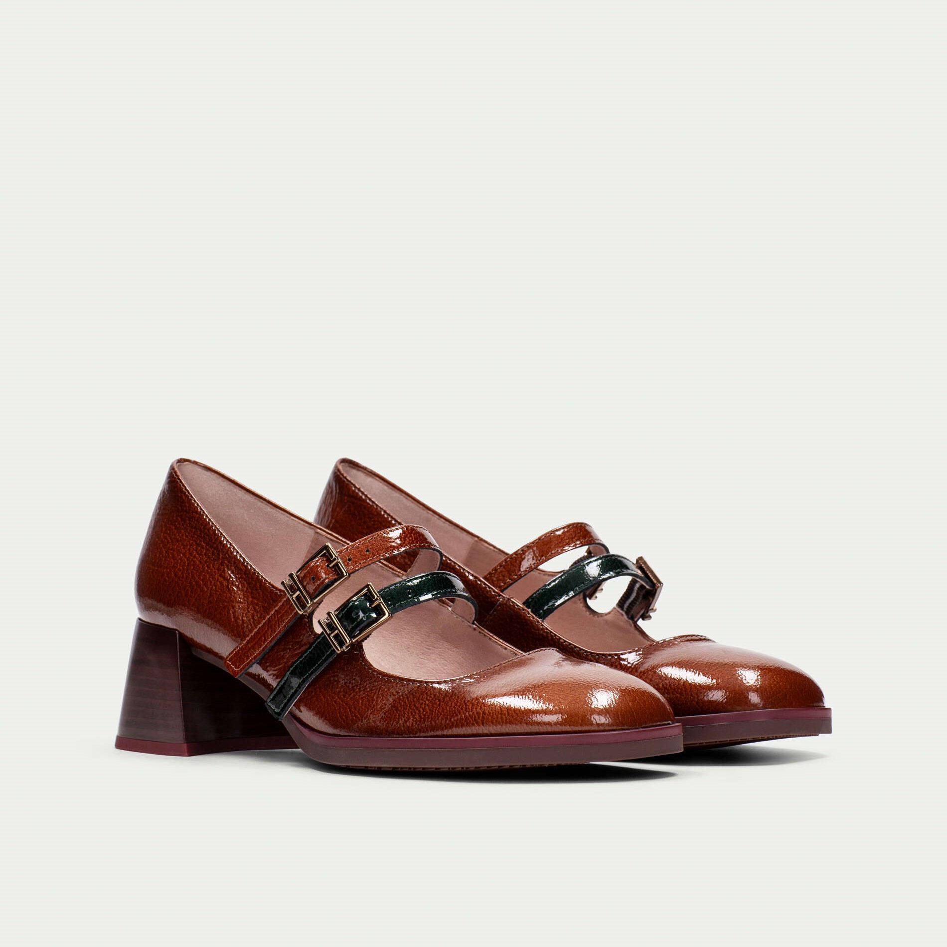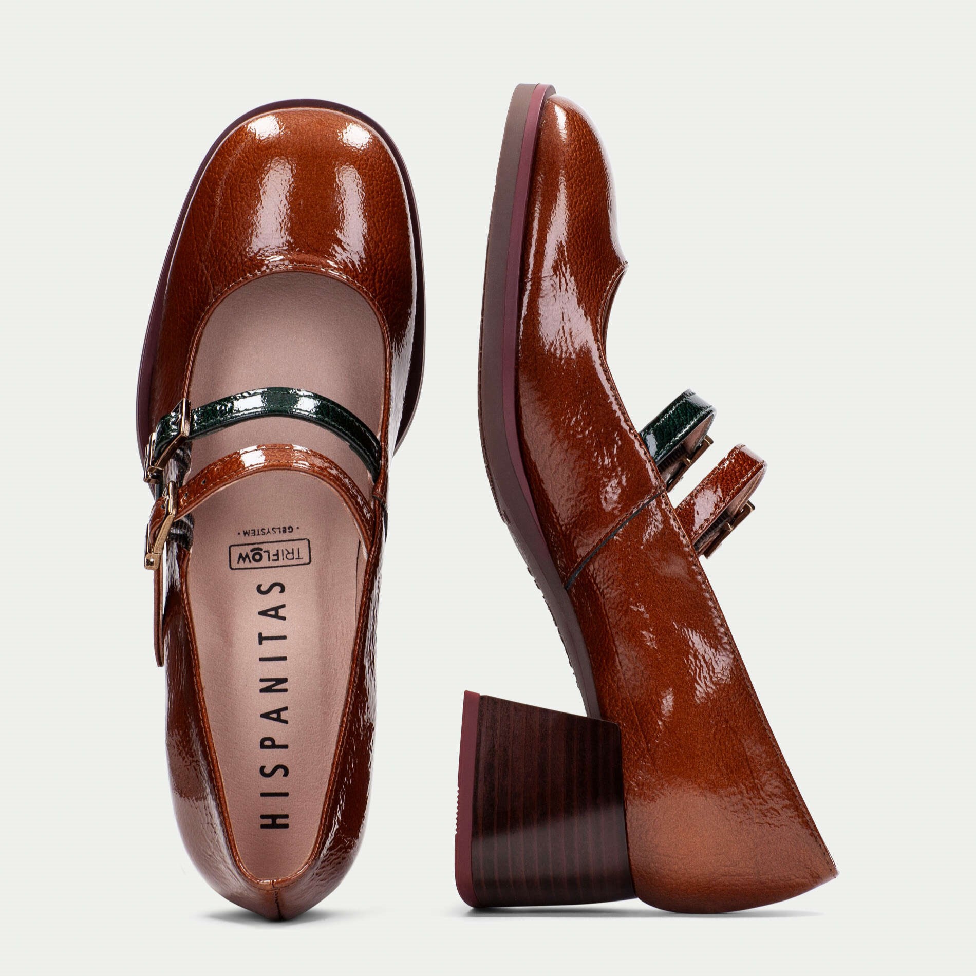 Hispanitas kožne braon lakovane cipele na oblom vrhu, punoj srednjoj peti i dva kaiša preko risa.