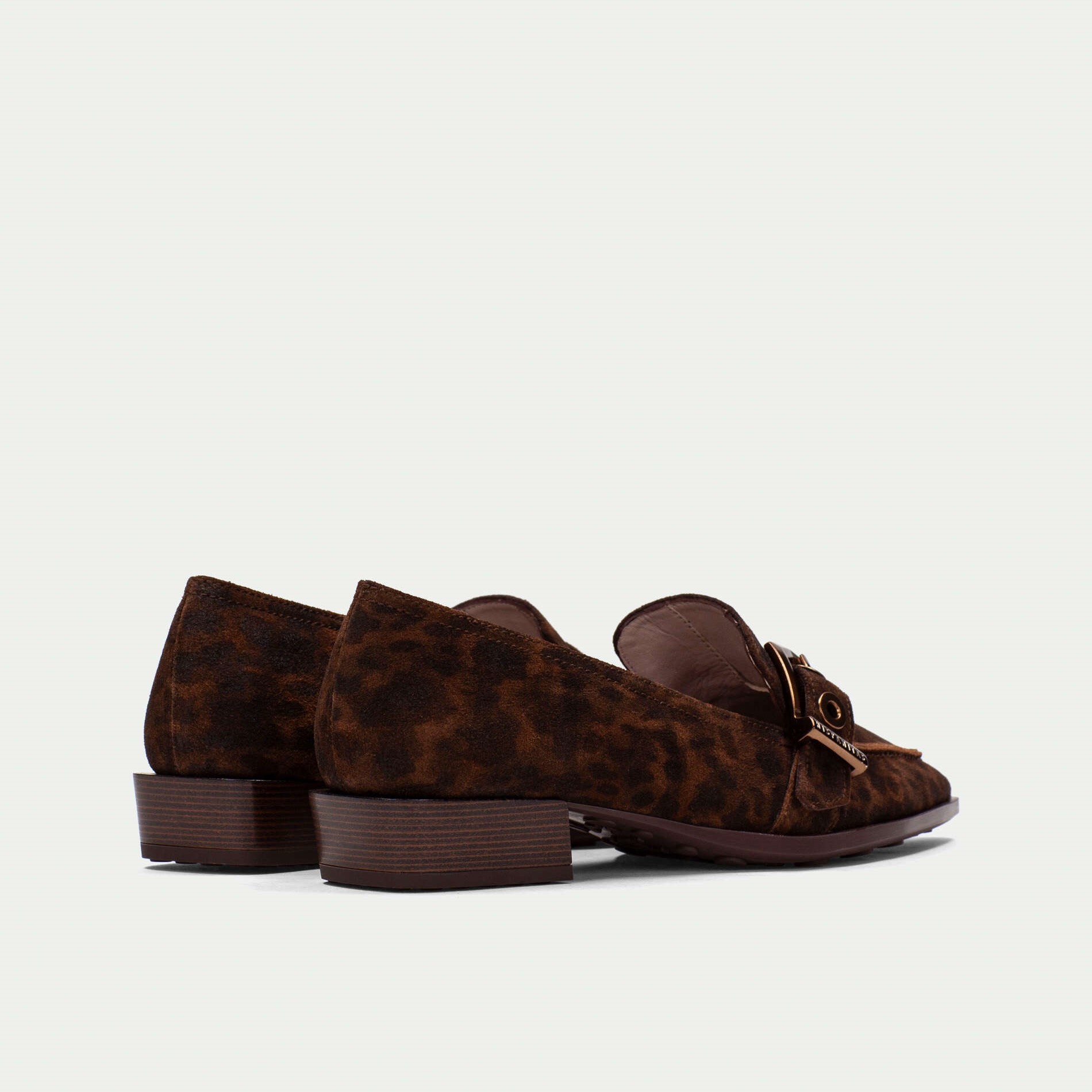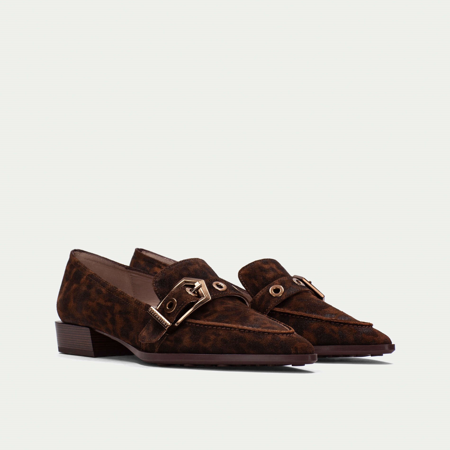 Hispanitas ravne cipele na špic u braon veluru sa diskretnim leopard printu i zlatnom mat šnalom