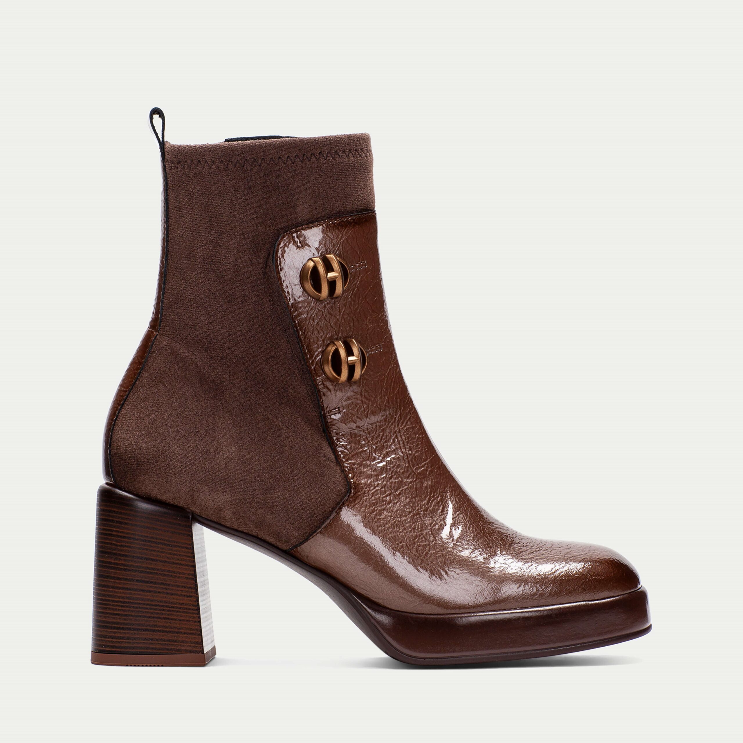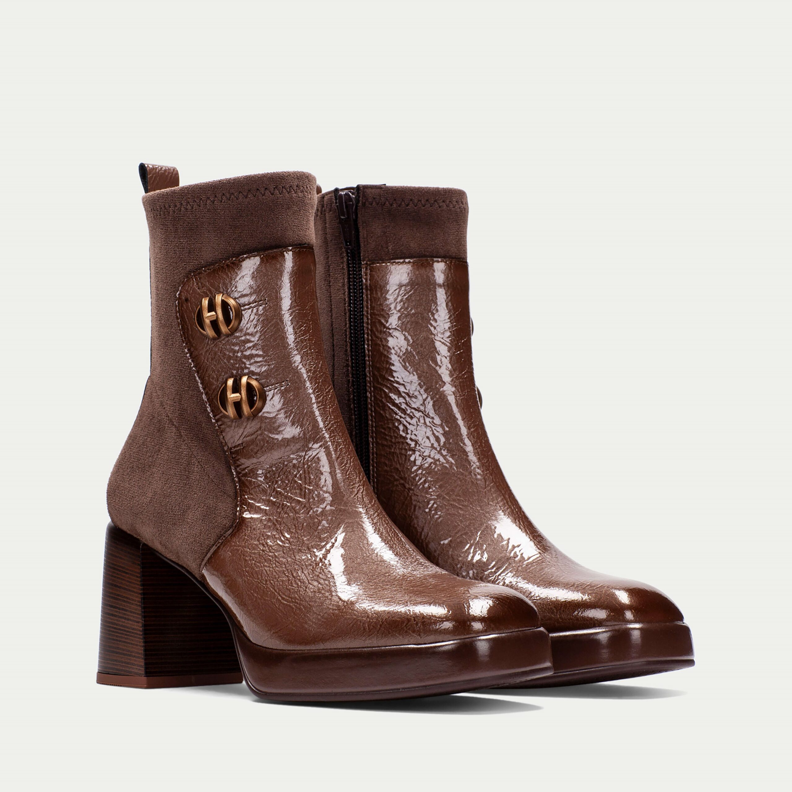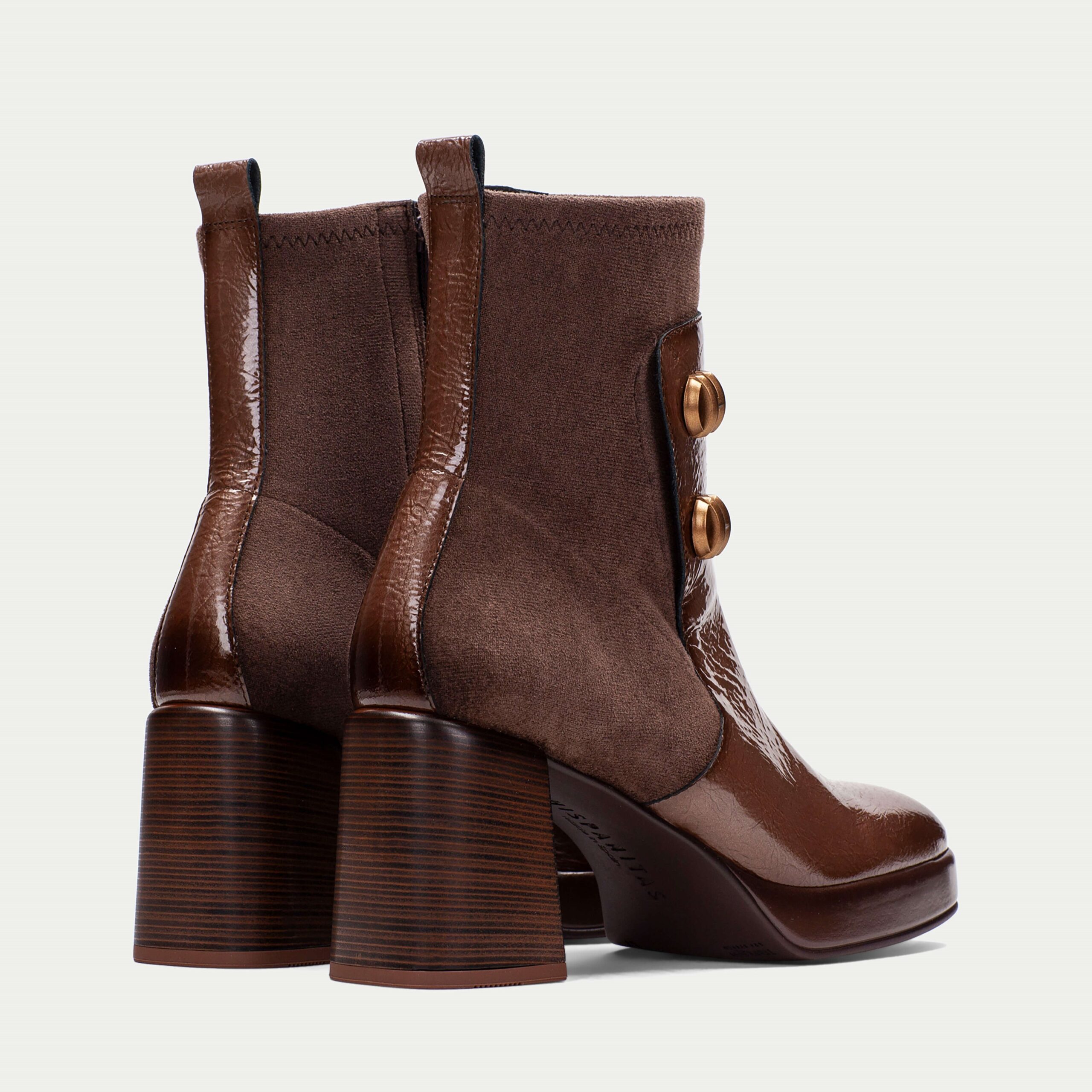 Hispanitas polu-čizme na punu petu, u braon lak boji i braon tekstilnim delom sa mat zlatnim ukrasima