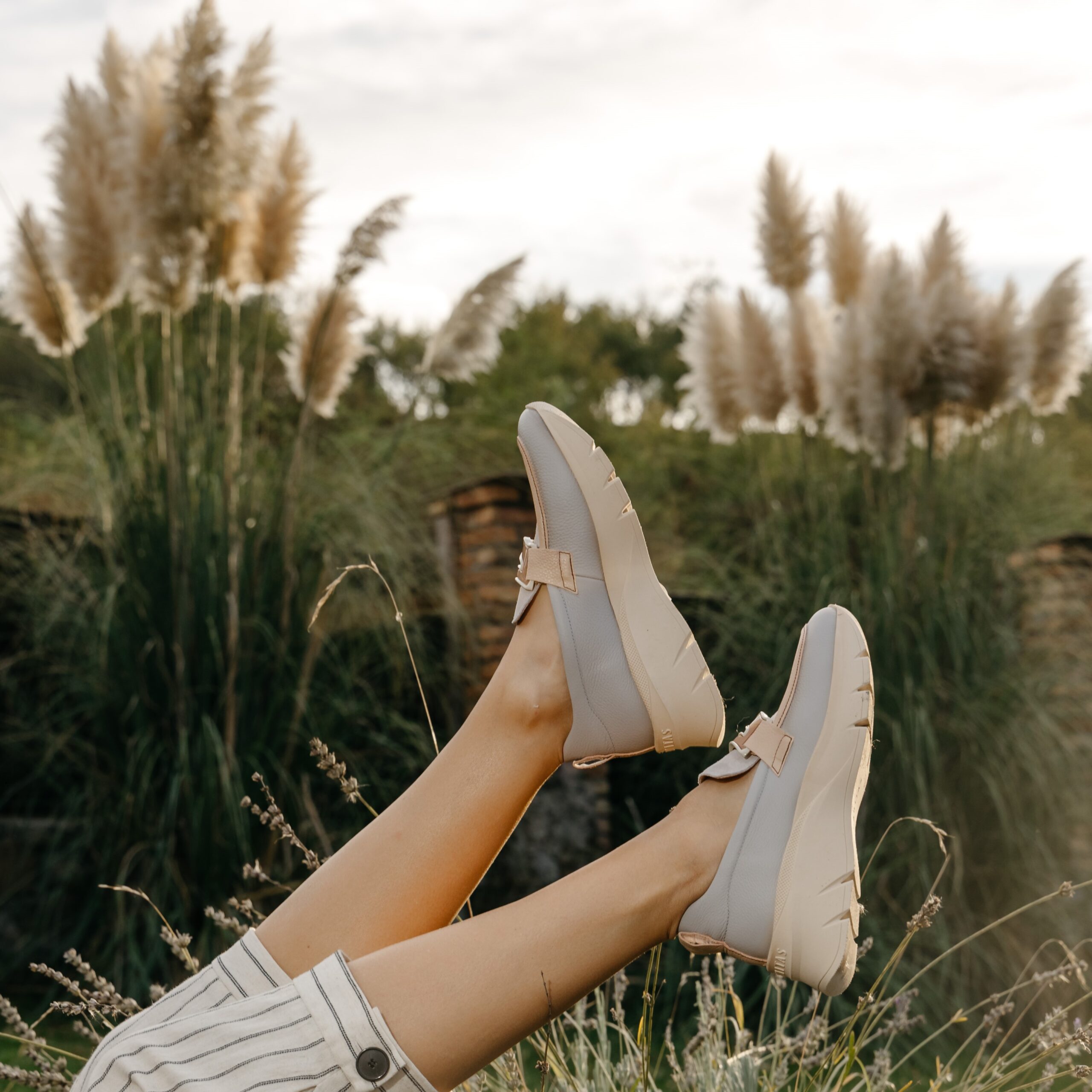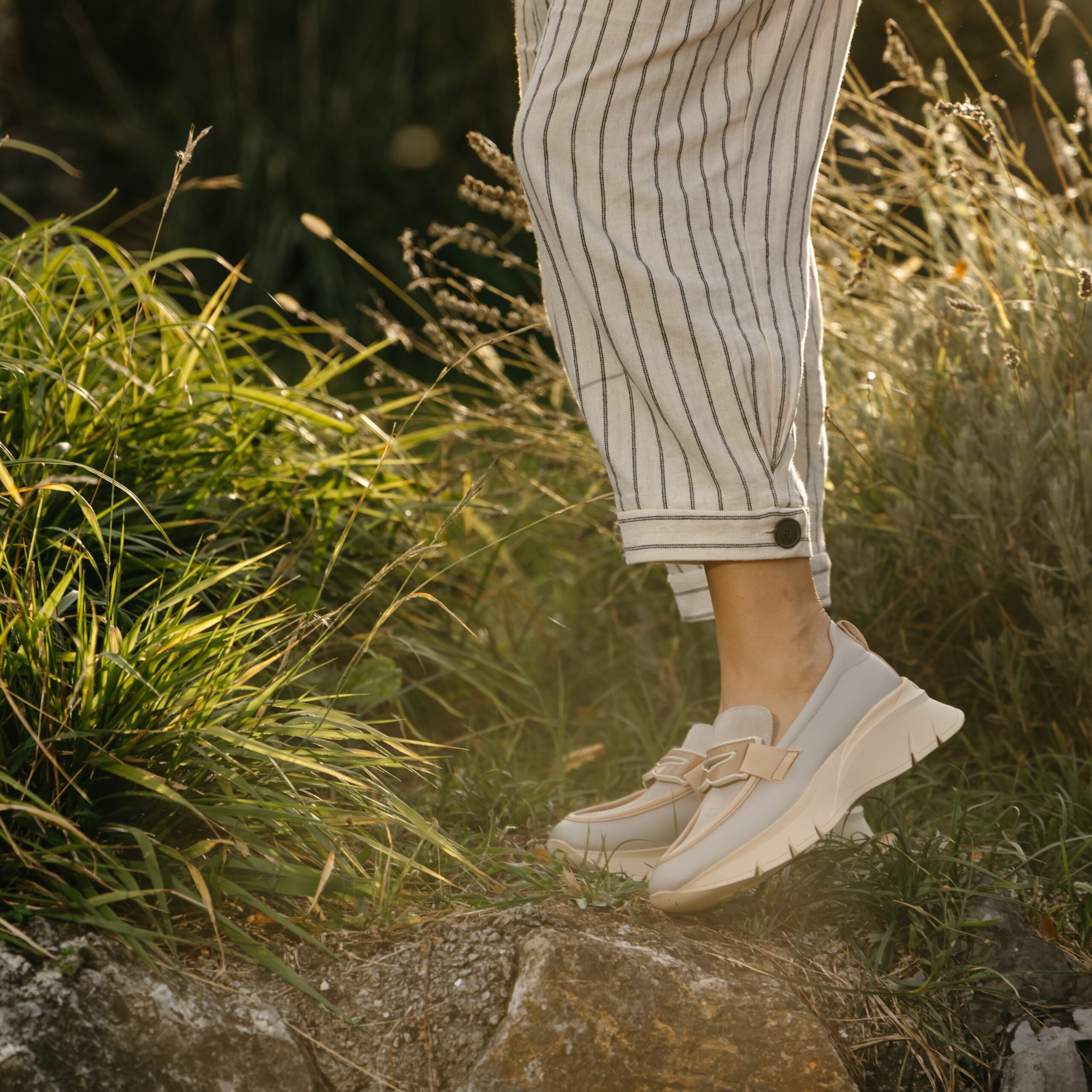 Hispanitas kožne mokasine u bež boji na krem đonu, u kombinaciji glatke i velur kože i sa bež šnalom.