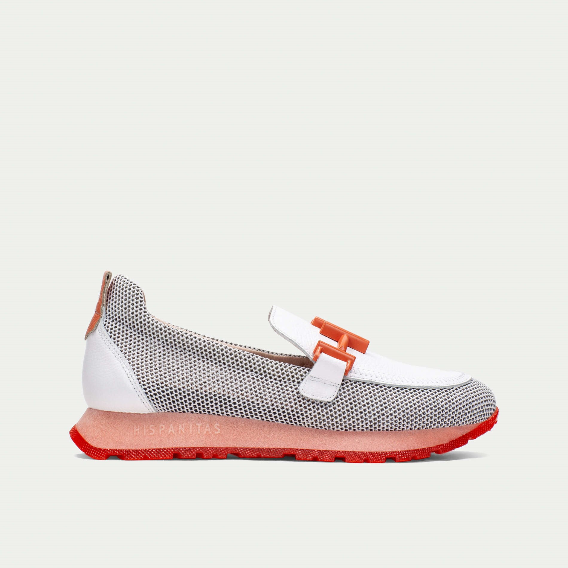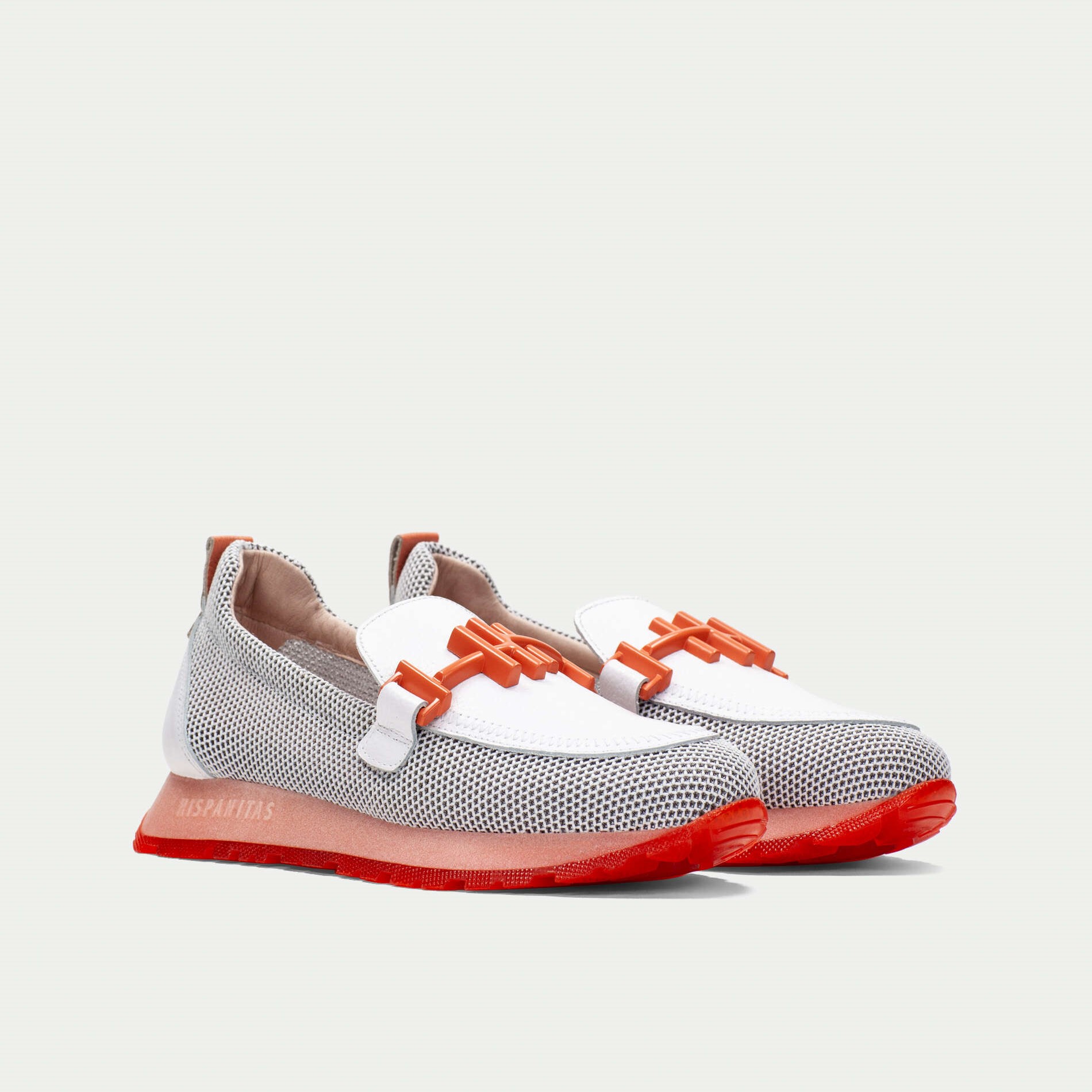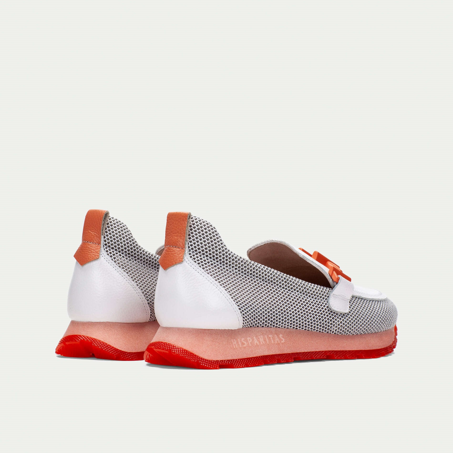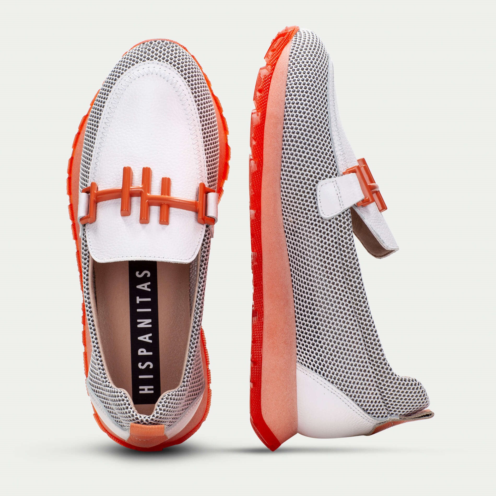 Hispanitas mokasine na manjem narandžastom preudobnom đonu sa belom mrežicom sa strane i narandžastom šnalom na risu.