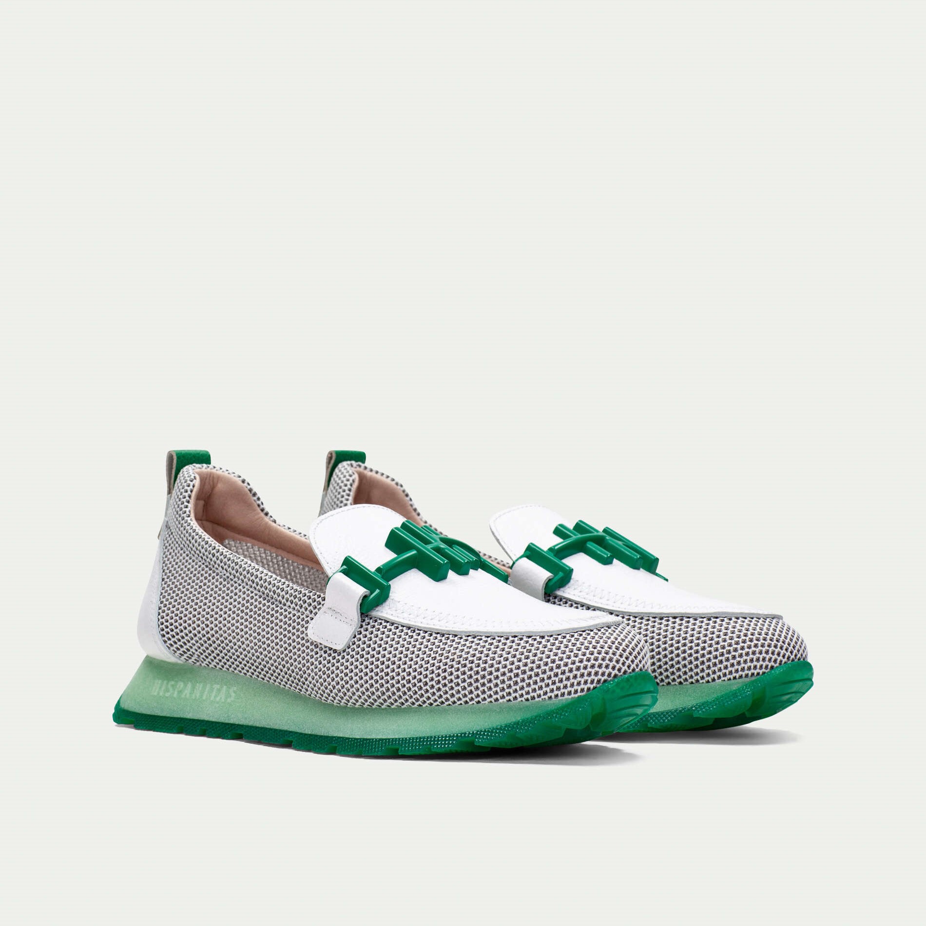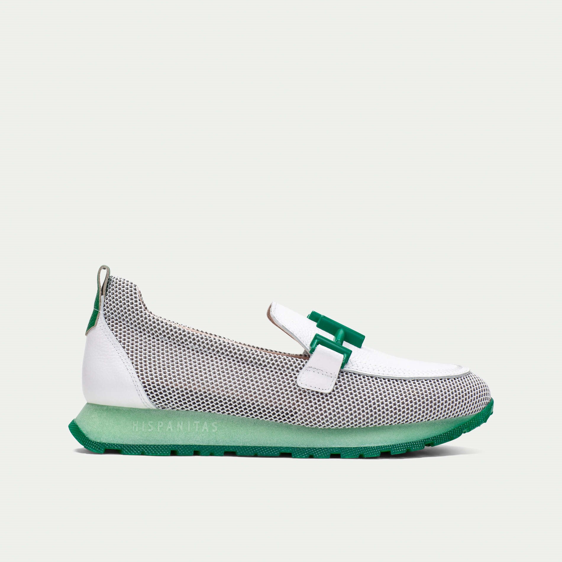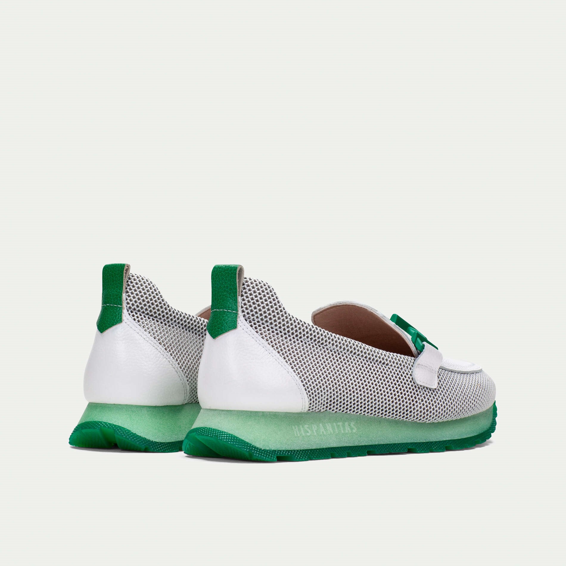 Hispanitas mokasine na manjem zelenom preudobnom đonu sa belom mrežicom sa strane i zelenom šnalom na risu.