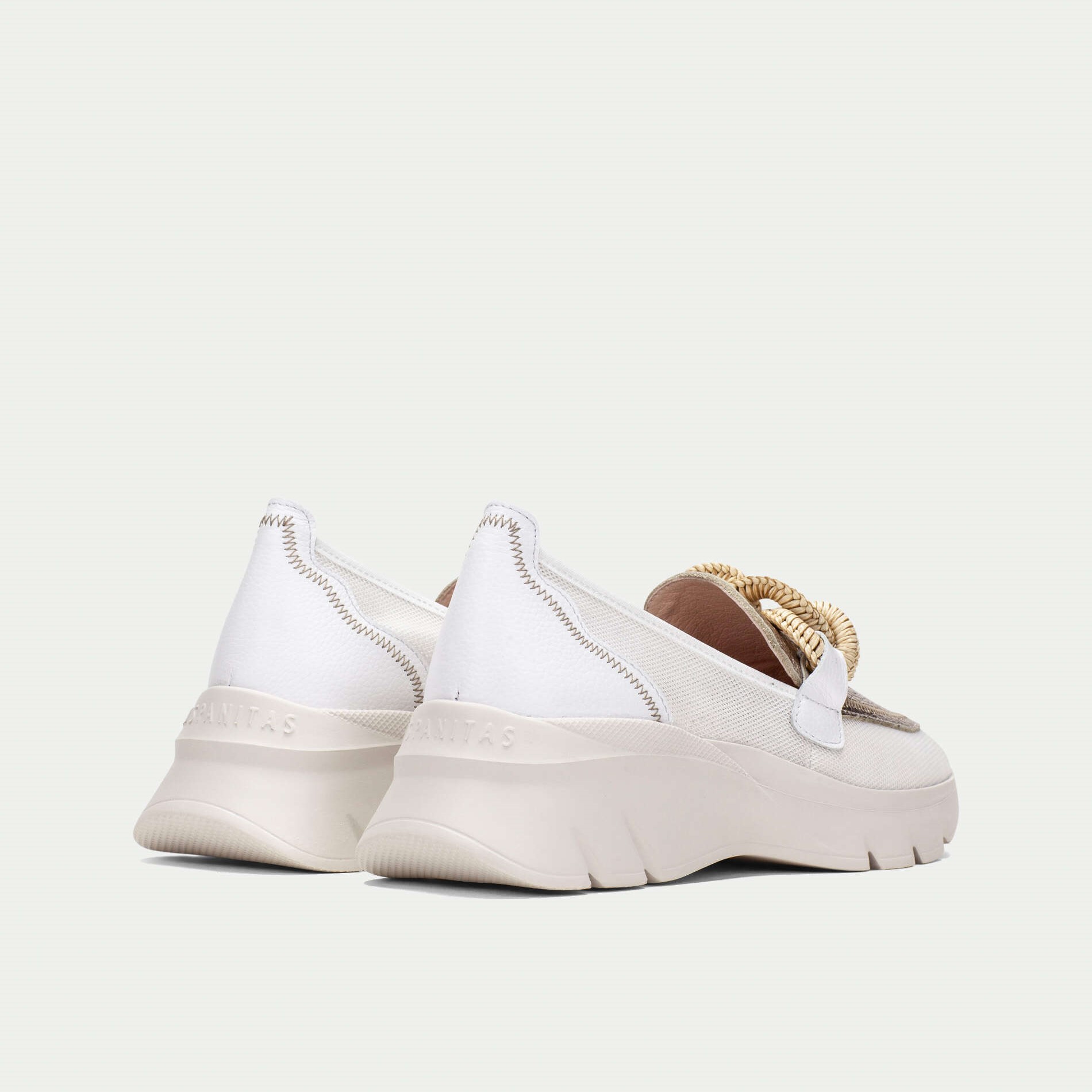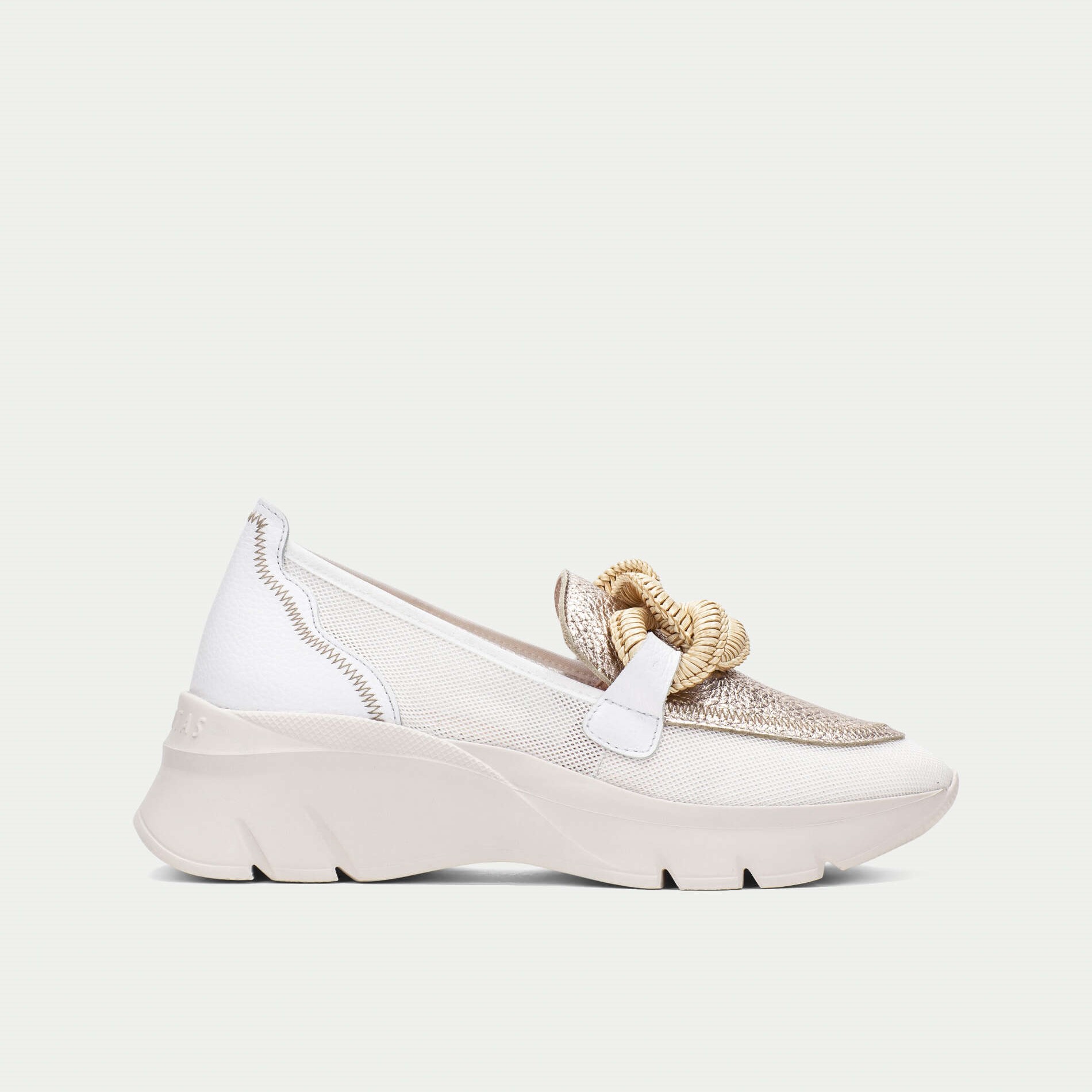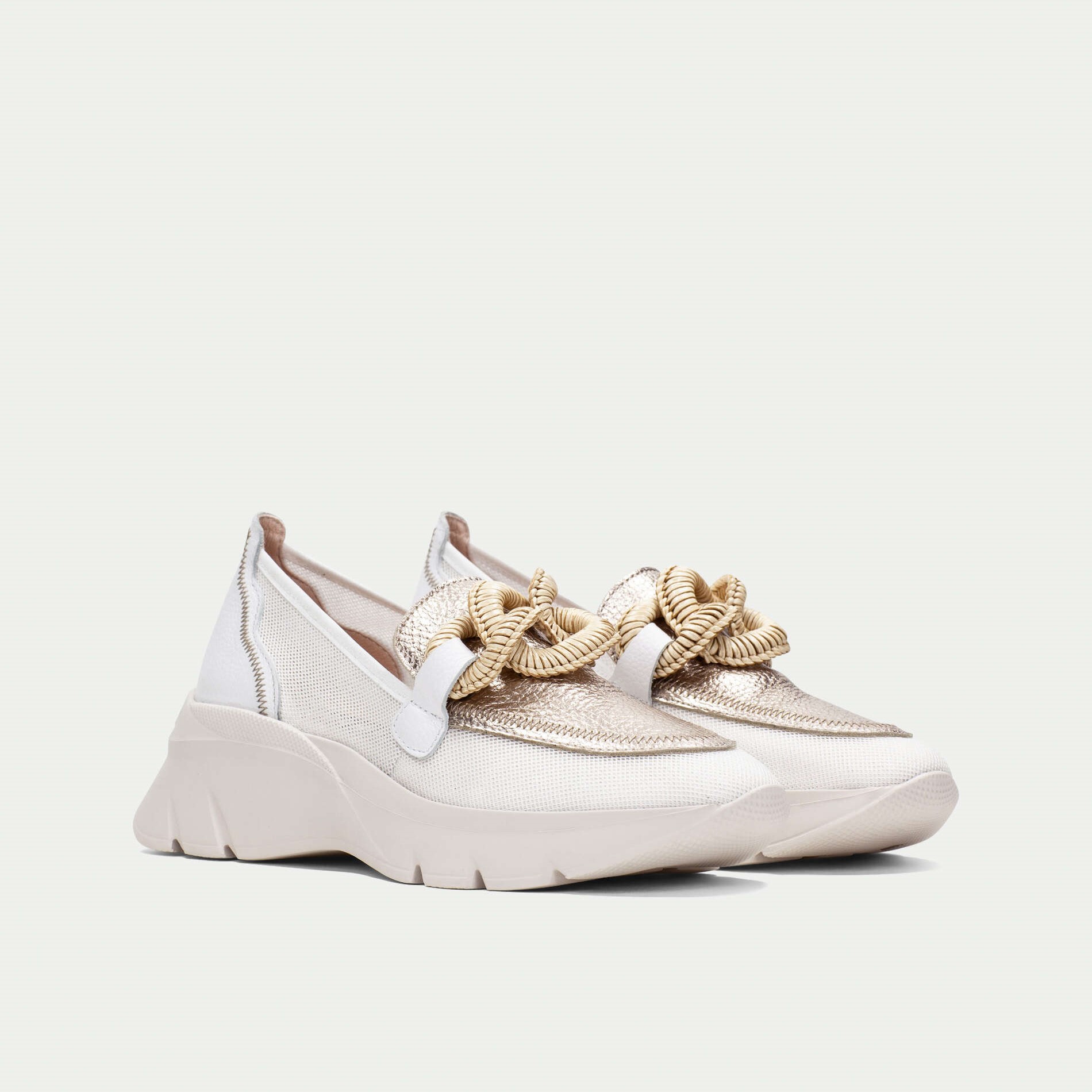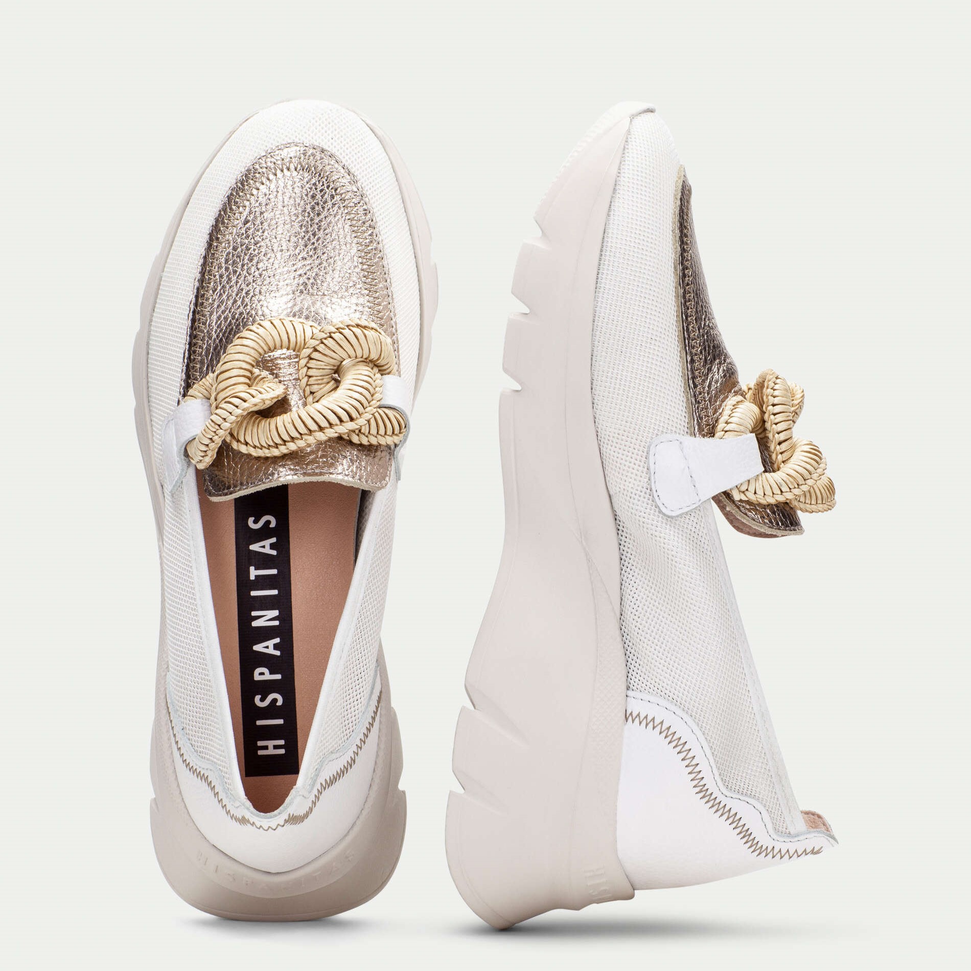 Hispanitas mokasine na većem đonu u kombinaciji bež i antico zlatne boje sa bež končanom šnalom na risu.