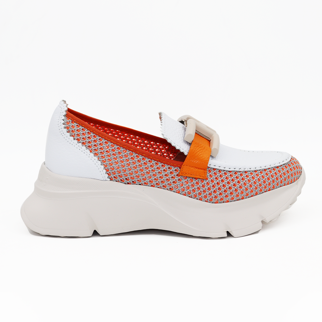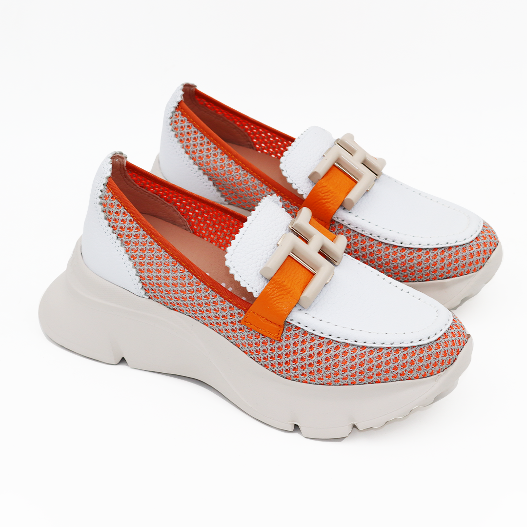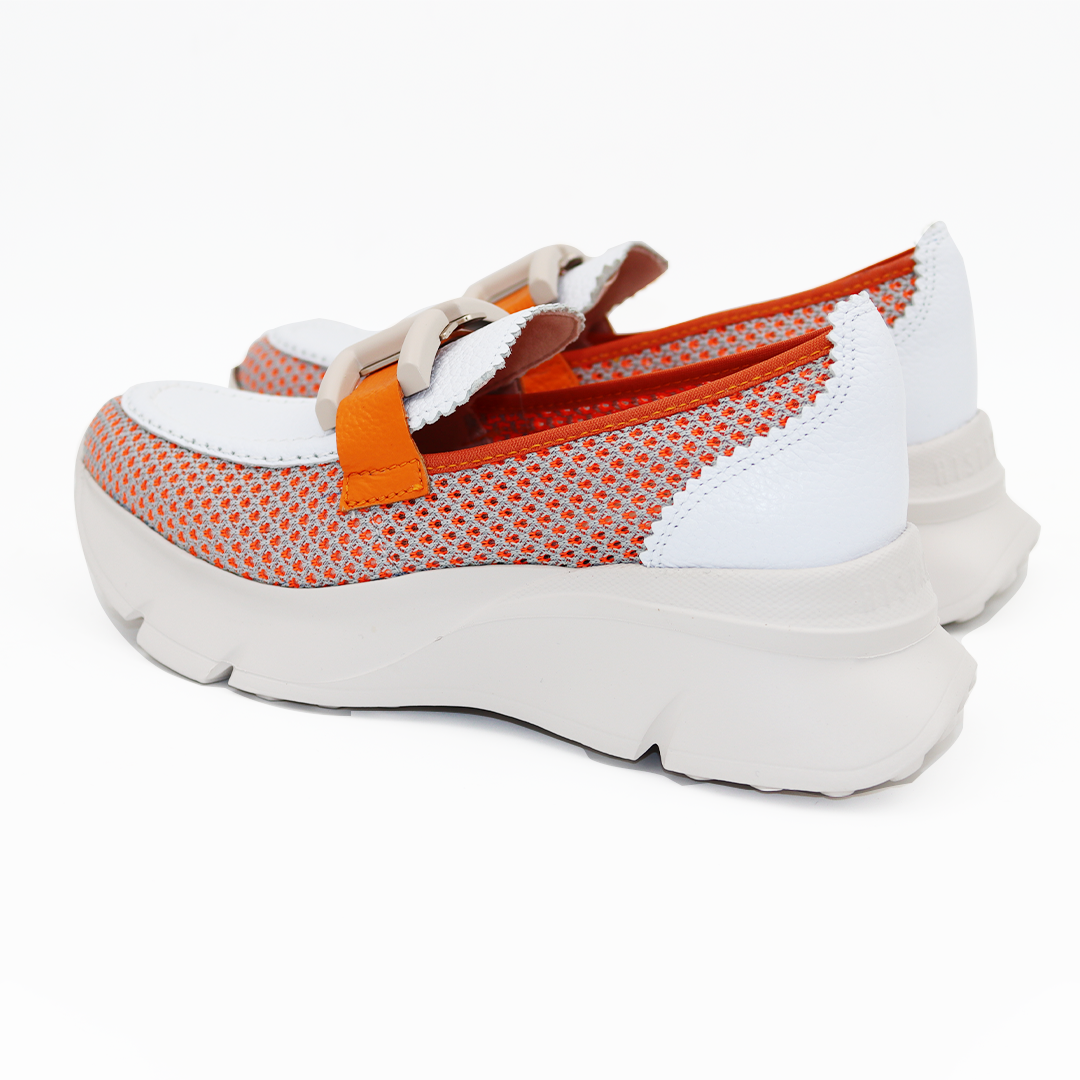 Hispanitas mokasine na većem sport đonu u kombinaciji bele kože i narandžaste mrežice sa belom šnalom na vrhu, vrlo udobne.