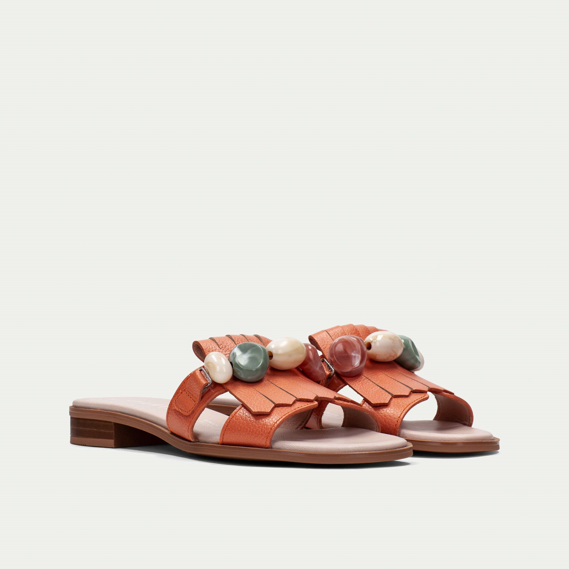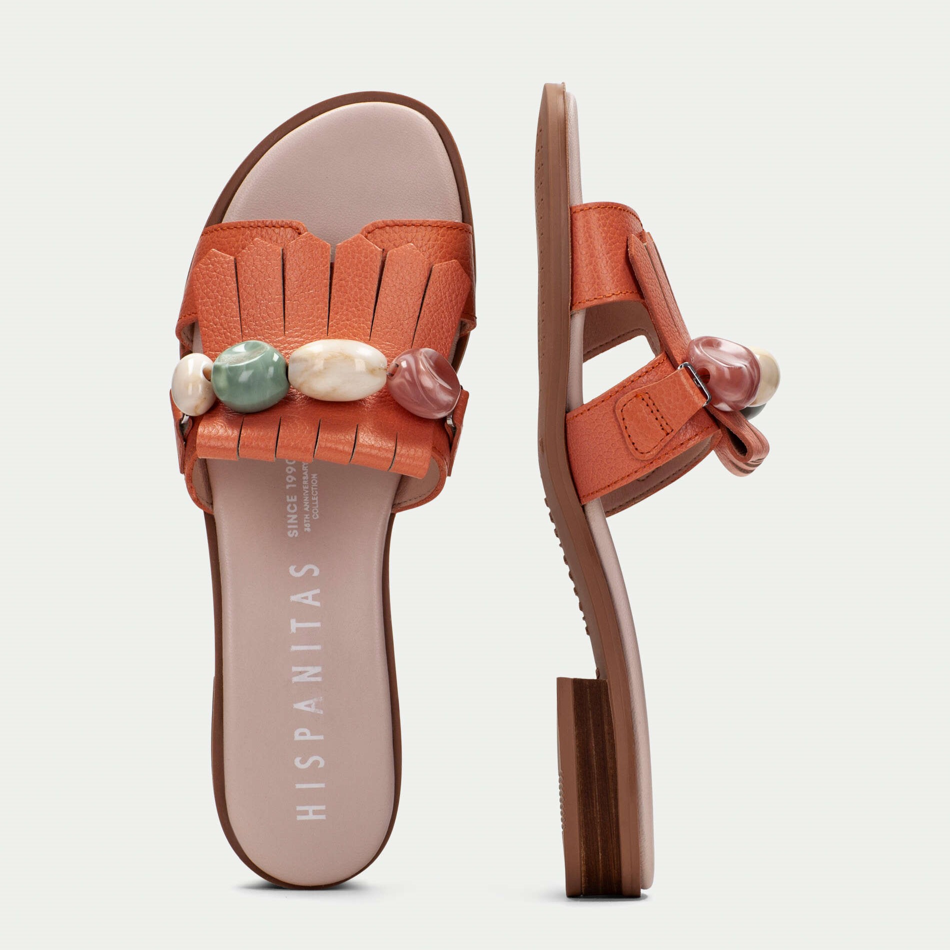 Hispanitas kožne papuče u pastelno narandžastoj boji sa resama i dekorativnom šnalom od raznobojnih kamenčića