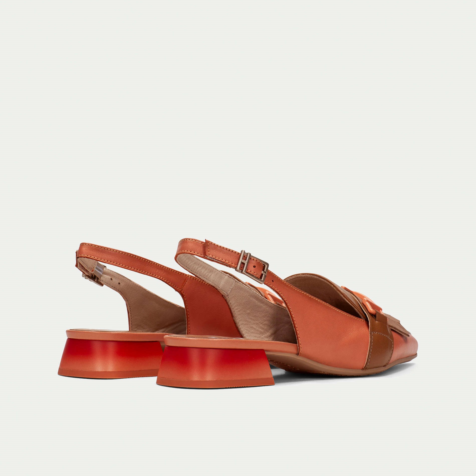 Hispanitas kožne sandalete na maloj potpetici u kombinaciji pastelno narandžaste, kamel i bež boje sa resama na špicu.