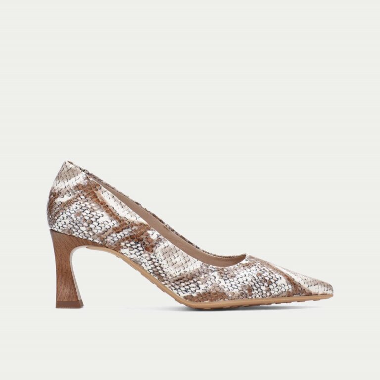 Hispanitas sandalete na srednju punu petu u pastelno narandžastoj boji sa bež kožom preko zaobljenog vrha i dekorativnom multikolor šnalom od kamenčića