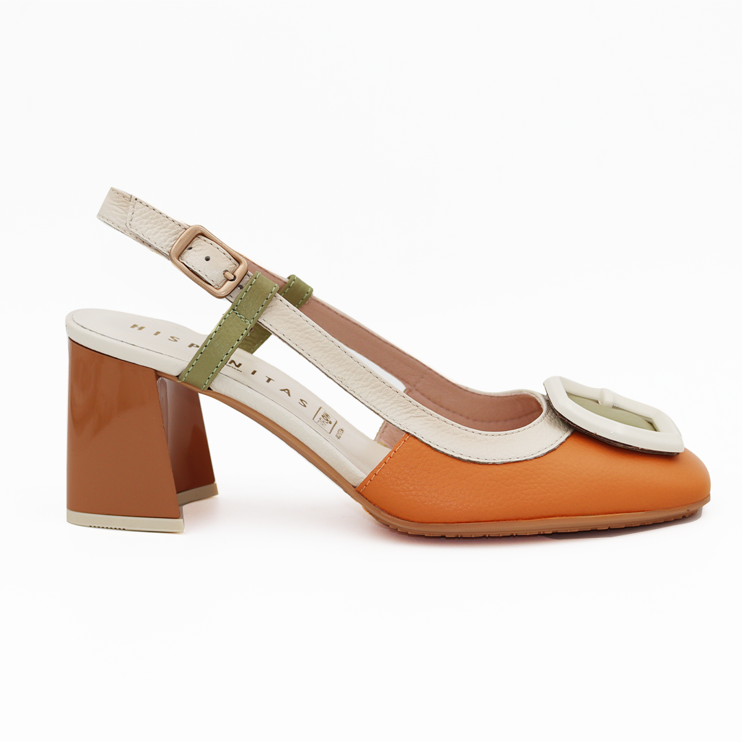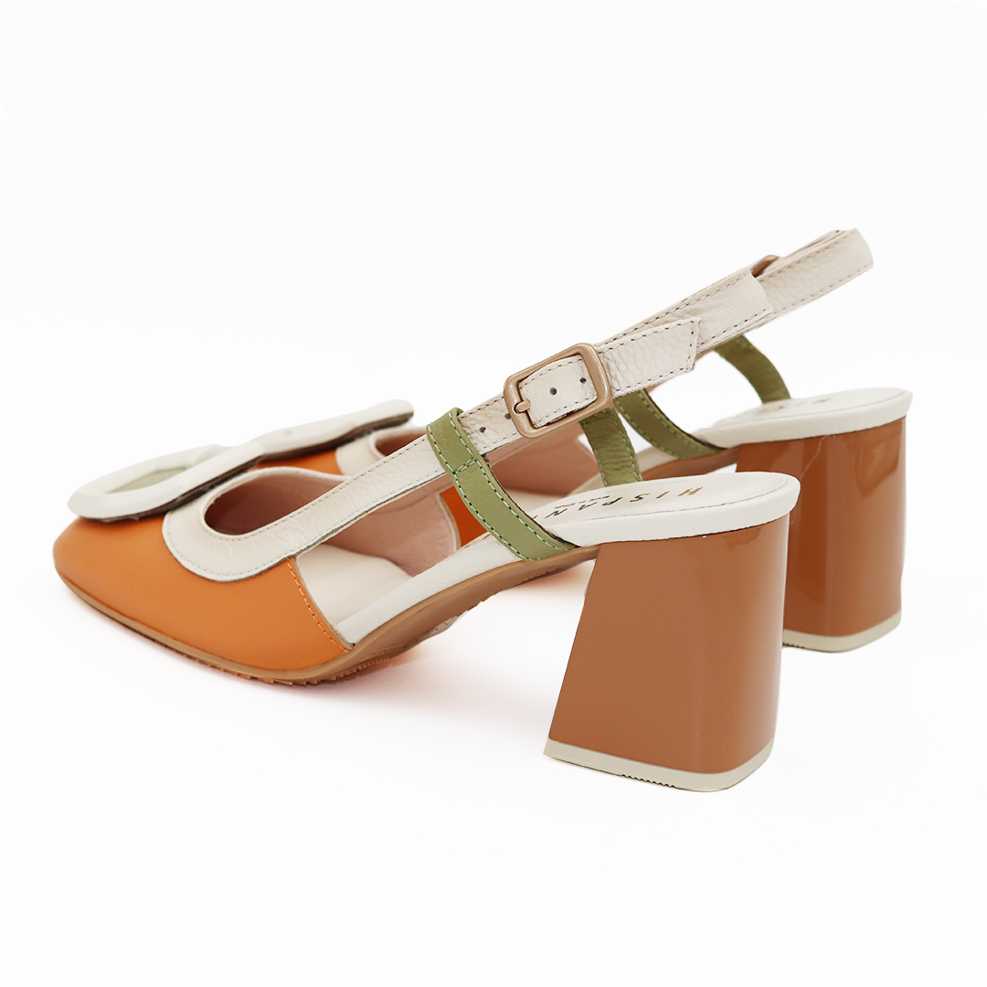 Hispanitas udobne bež-narandžaste kožne sandalete na braon punoj stabilnoj peti od 7cm i sa dekorativnom bež-zelenom šnalom na zaobljenom vrhu.