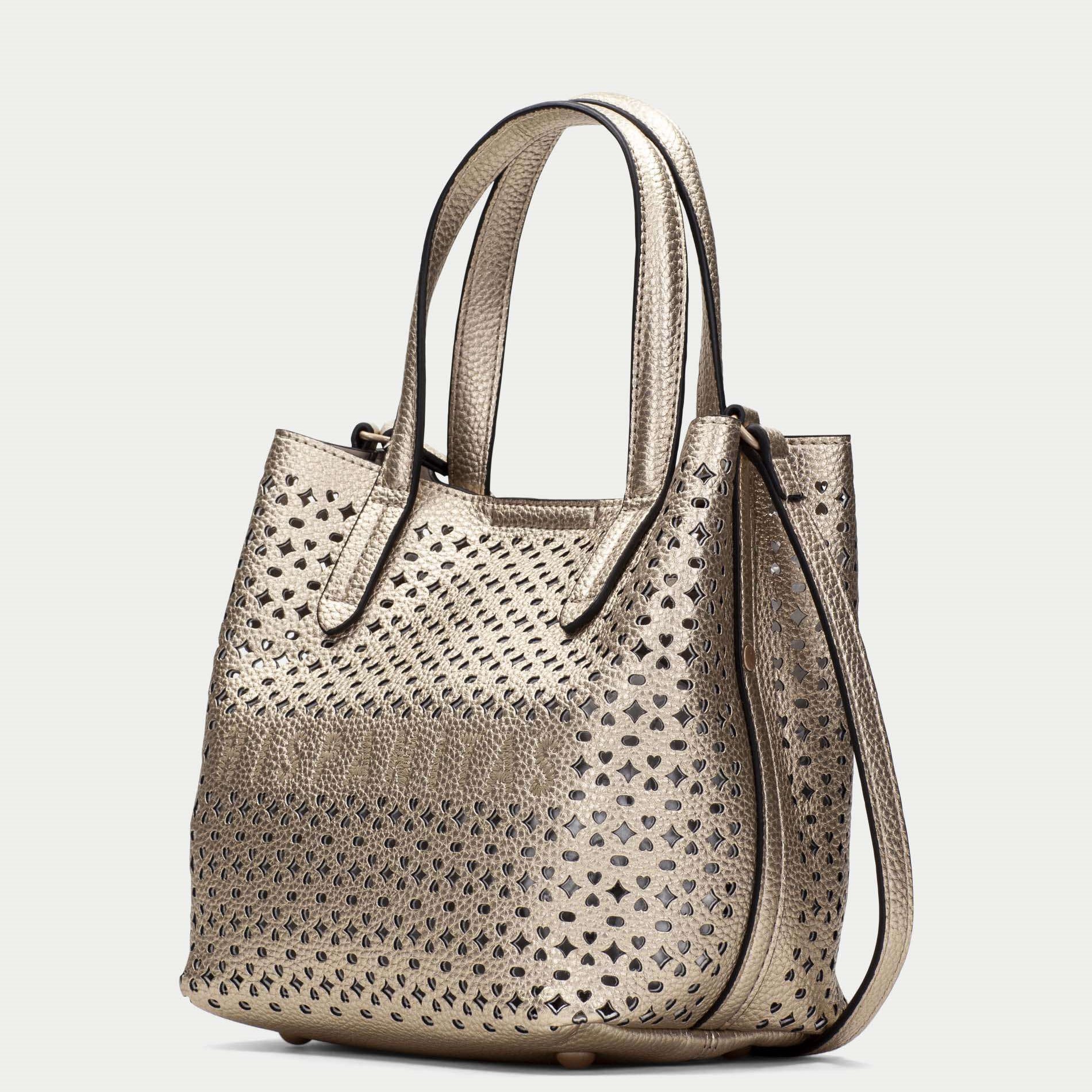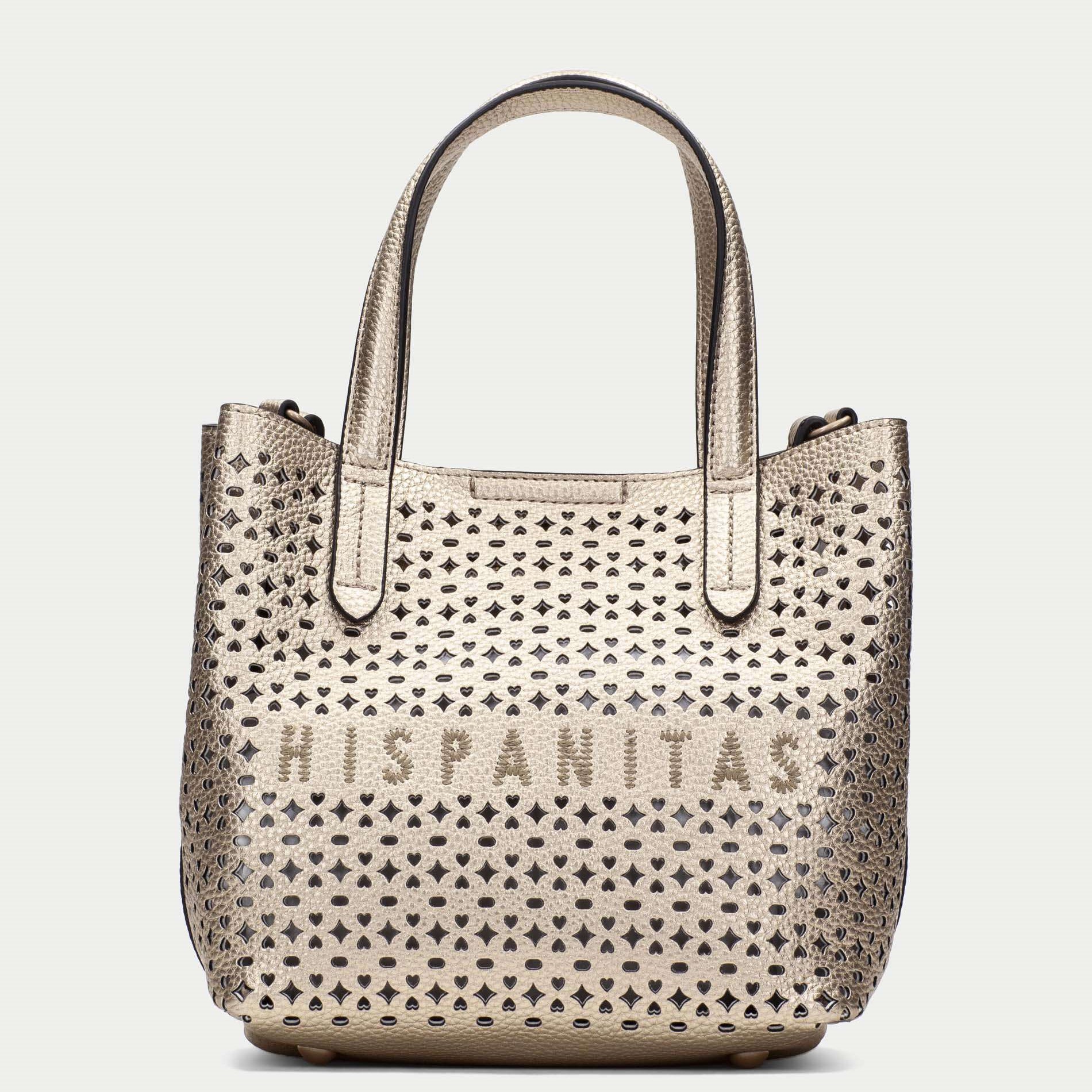 Hispanitas torba u rupičastom materijalu u zlatnoj boji.