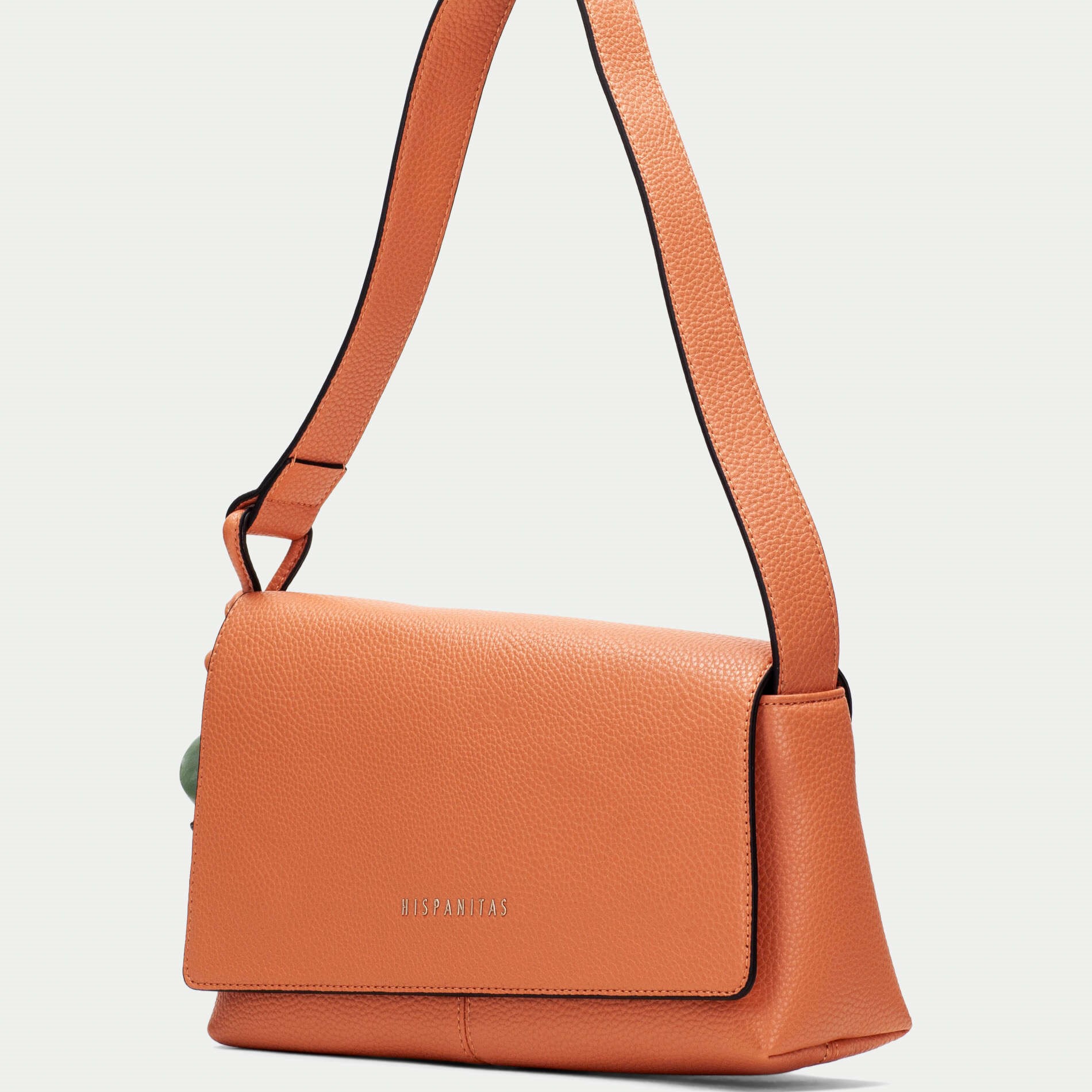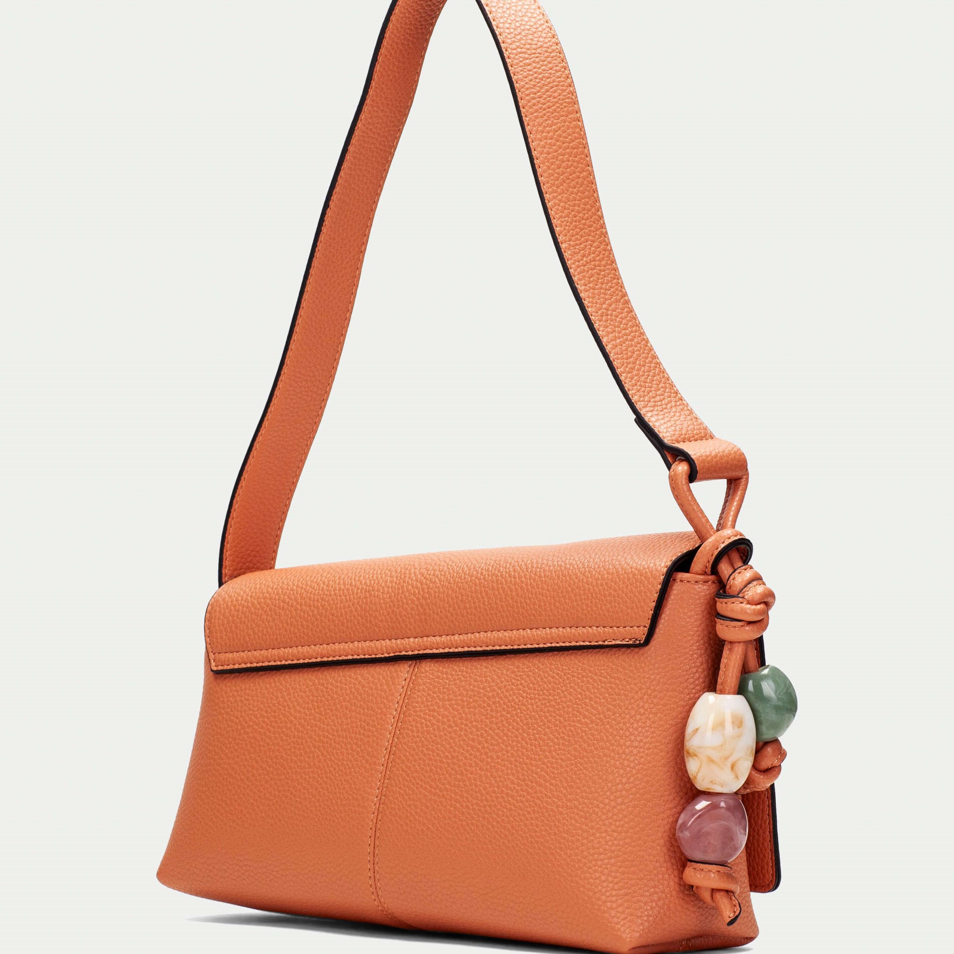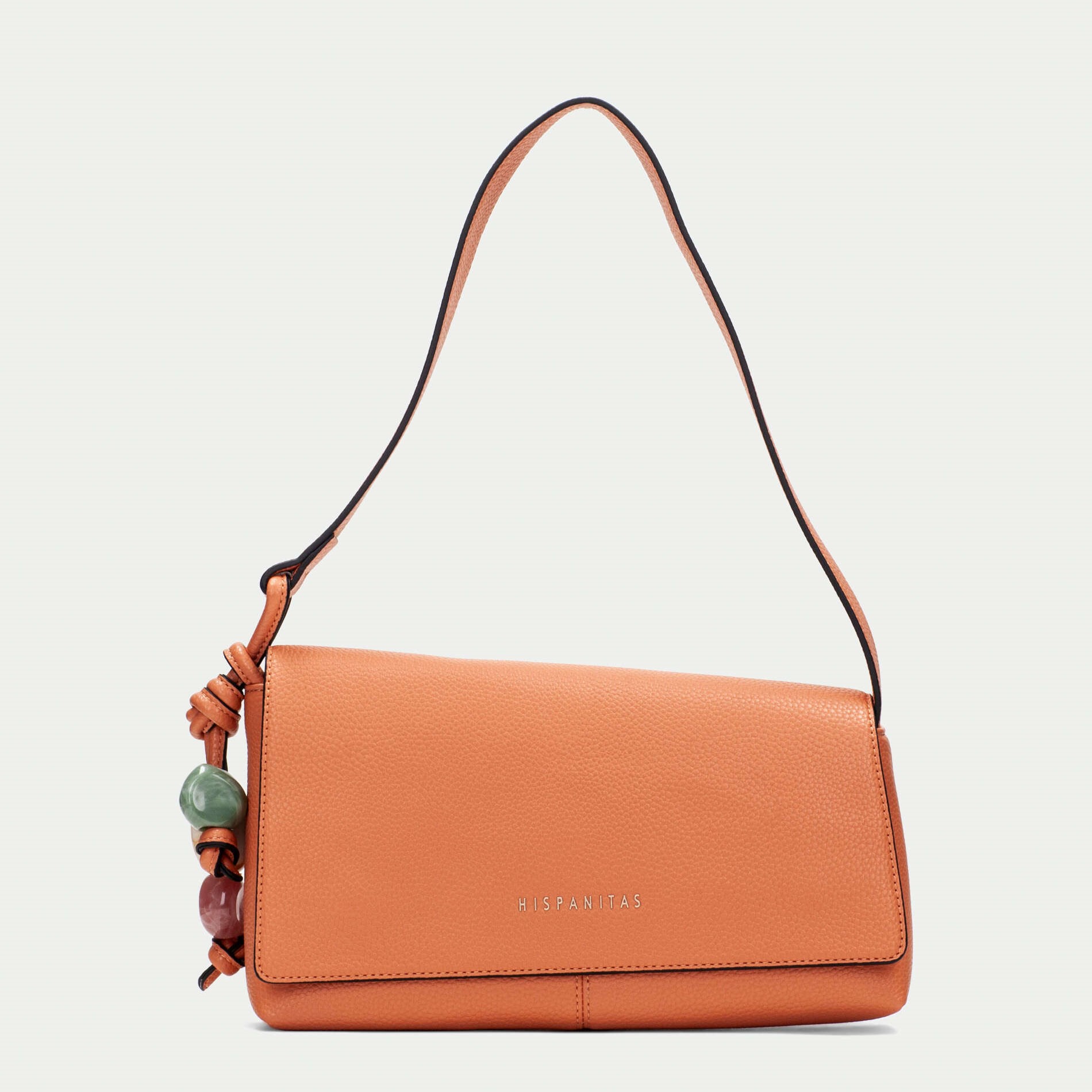 Hispanitas torba asimetričnog oblika u pastelno narandžastoj boji sa kićankama od kamenčića sa strane.