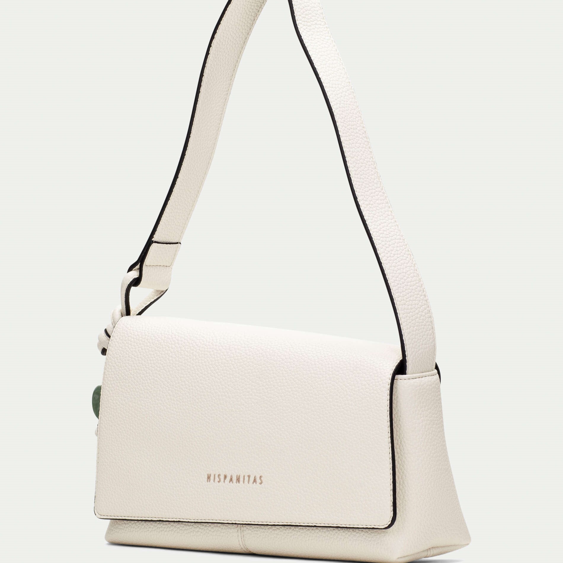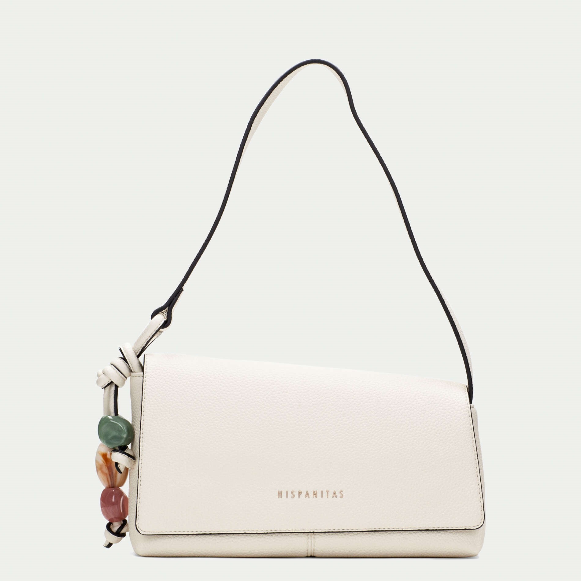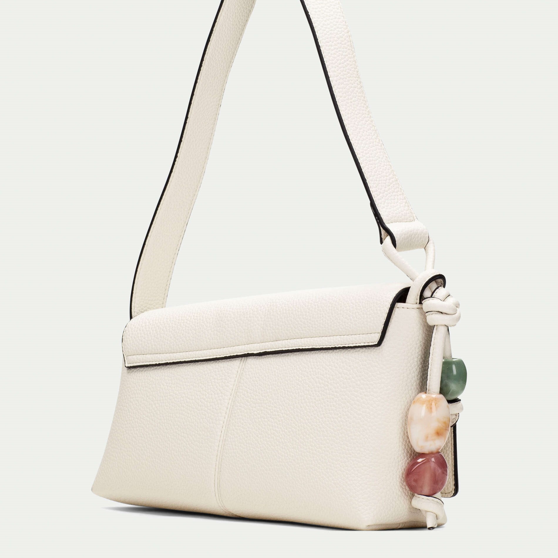 Hispanitas torba asimetričnog oblika u bež boji sa kićankama od kamenčića sa strane.