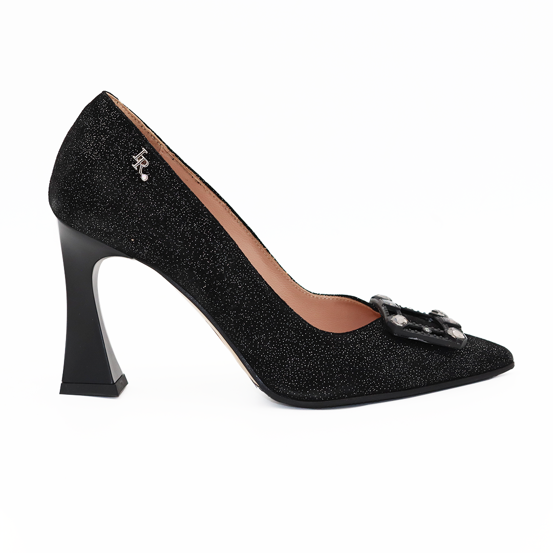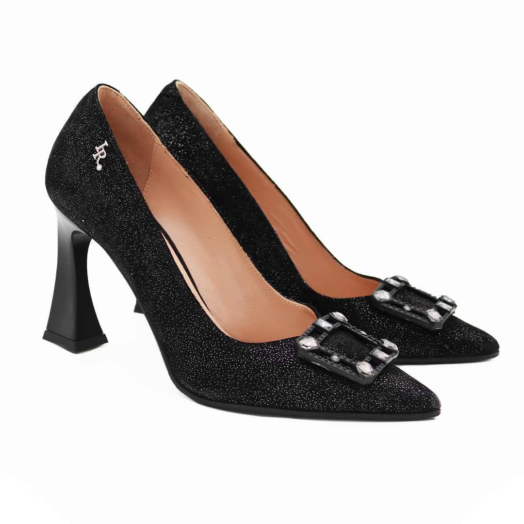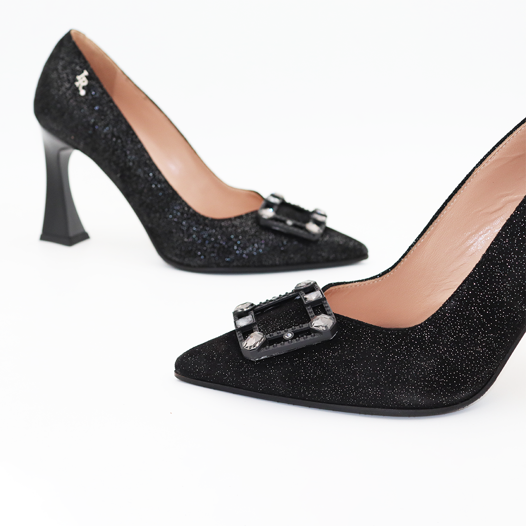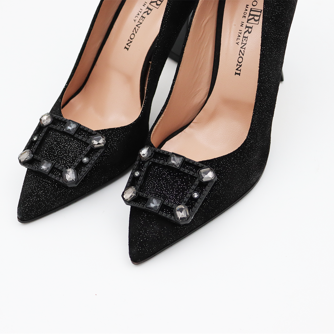 Ilasio Renzoni italijanske ručno izrađene kožne crne cipele na špic sa potpeticom od 9 cm, kristalom šnalom i diskretnim srebrnim sjajem u koži.