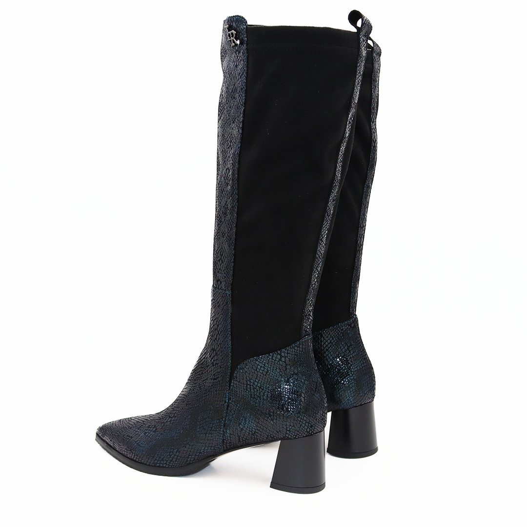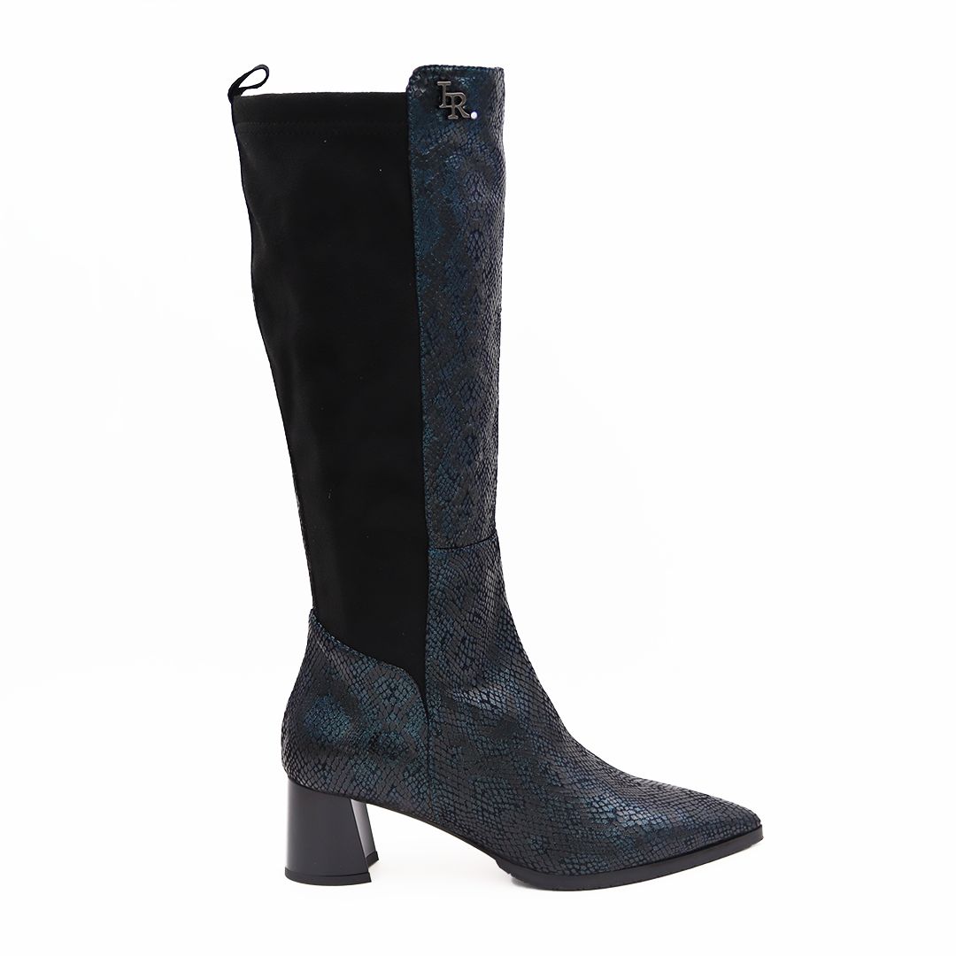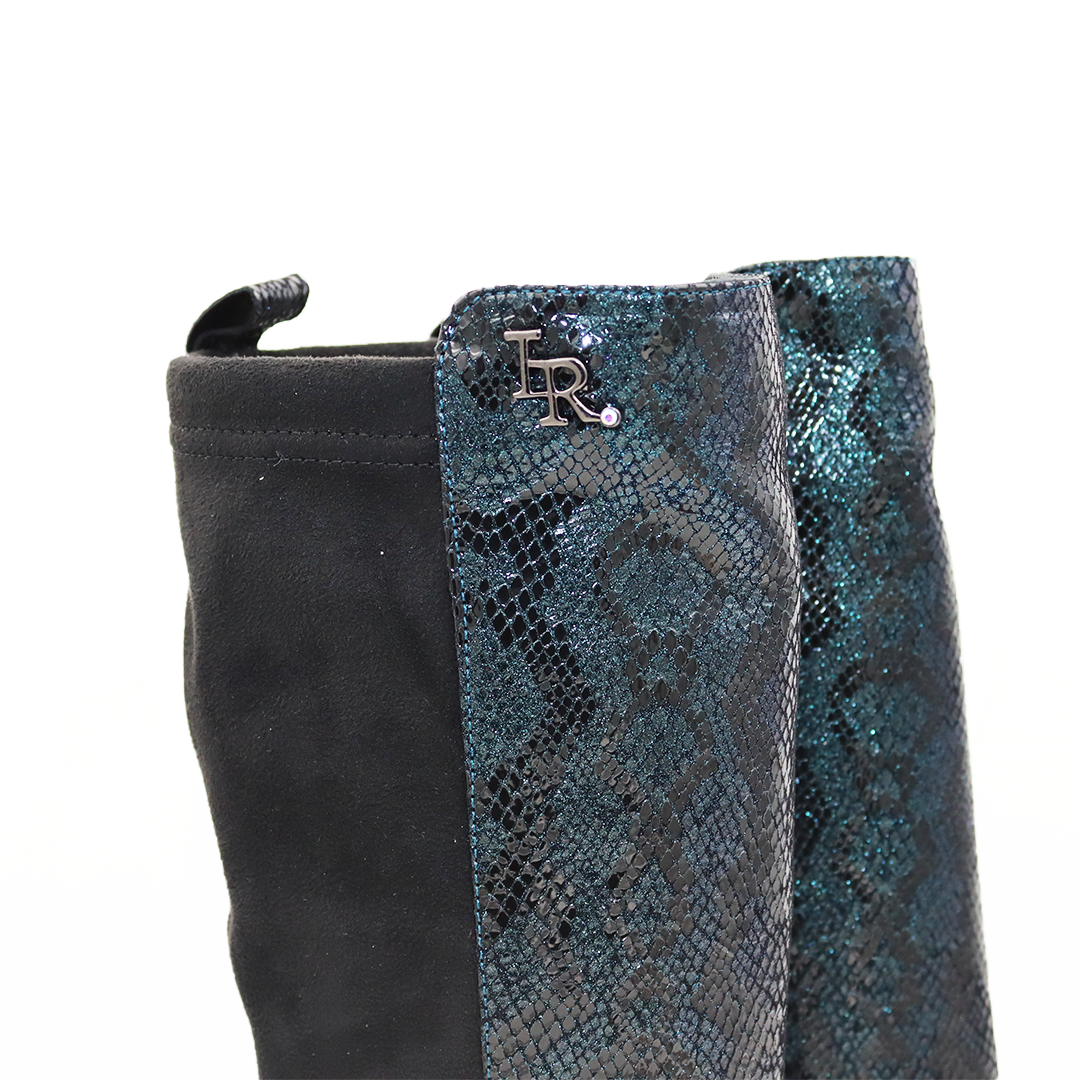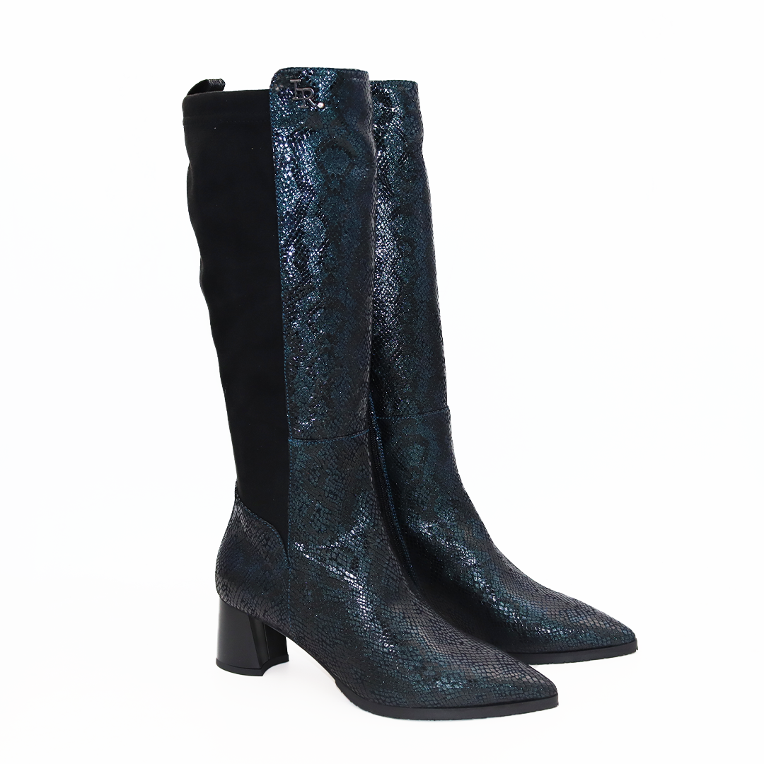 Ilasio Renzoni kožne italijanske ručno-izrađene čizme do kolena u teget zmijskom dezenu, na špic i srednju stabilnu potpeticu. Model ima velur kožu na listu pa je pogodan za sve širine noge.
