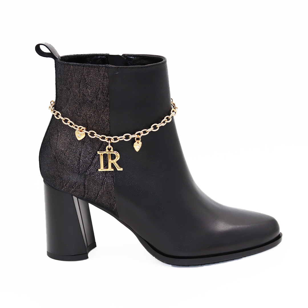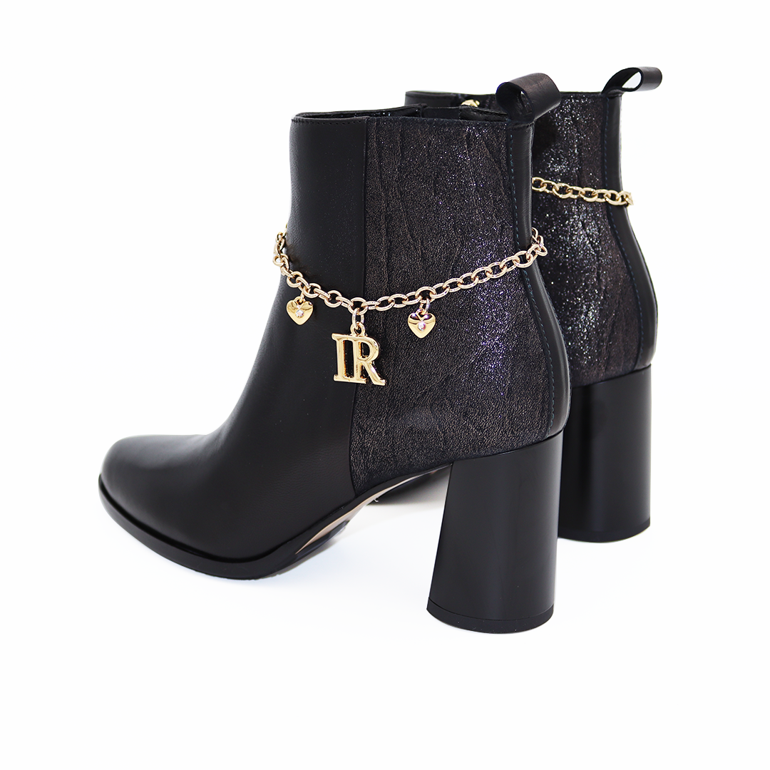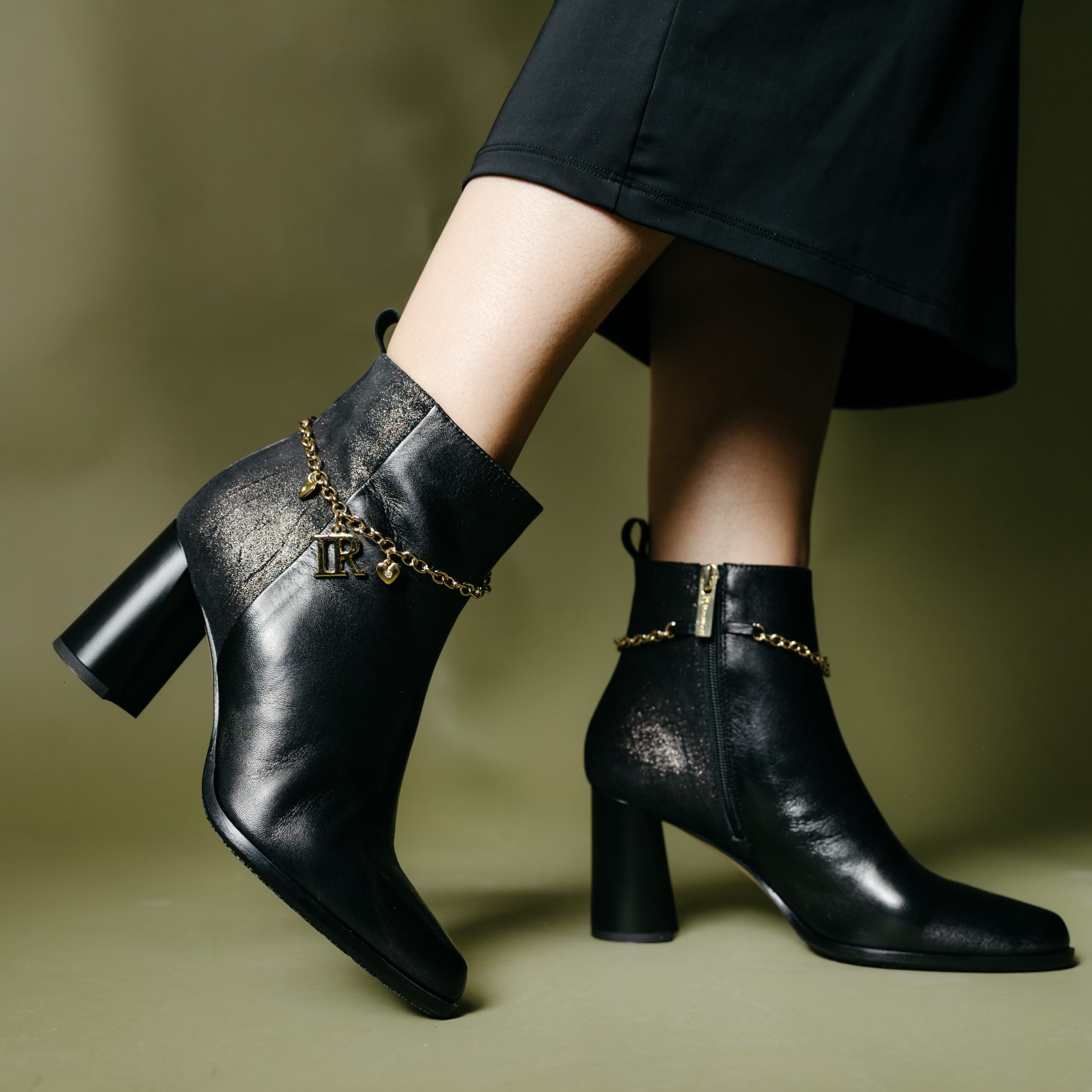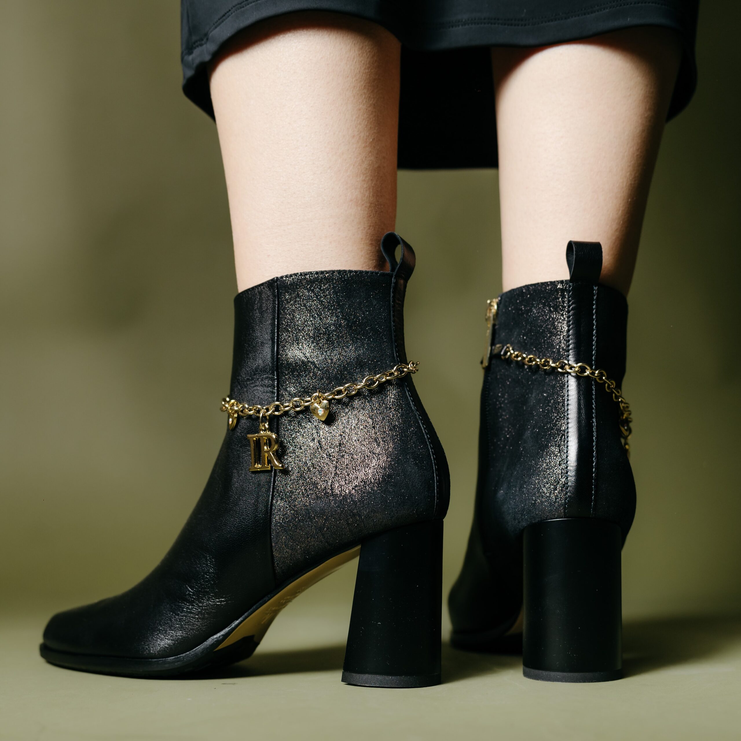 Ilasio Renzoni italijanske kožne crne gležnjače na potpetici od 9 cm sa zlatnim Renzoni lančićem sa cirkonima i unikatnim diskrentnim dezenom na koži na peti.