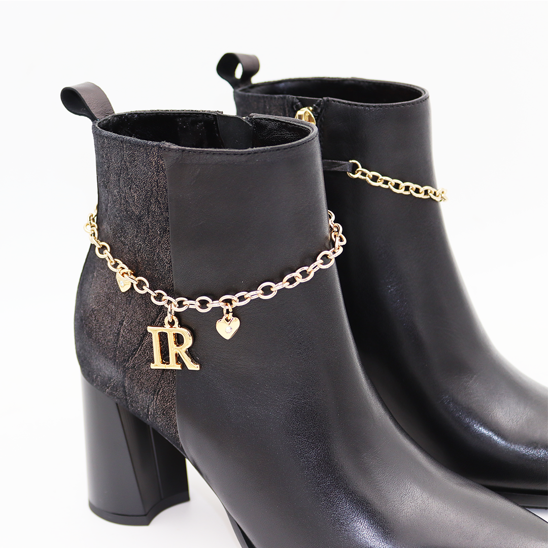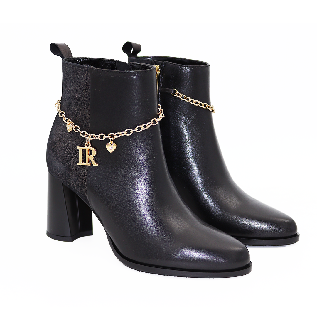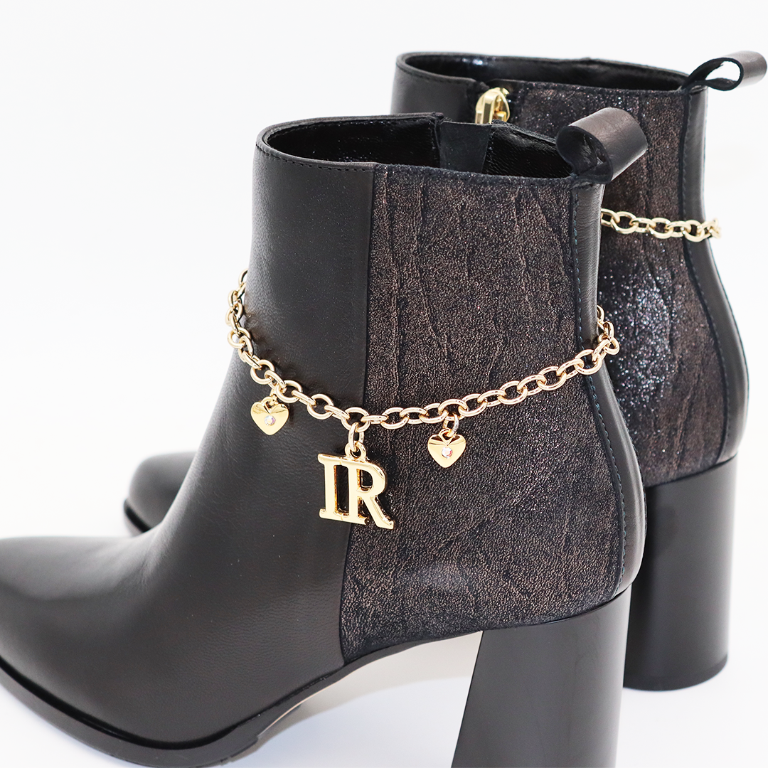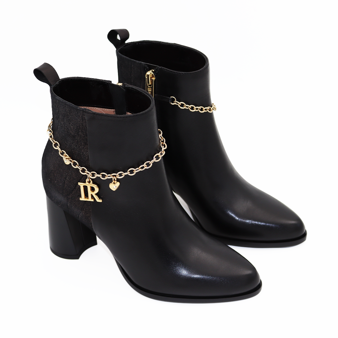 Ilasio Renzoni italijanske kožne crne gležnjače na potpetici od 9 cm sa zlatnim Renzoni lančićem sa cirkonima i unikatnim diskrentnim dezenom na koži na peti.