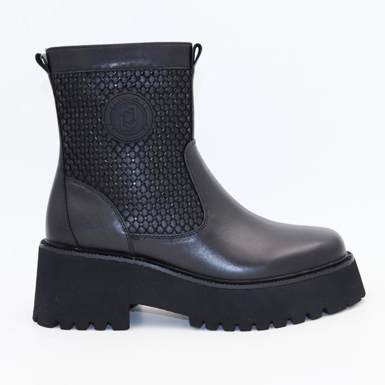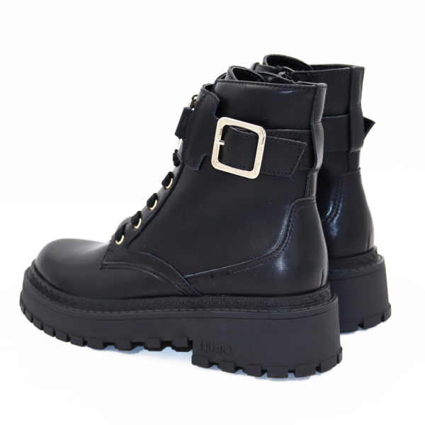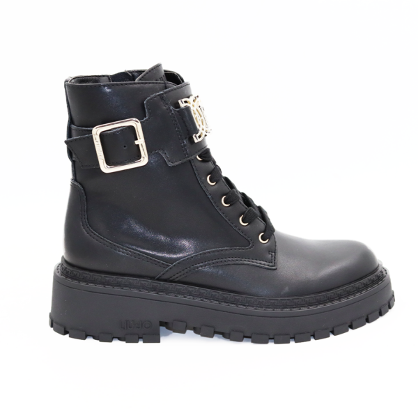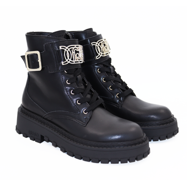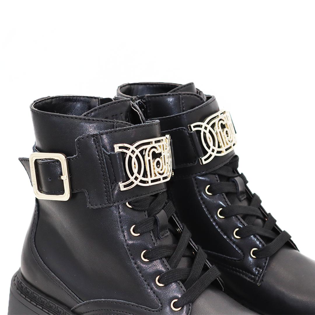Liu Jo Crne gležnjače na pertlanje sa zlatnom Liu Jo lanac šnalom na vrhu.