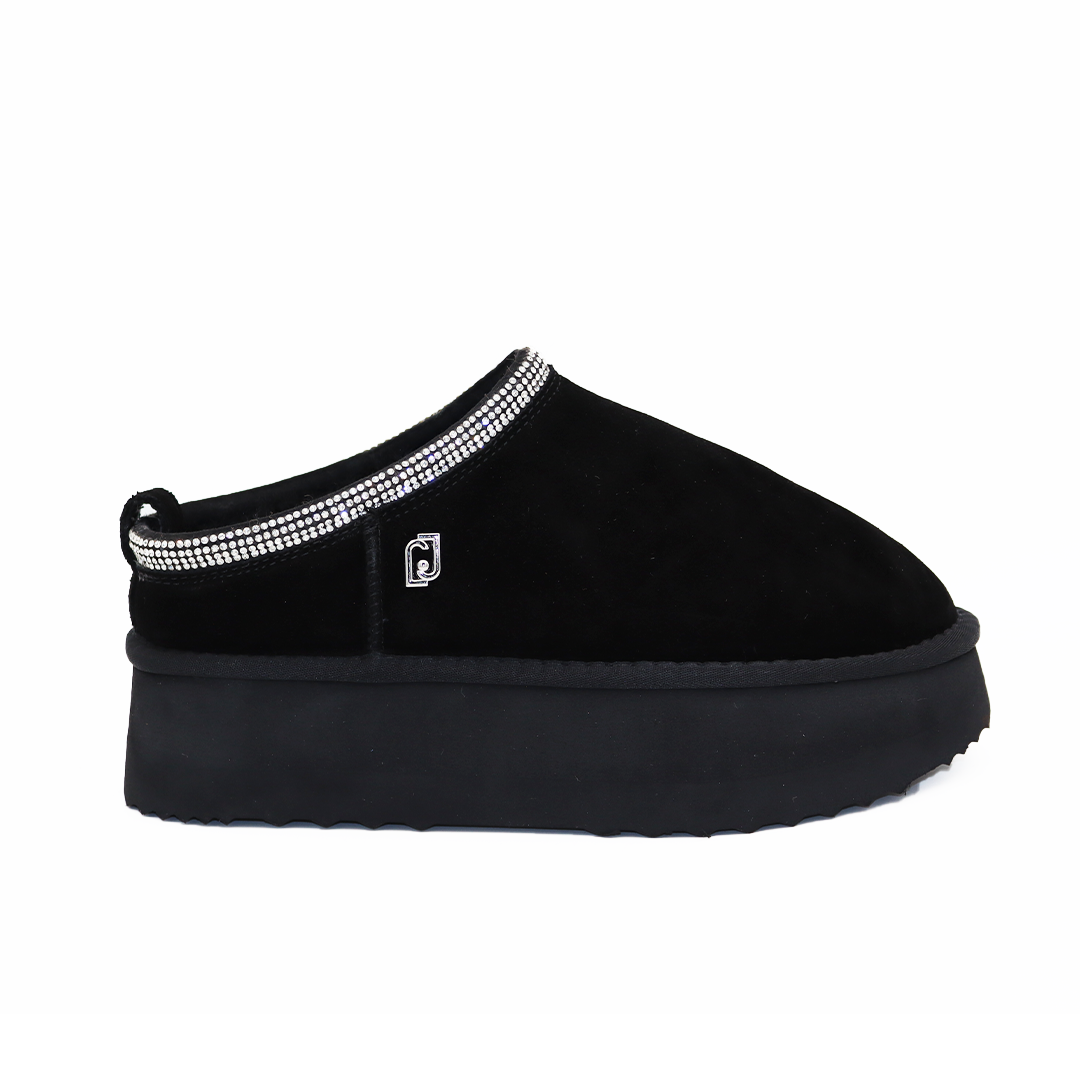 Liu Jo crne gležnjače/papuče postavljene krznom na maxi đonu od 5 cm i sa cirkonima oko ruba i logoom Liu Jo sa strane.