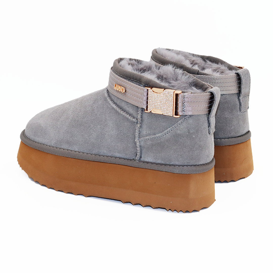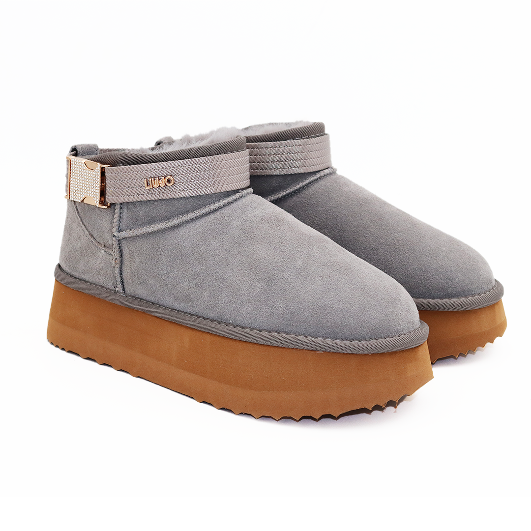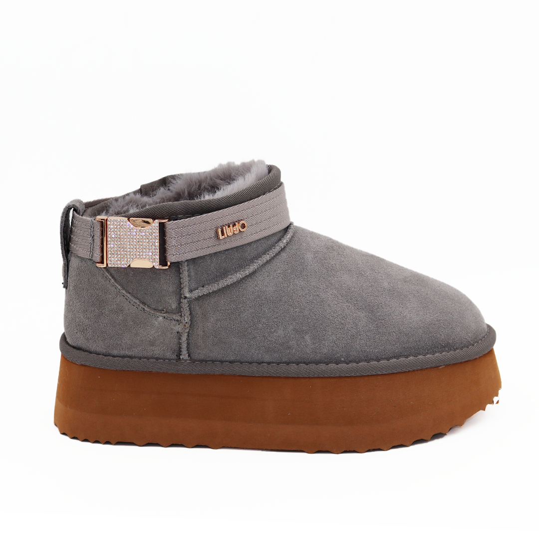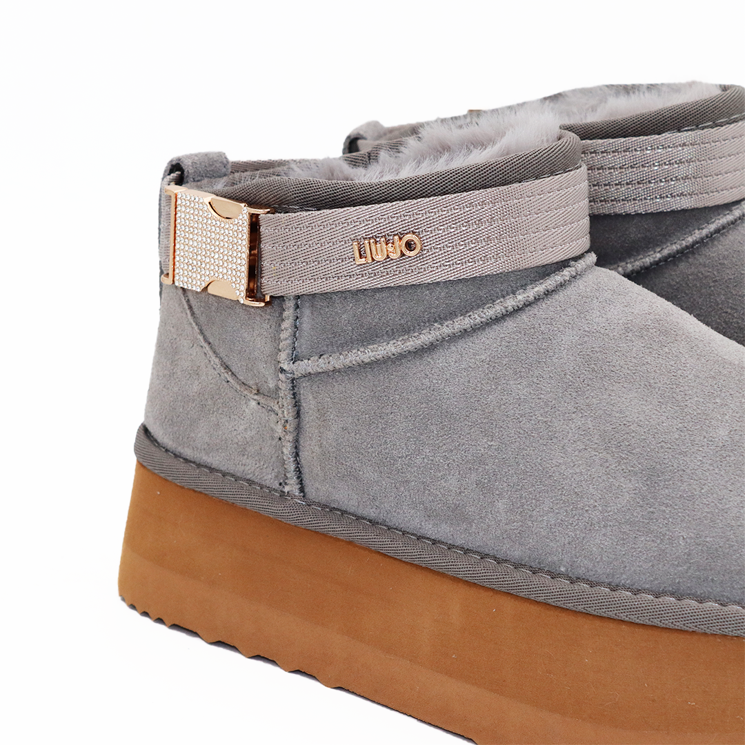 Liu Jo sive gležnjače na maxi đonu postavljene krznom sa sivim kaišem i šnalom od cirkona.