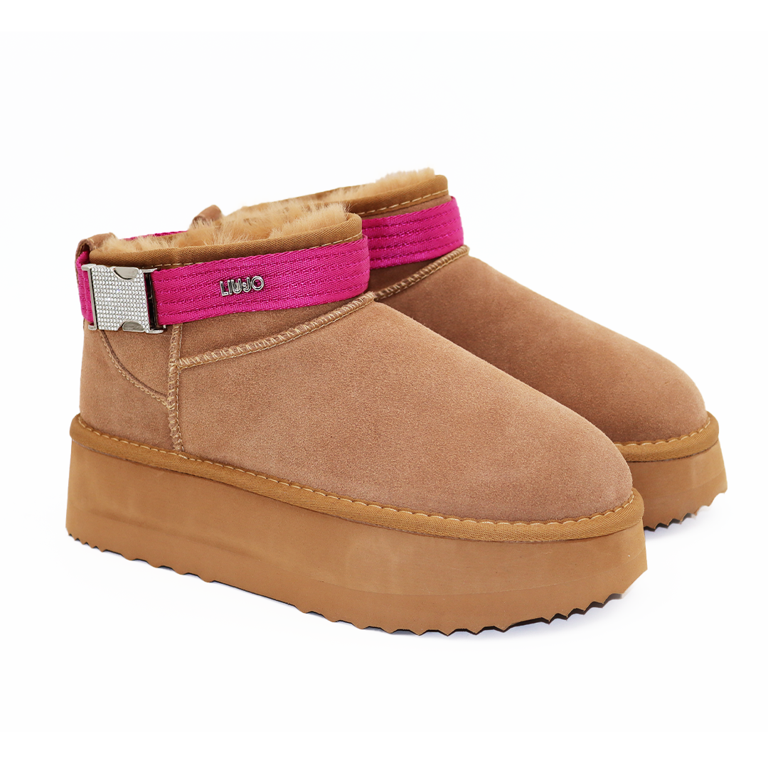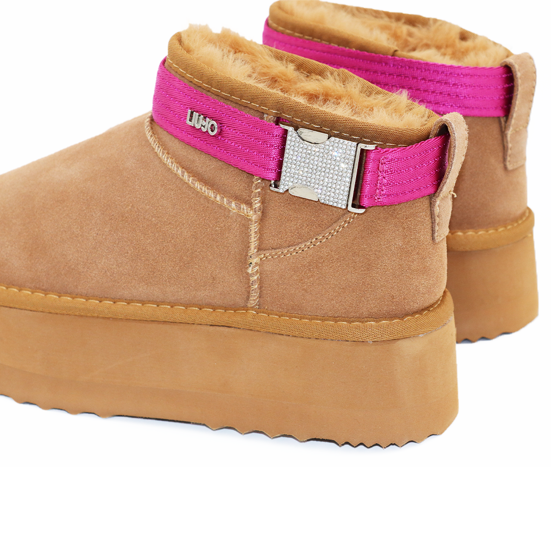 Liu Jo braon gležnjače na maxi đonu postavljene krznom sa ciklama kaišem i šnalom od cirkona.