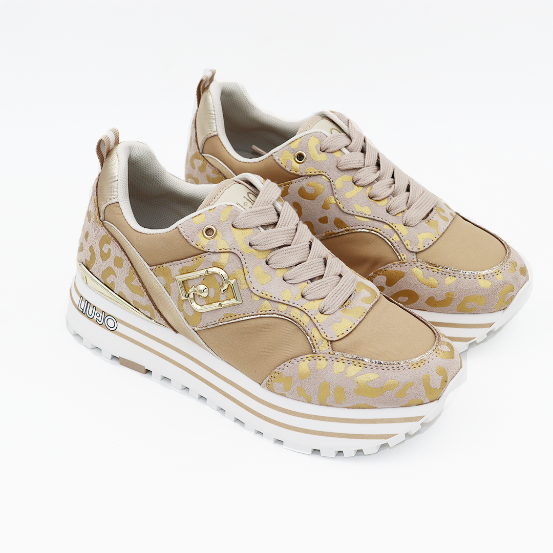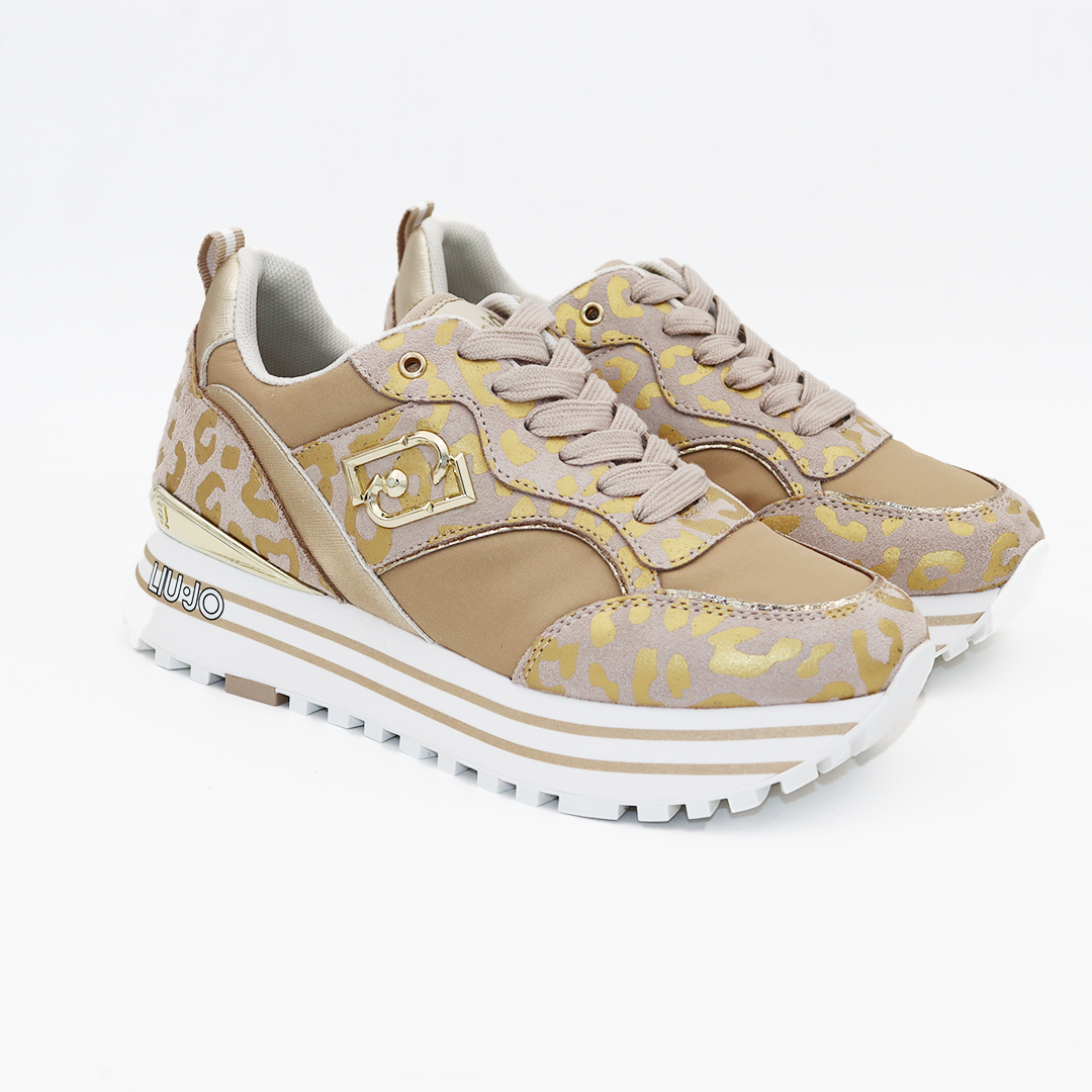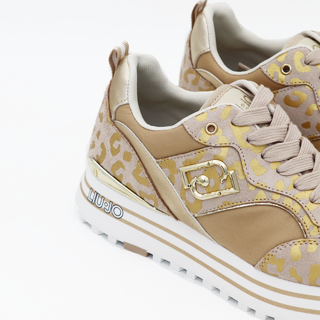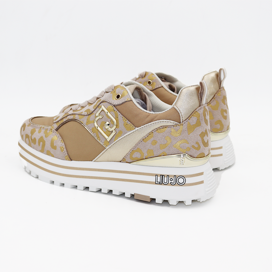 Liu Jo bež-zlatne kožne patike na maxi đonu sa zlatnim leopard printom i zlatnim Liu Jo znakom sa strane.