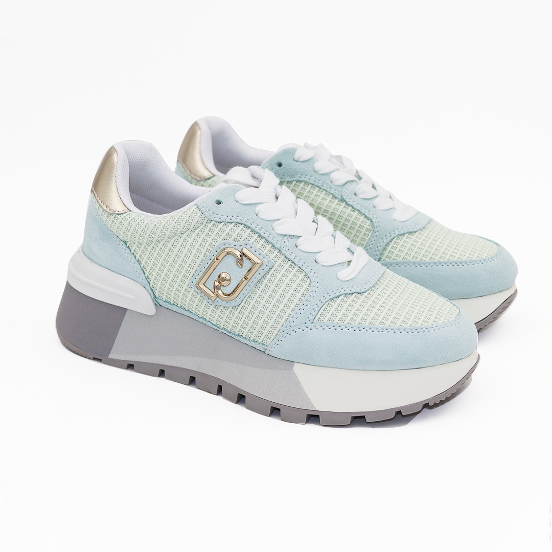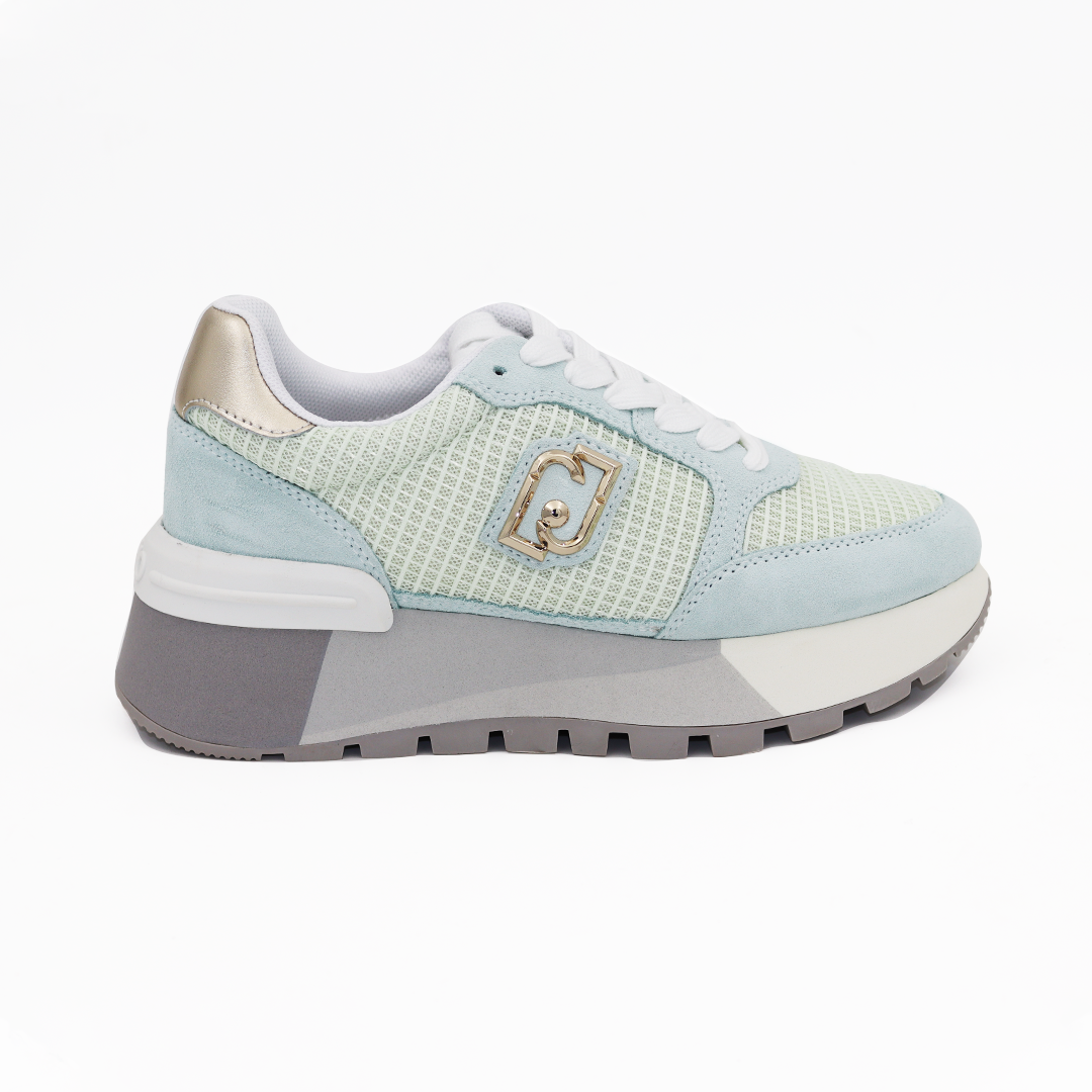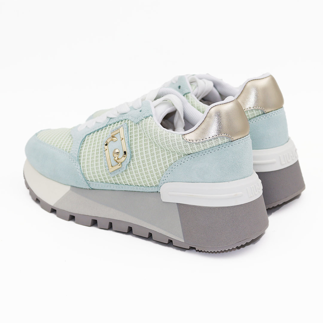 Liu Jo plave patike sa mrežicom na sivom maxi wonder đonu sa zlatnim logoom, i zlatnom laminat kožom na peti.