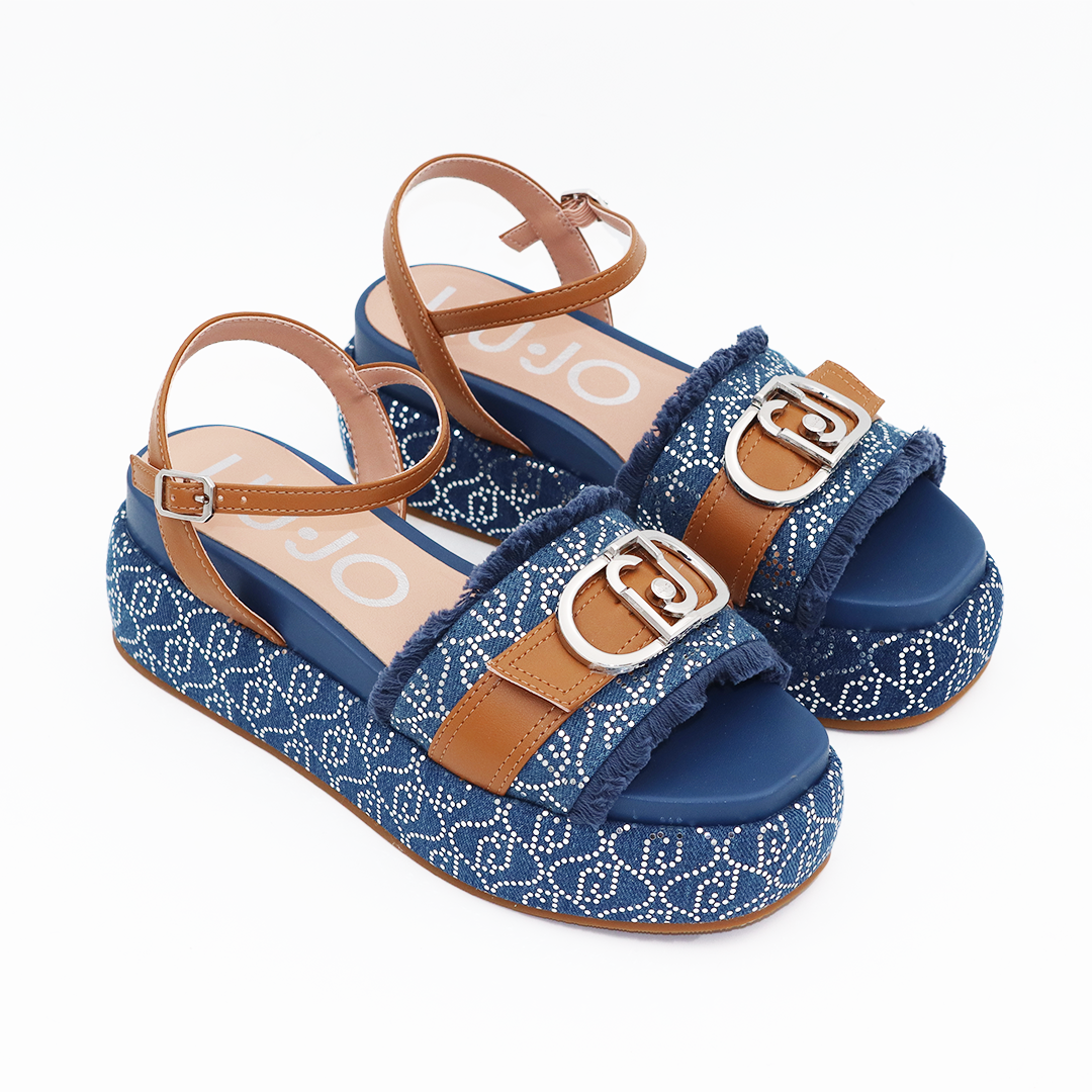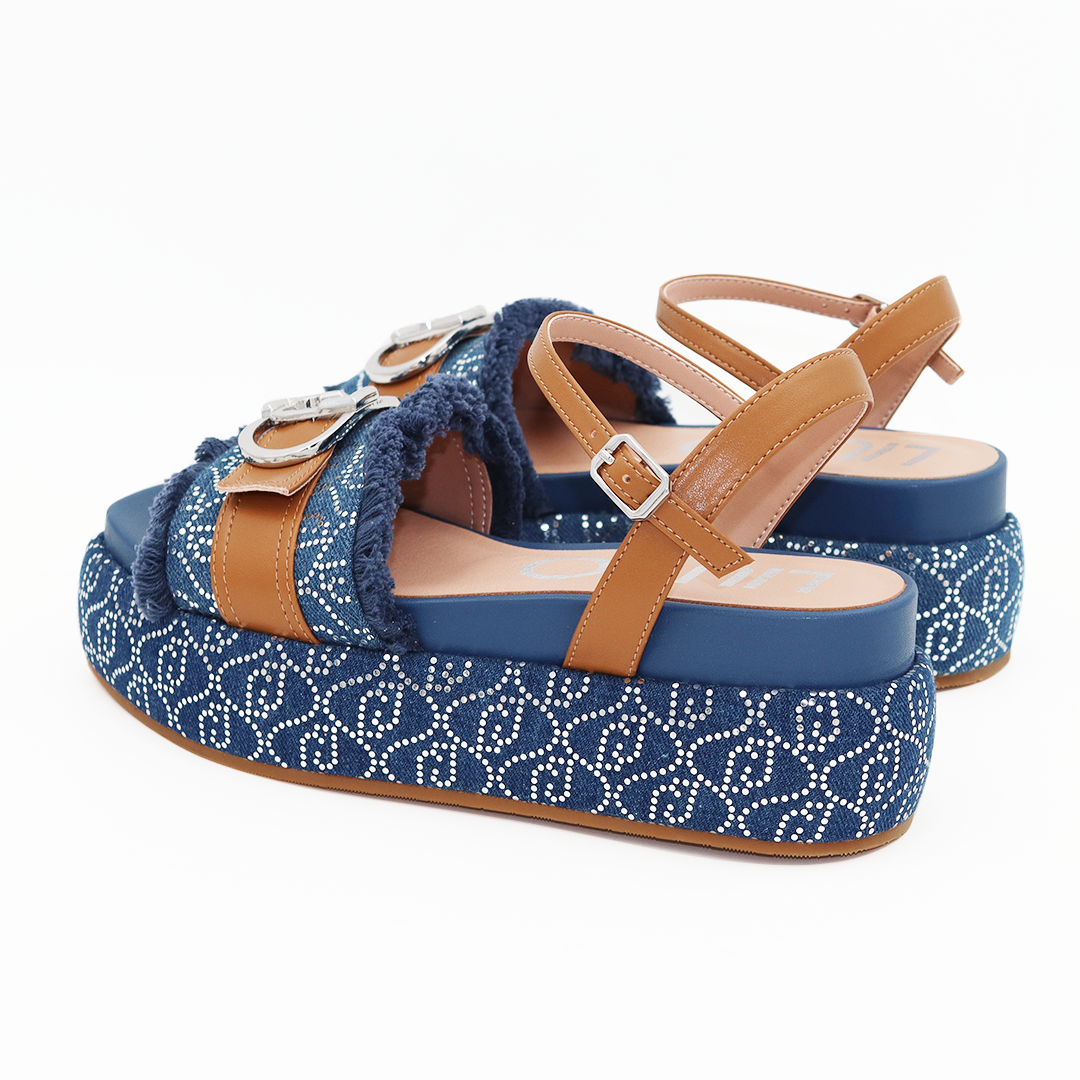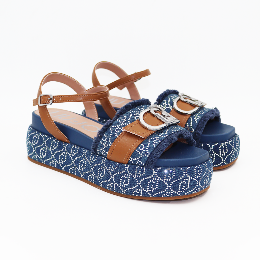 Liu Jo sandale u plavo-braon kombinaciji na plavoj platformi sa Liu Jo logoom i srebrnom LJ šnalom na kaiševima preko prstiju.