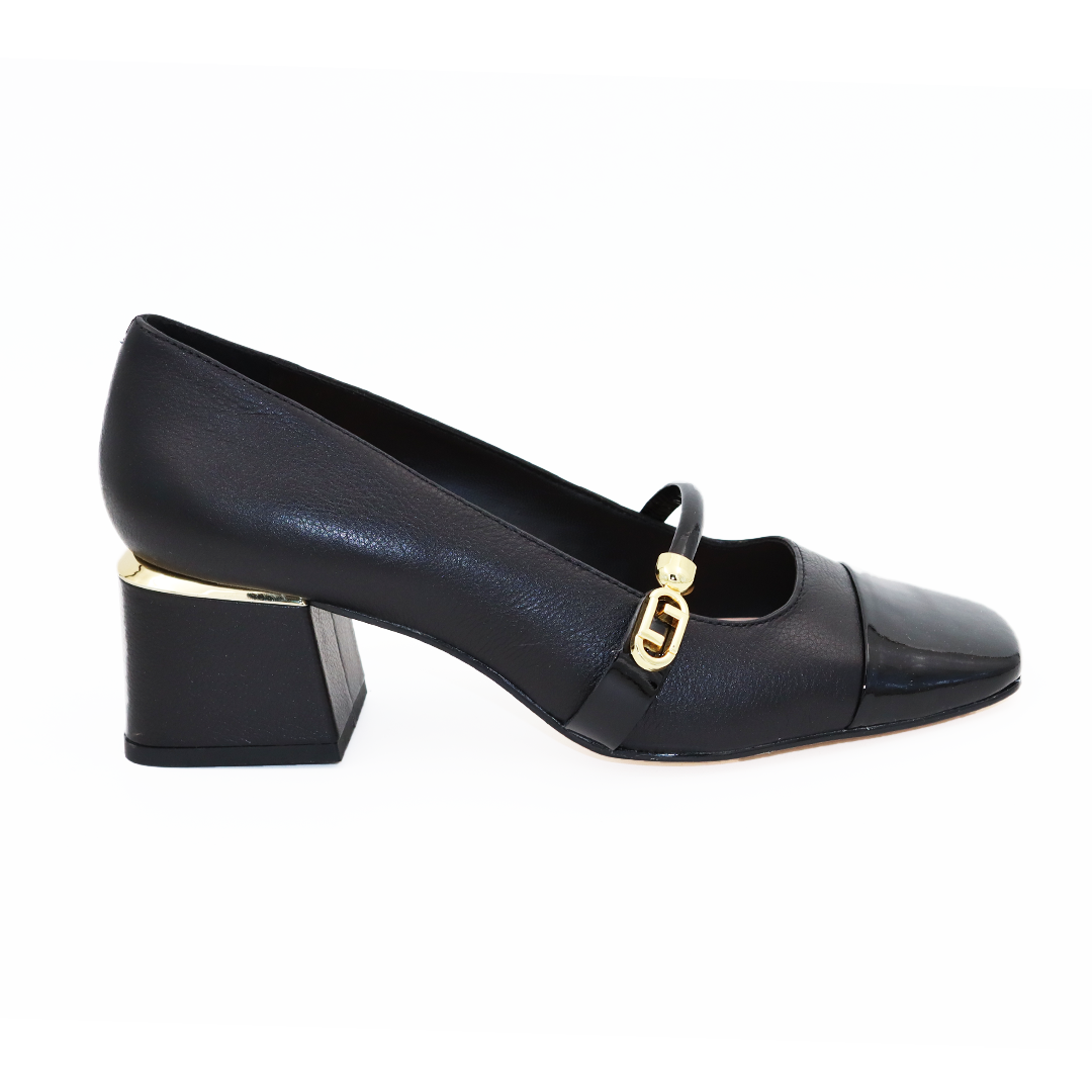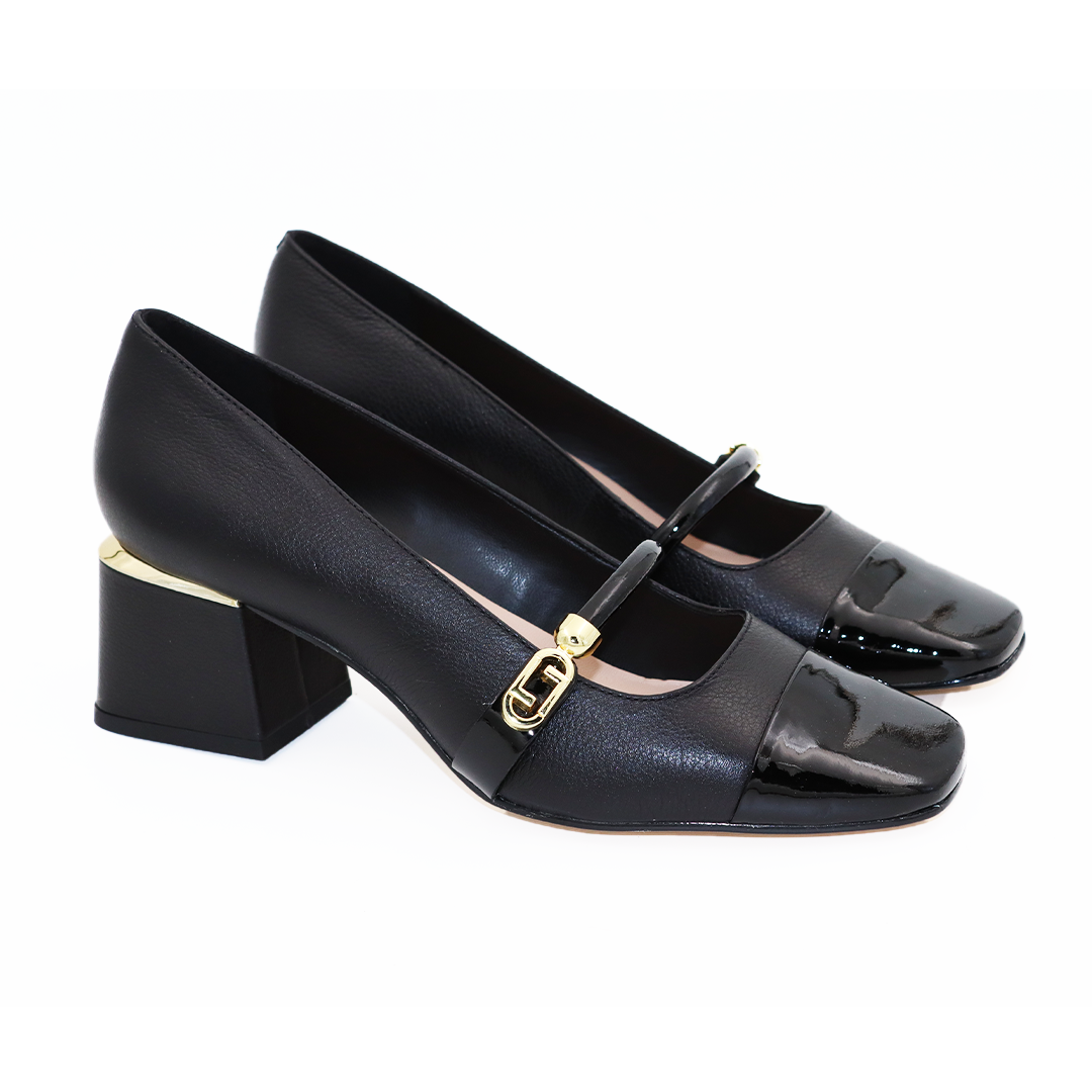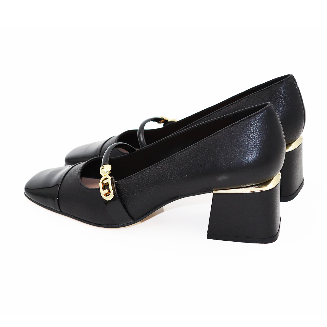 Luz da Lua kožne crne cipele na štiklu u Mary Jane stilu, sa zlatnom dekorativnom šnalom i zlatnim detaljima na peti