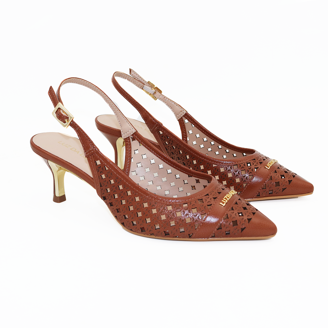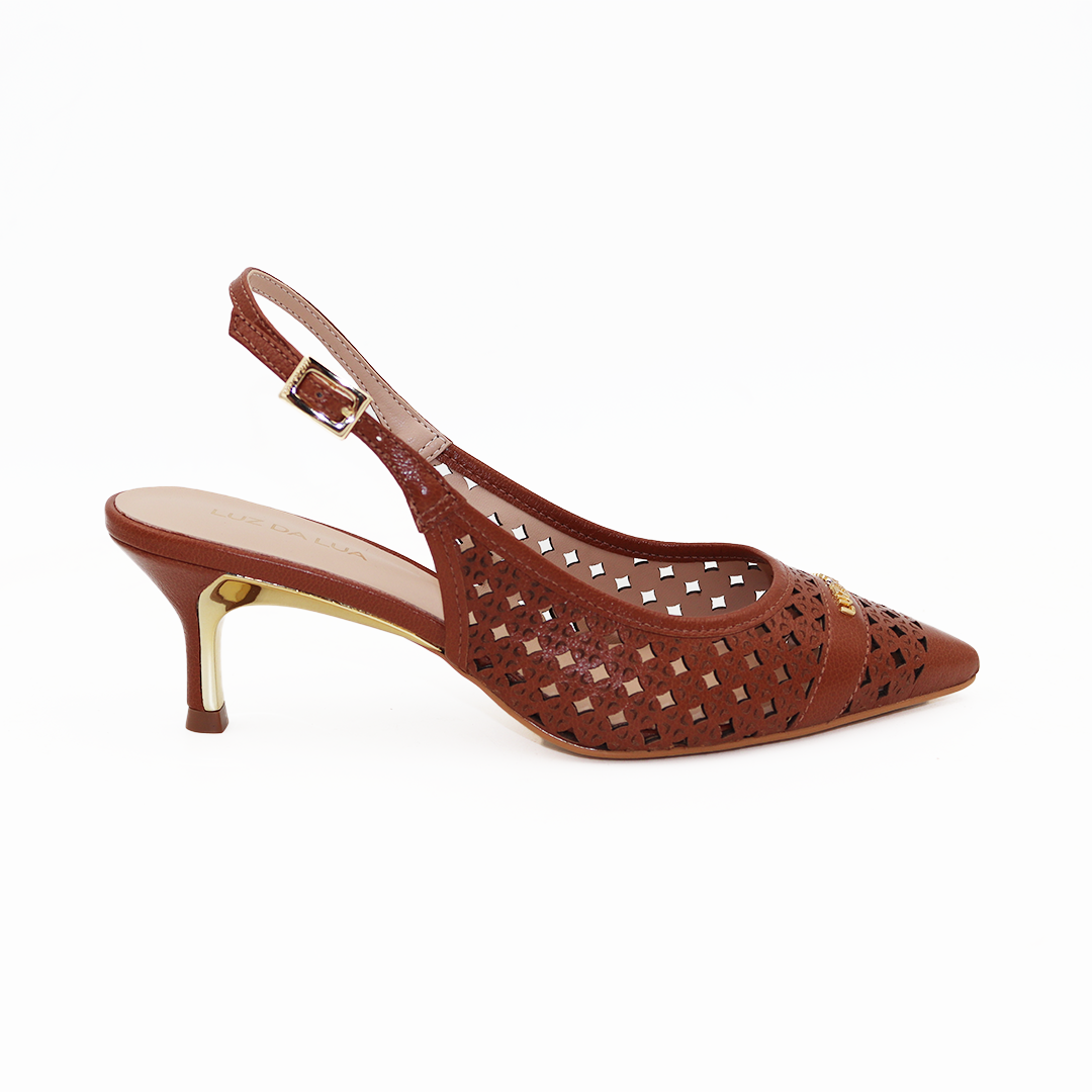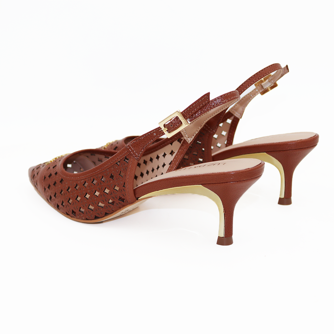 Luz da Lua kožne braon sandalete na špic na manjoj zlatnoj potpetici sa rupičastom dezenu na koži i zlatnom Luz da Lua šnalom