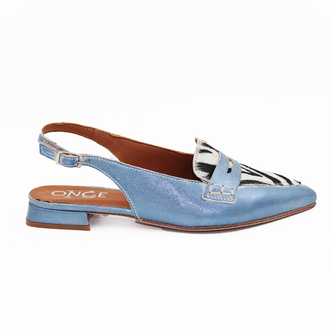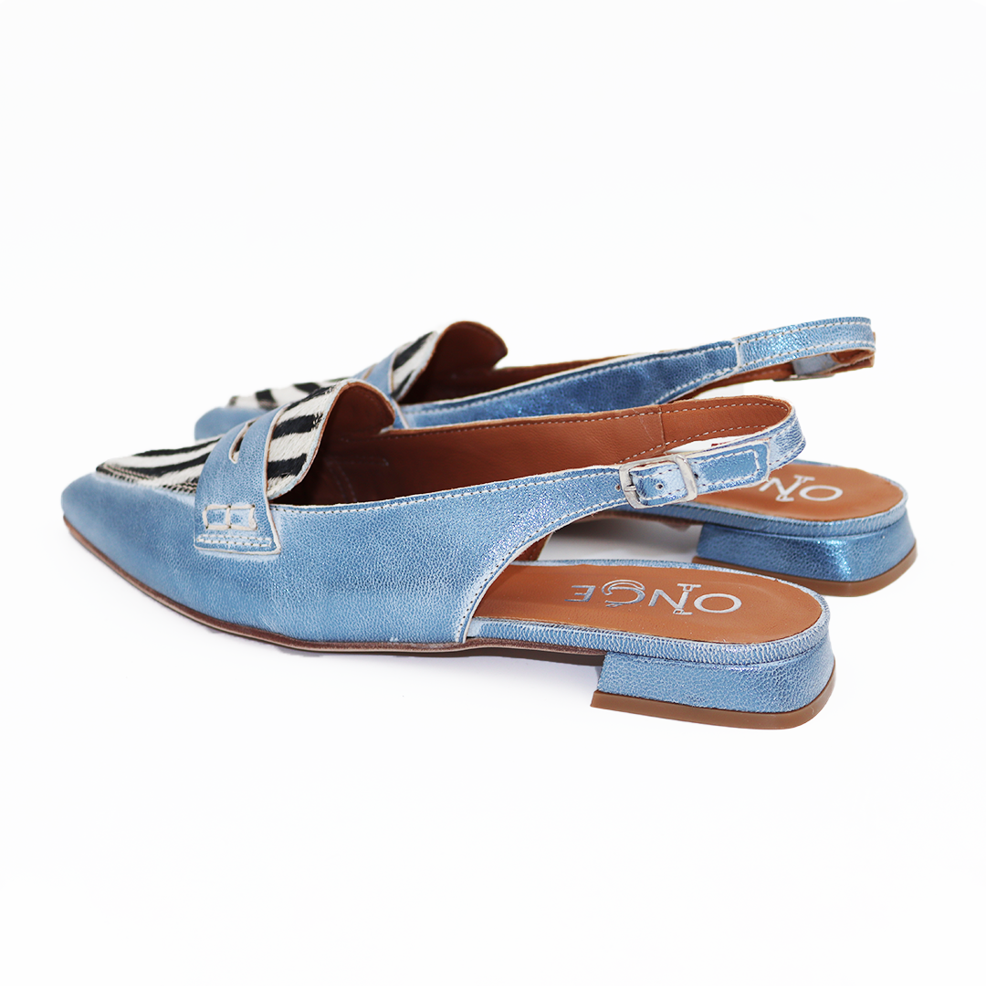 Italijanske ravne sandalete na špic u isčetkanoj laminat plavoj koži sa dlakom u zebra printu na špicu