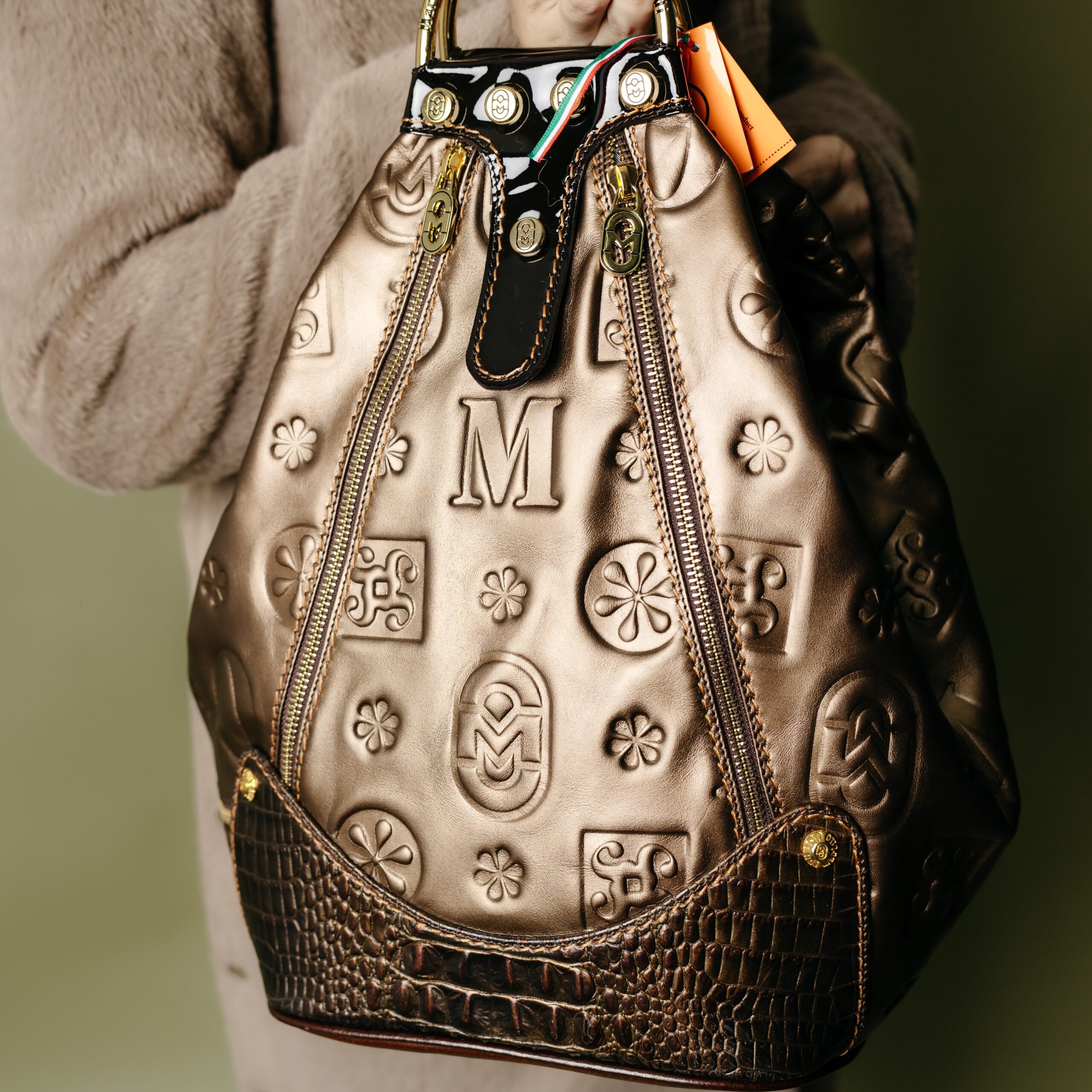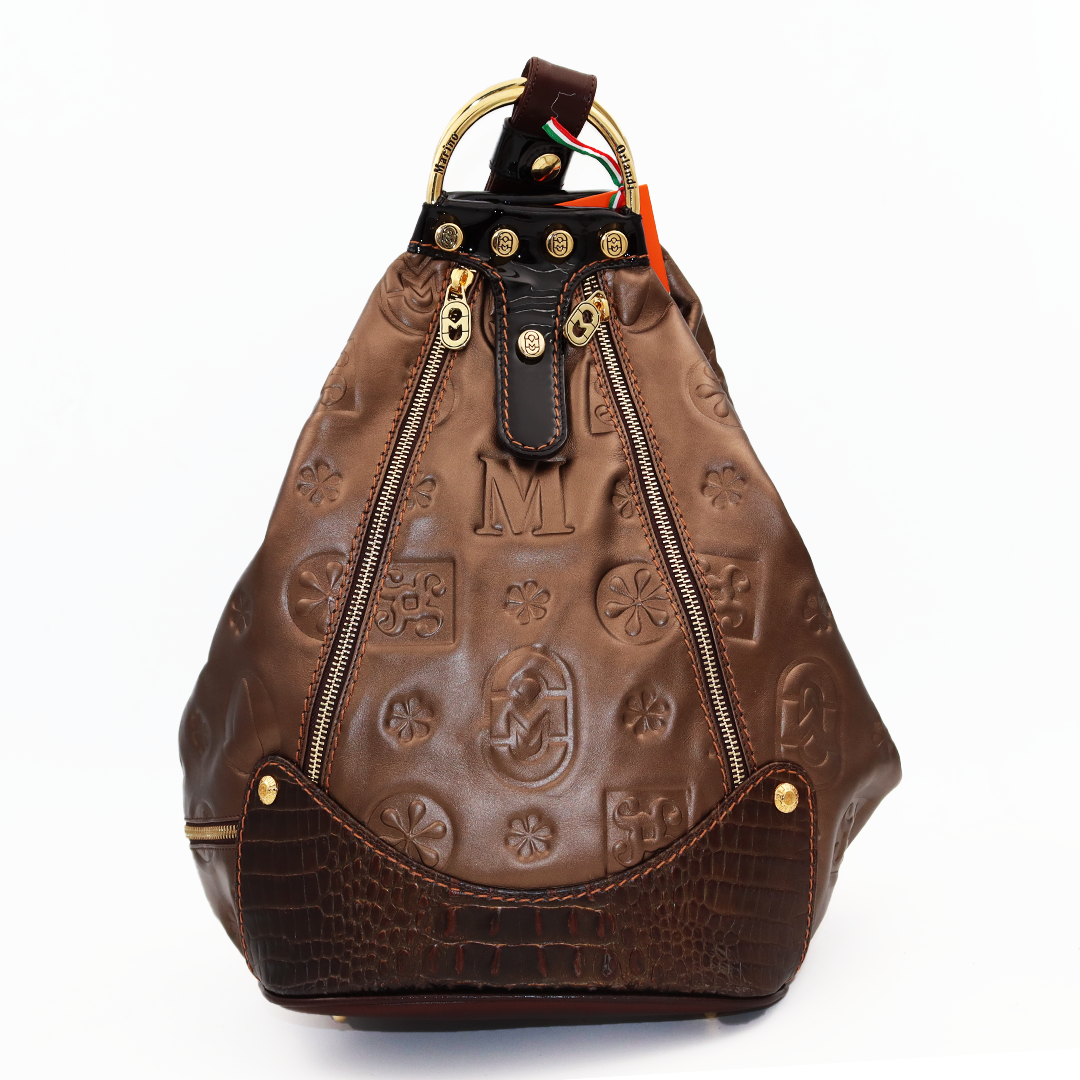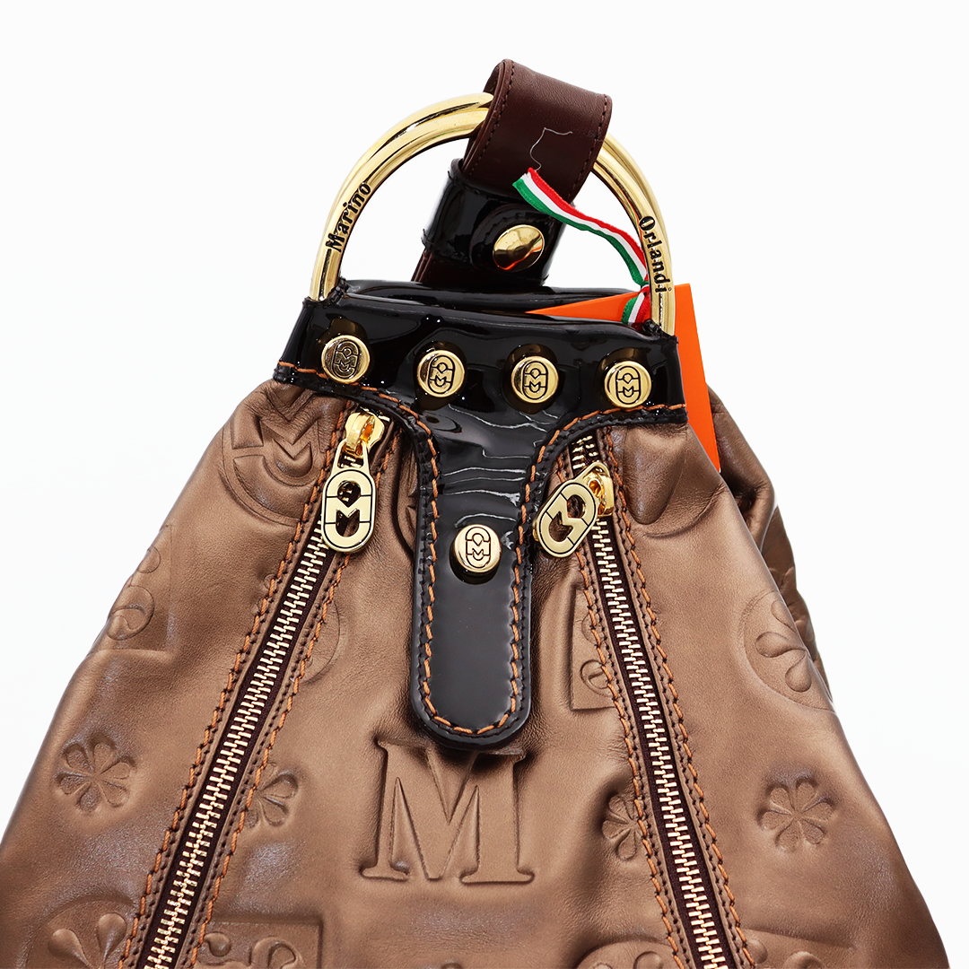 Marino Orlandi bronzana italijanska ručno izrađena ranac-torba sa utisnutim monogramom brenda u premium prirodnu kožu u sjaju, sa zlatnim detaljima, braon kroko kožom na dnu i braon lakovanom kožom pri vrhu. Model može da se nosi kao ranac ili da se podesi kao torba. Uz torbu se dobija i sertifikat o autentičnosti.