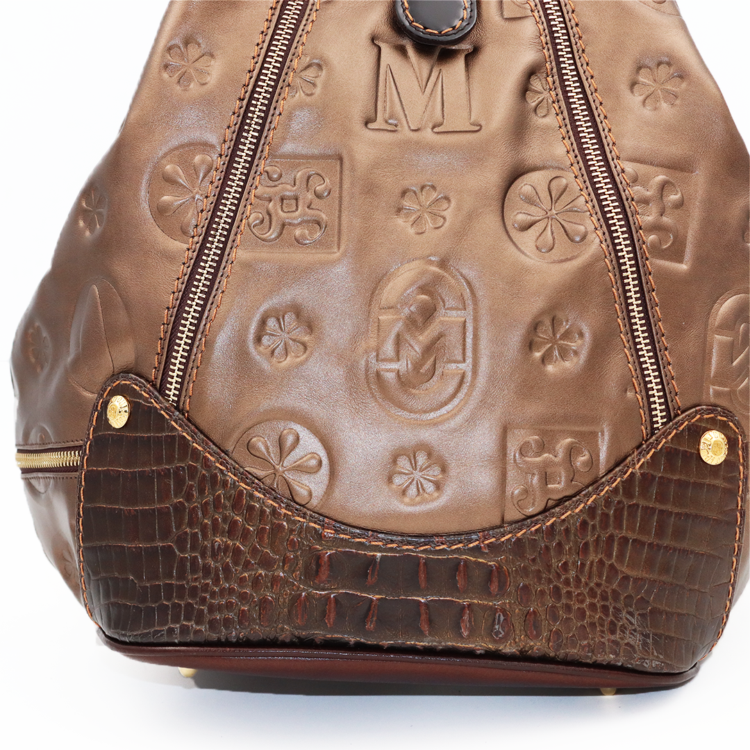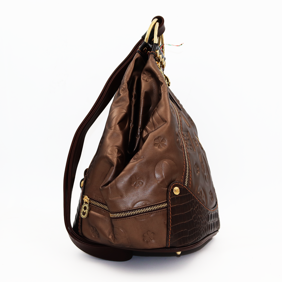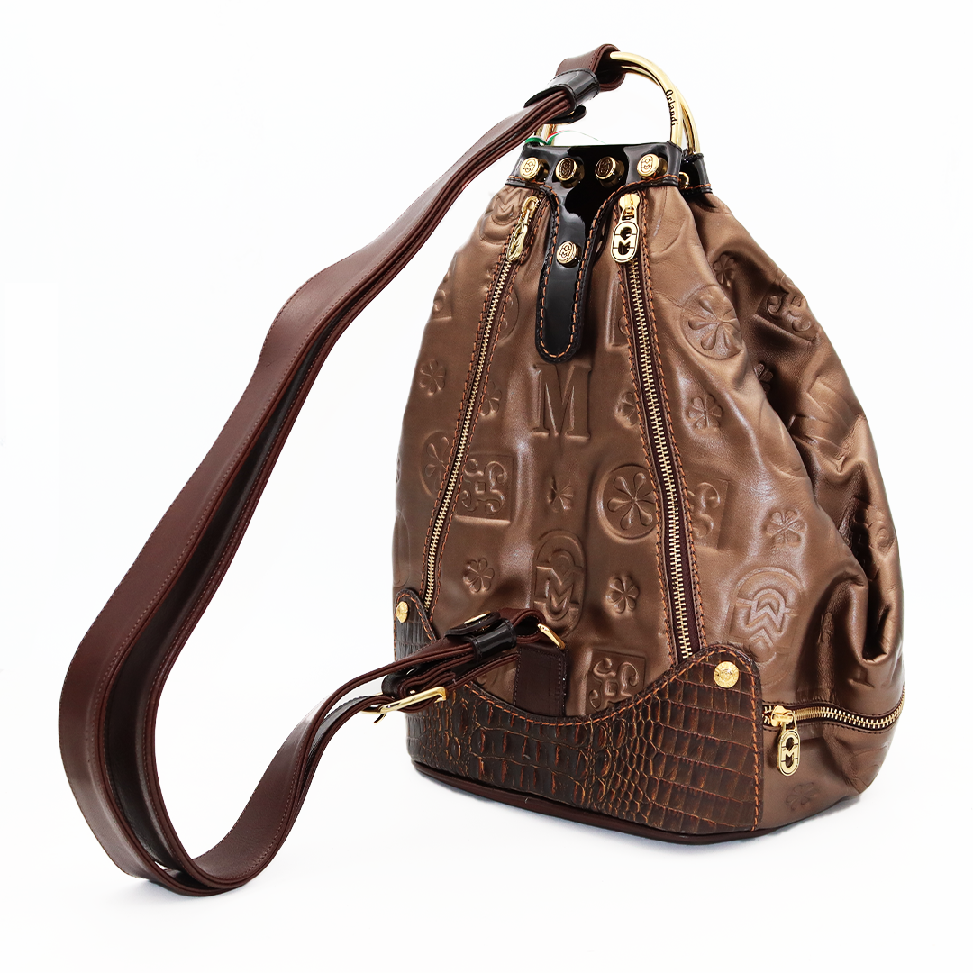 Marino Orlandi bronzana italijanska ručno izrađena ranac-torba sa utisnutim monogramom brenda u premium prirodnu kožu u sjaju, sa zlatnim detaljima, braon kroko kožom na dnu i braon lakovanom kožom pri vrhu. Model može da se nosi kao ranac ili da se podesi kao torba. Uz torbu se dobija i sertifikat o autentičnosti.