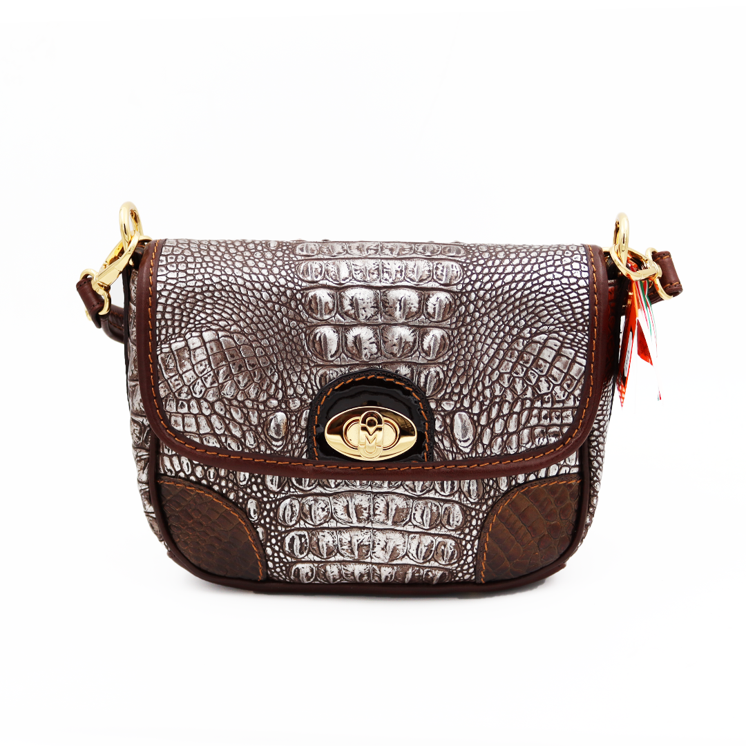 Marino Orlandi italijanska ručno-izrađena manja torba od premium kože u kroko dezenu sa braon-bronzanim sjajem i zlatnim detaljima