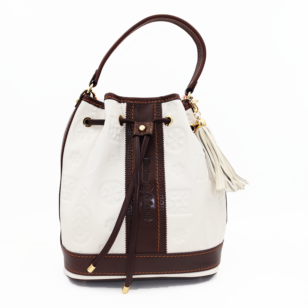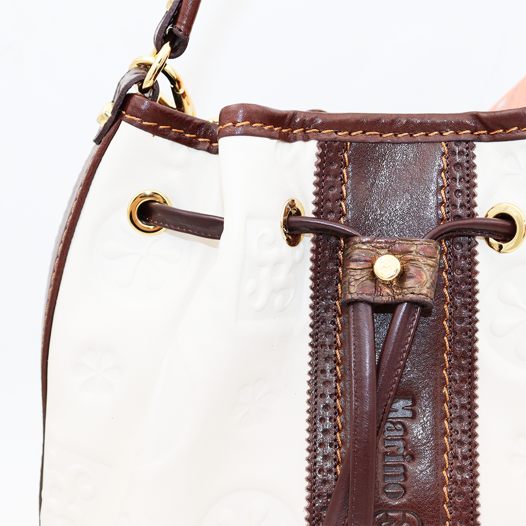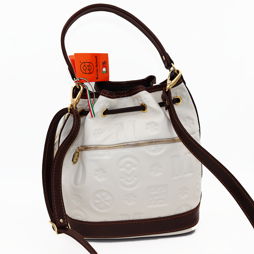 Marino Orlandi kožna italijanska torba u svetlo krem boji sa braon kaiševima i utisnutim monogramom brenda u kožu.