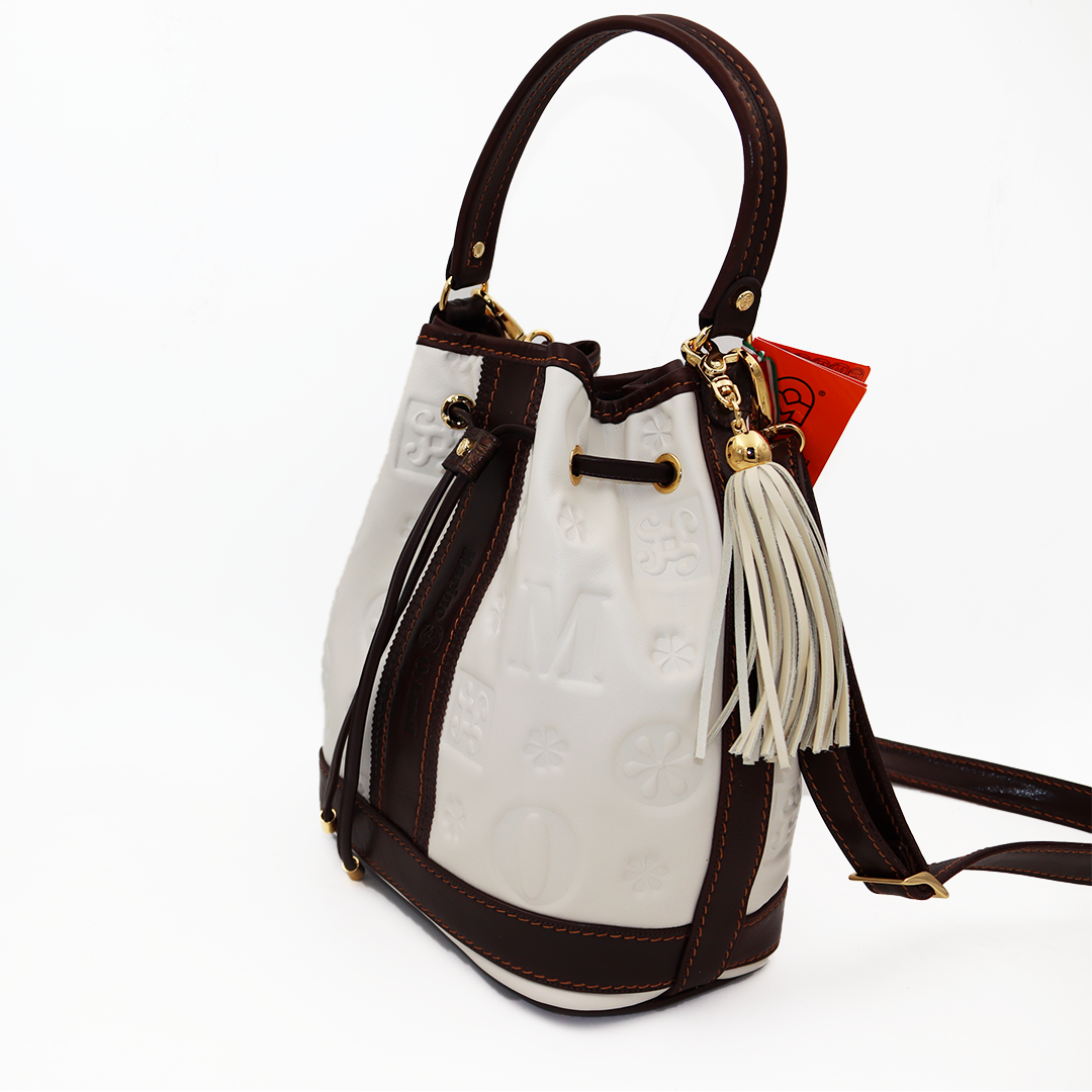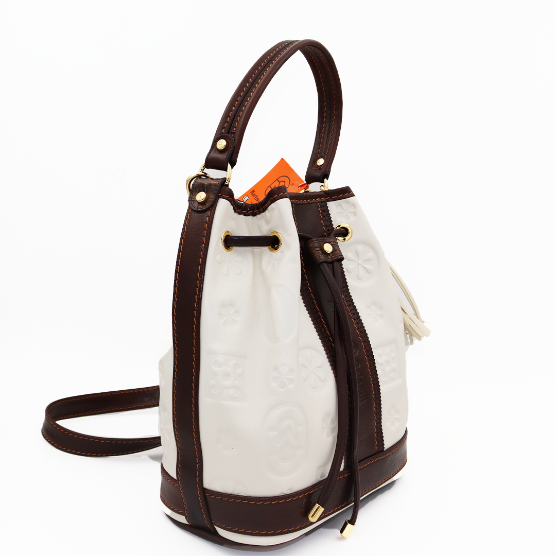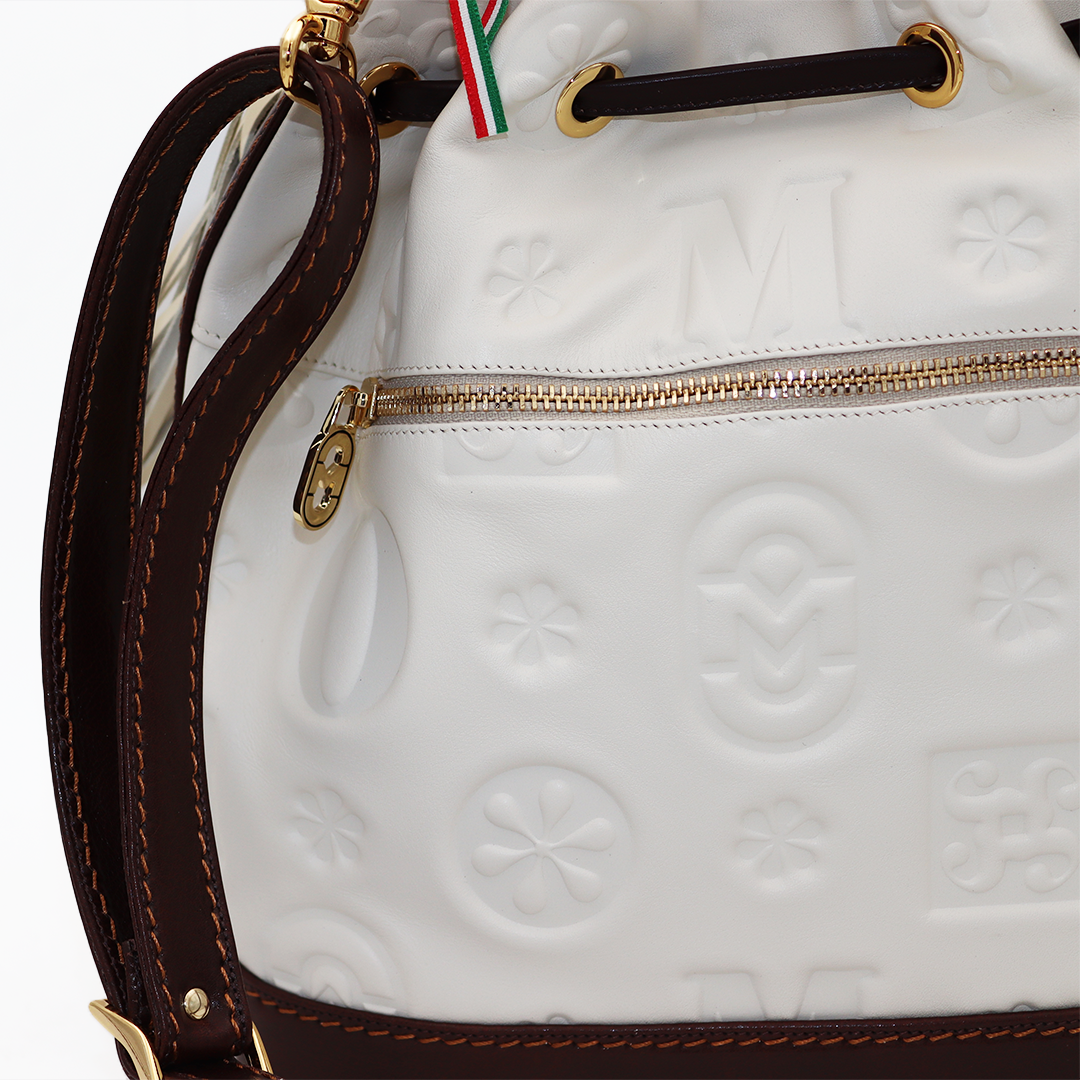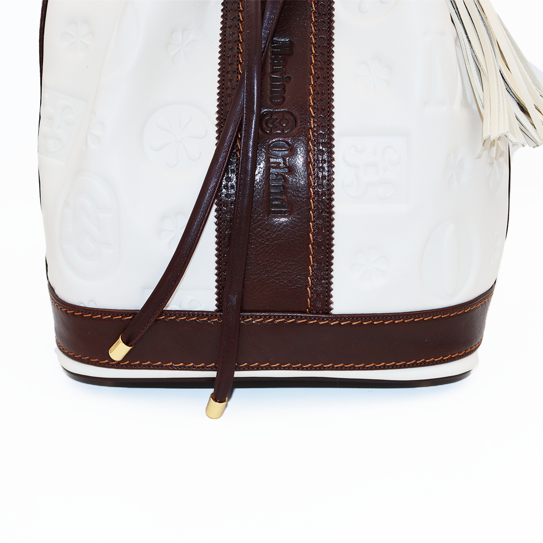 Marino Orlandi kožna italijanska torba u svetlo krem boji sa braon kaiševima i utisnutim monogramom brenda u kožu.