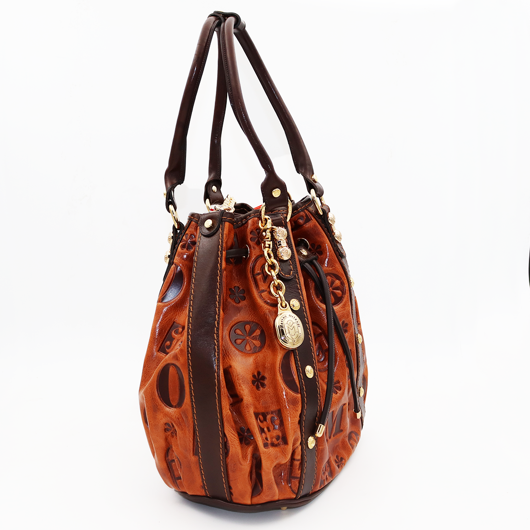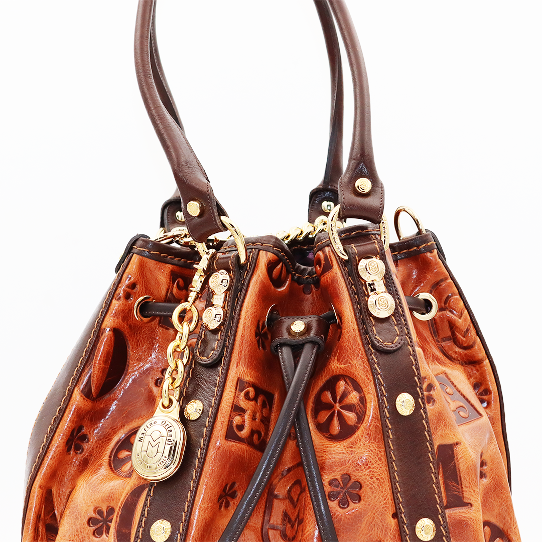 Marino Orlandi torba u braon boji sa zlatnim nitnama i detaljima i utisnutim monogramom brenda u premium prirodnu kožu. Italijanska ručna izrada.