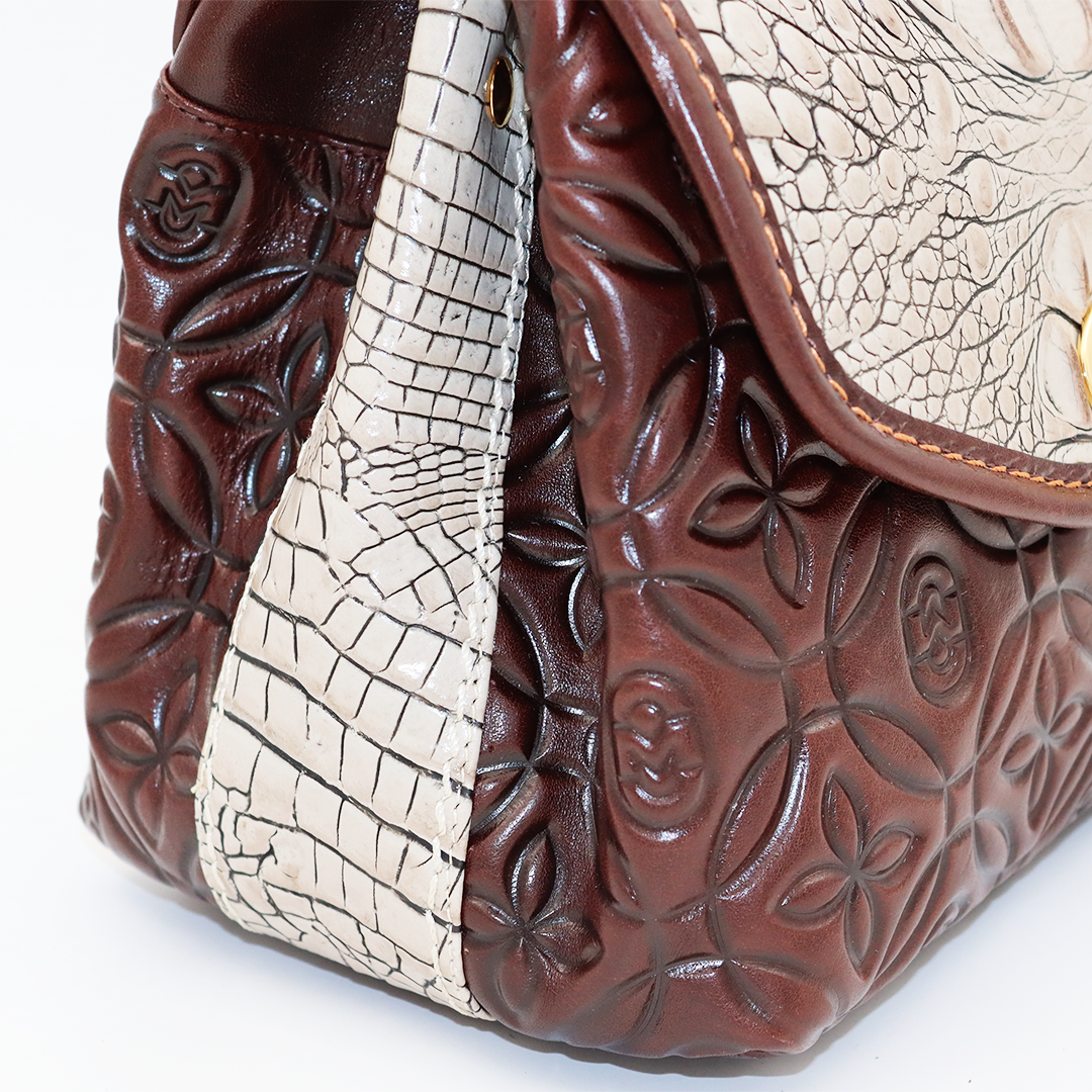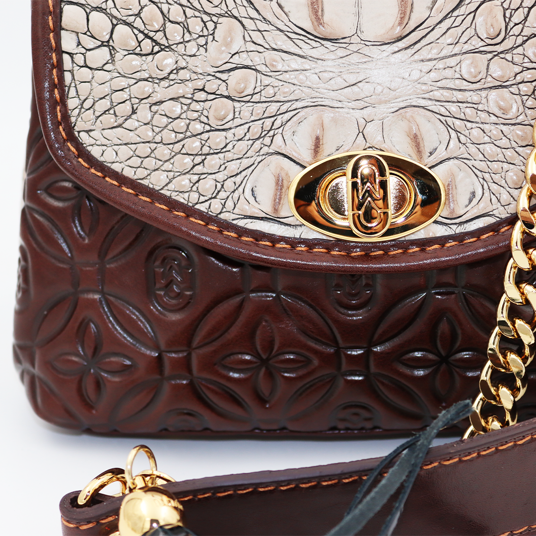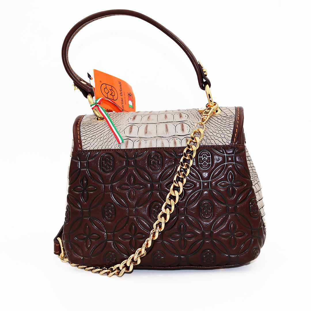 Marino Orlandi ručno izrađena italijanska luksuzna torba od premium prirodne kože u braon boji, srednje veličine, sa Marino Orlandi monogramom na donjem delu i bež/taupe kroko koži na preklopu, sa zlatnom kopčom i kožnom kićankom. Uz model se dobija sertifikat o autentičnosti.
