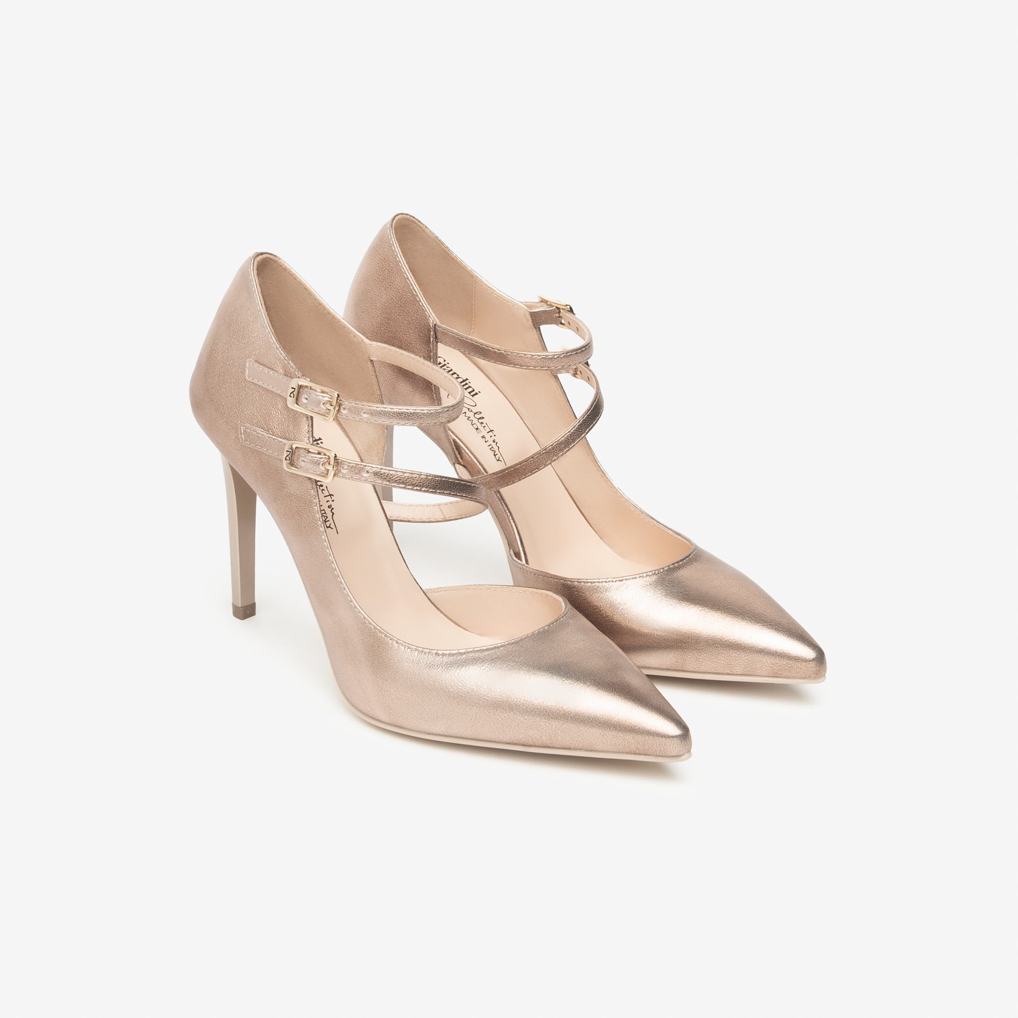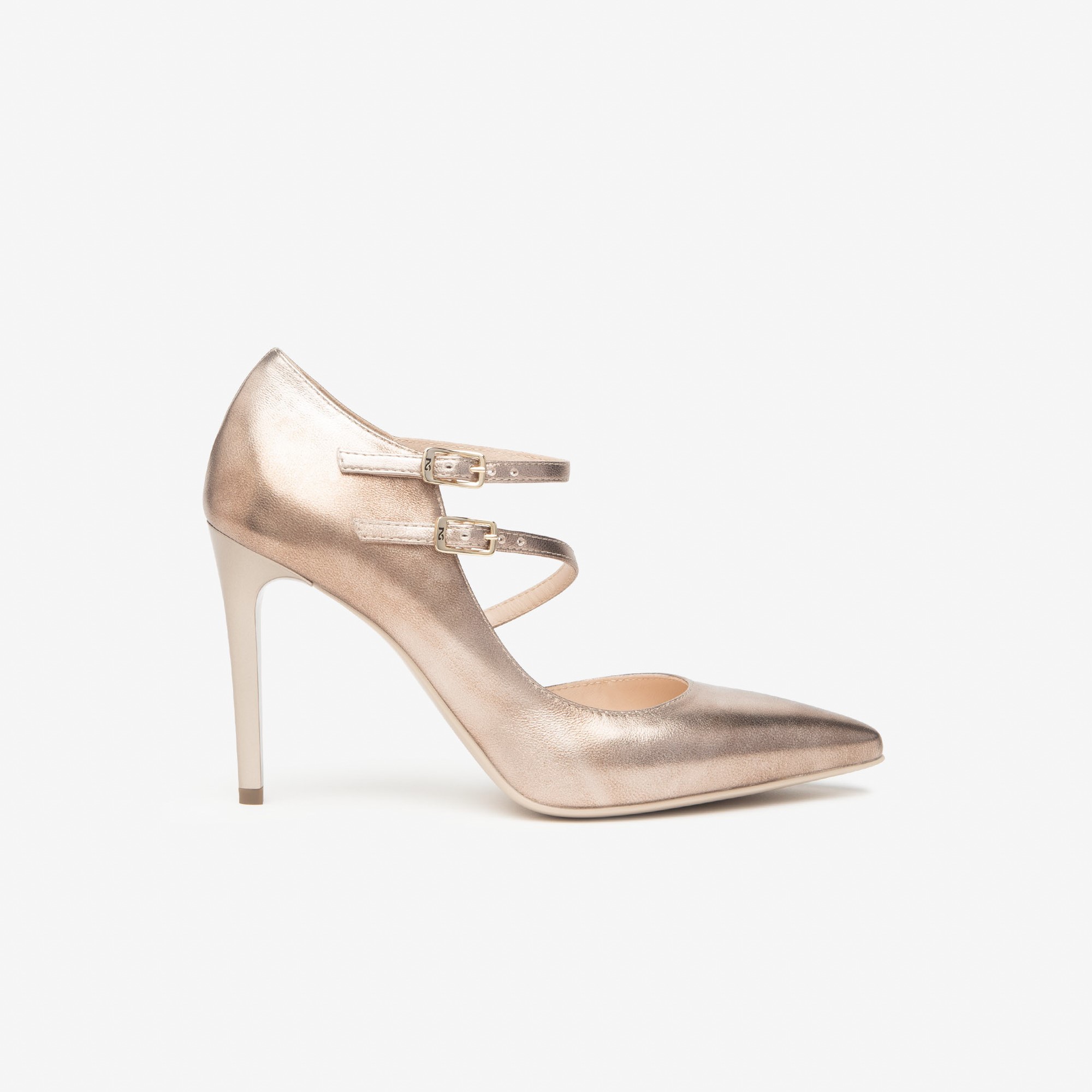 Nero Giardini kožne mat zlatne cipele na tanju višu potpeticu od 9 cm sa dva kaiša preko risa