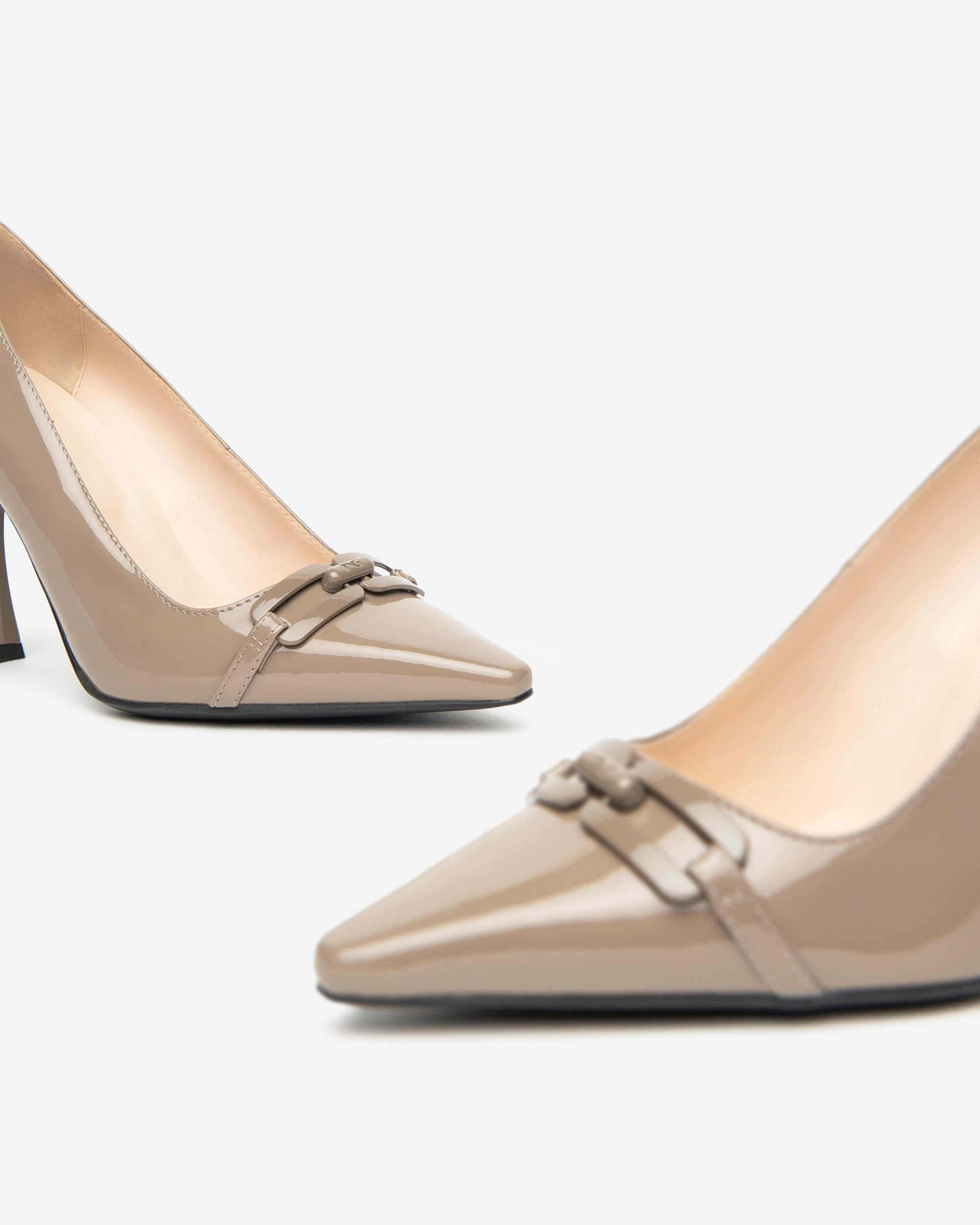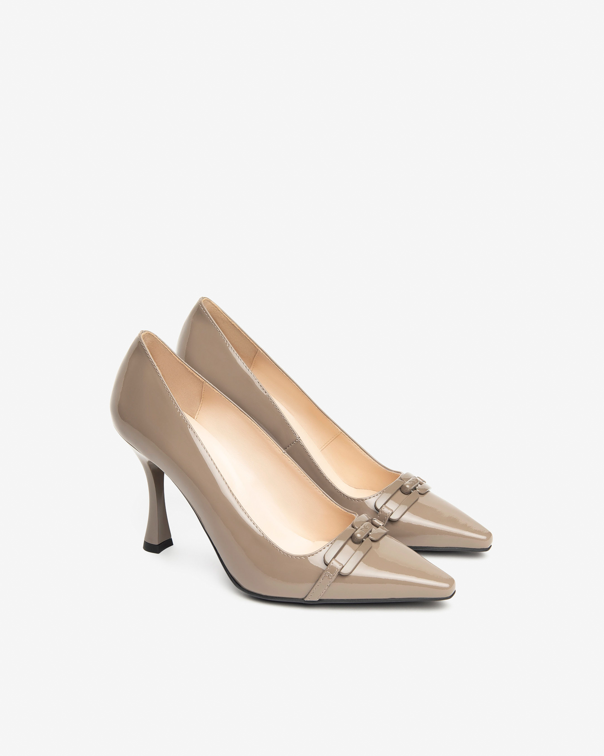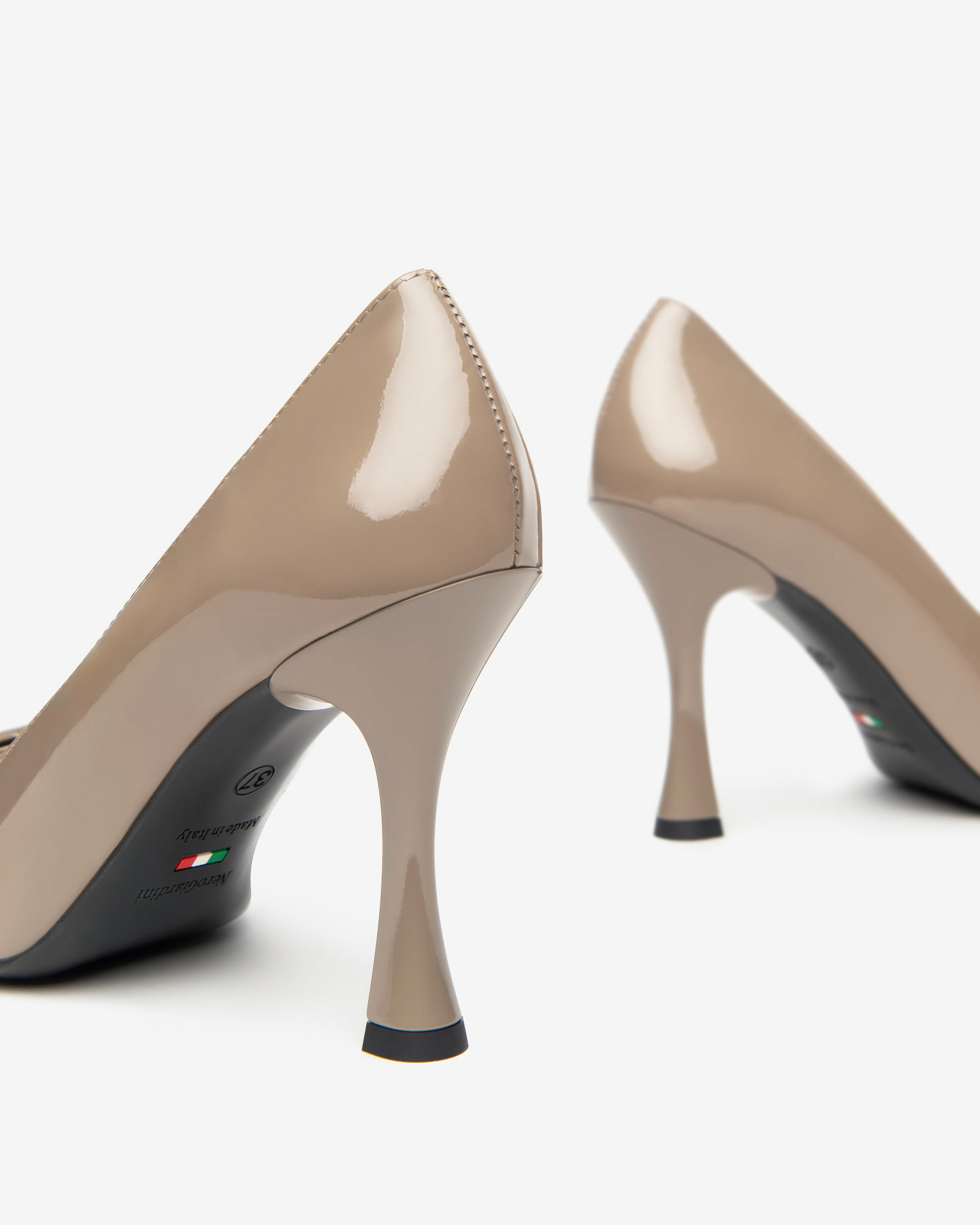 Nero Giardini italijanske kožne bež-sive špic salonke u laku, na potpetici od 9 cm i diskretnom šnalom.