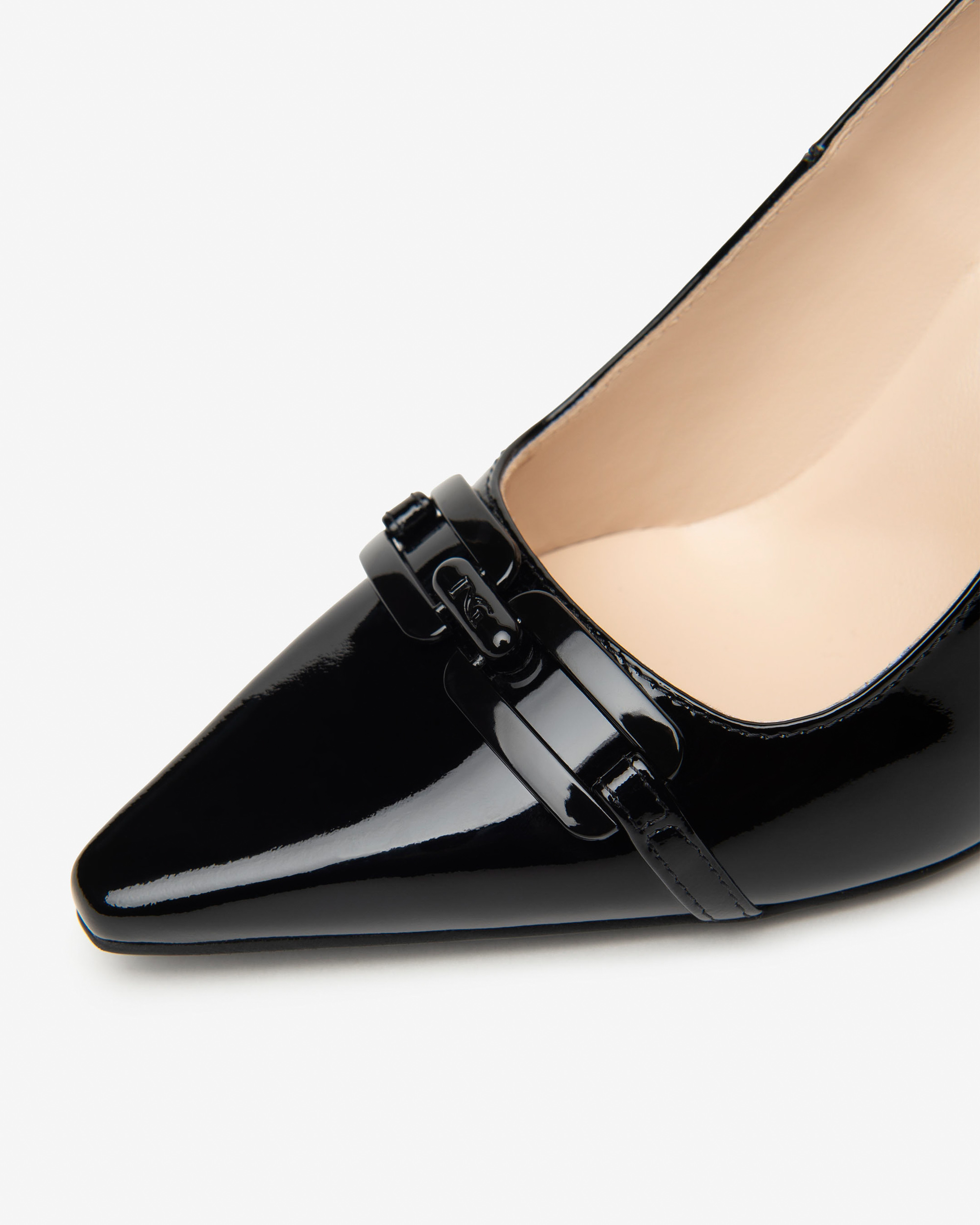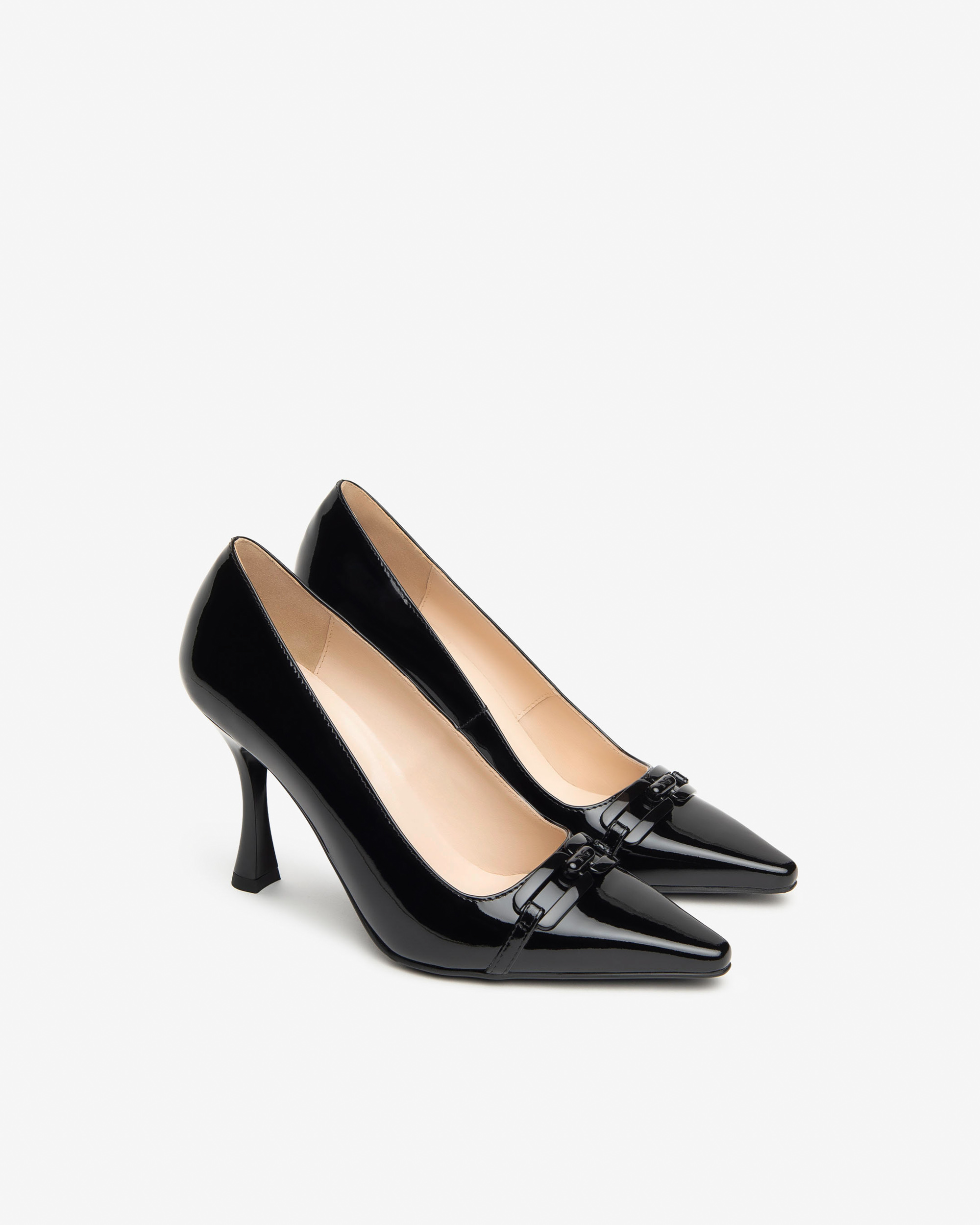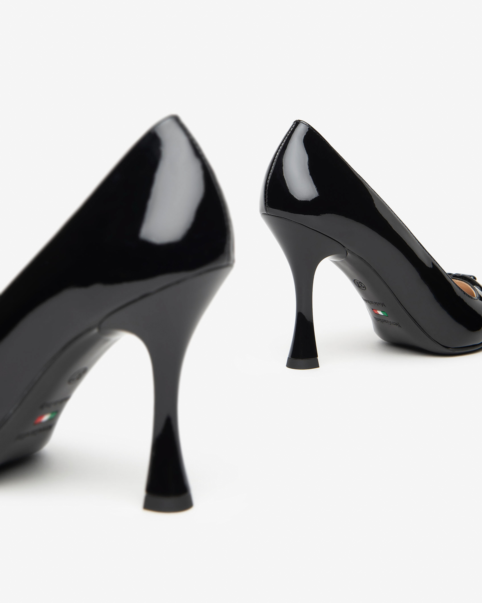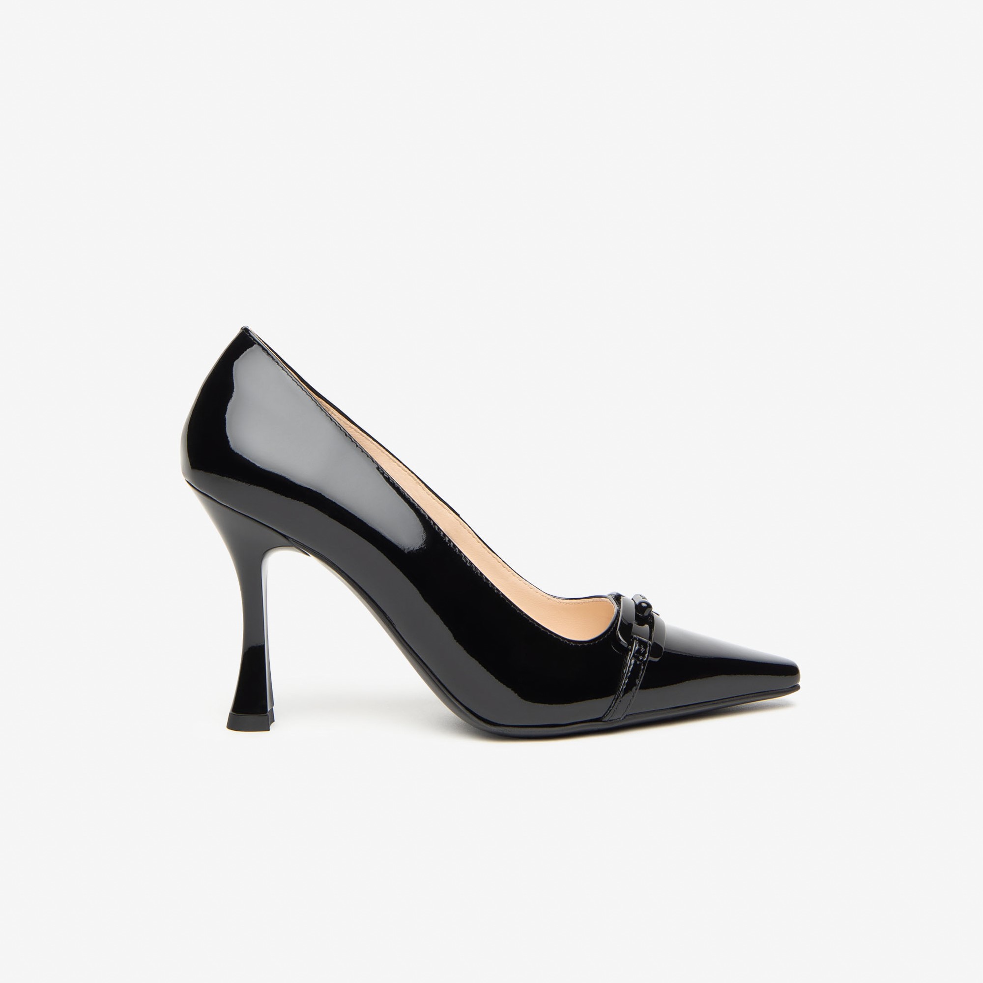 Nero Giardini italijanske kožne crne špic salonke u laku, na potpetici od 9 cm i diskretnom crnom šnalom.