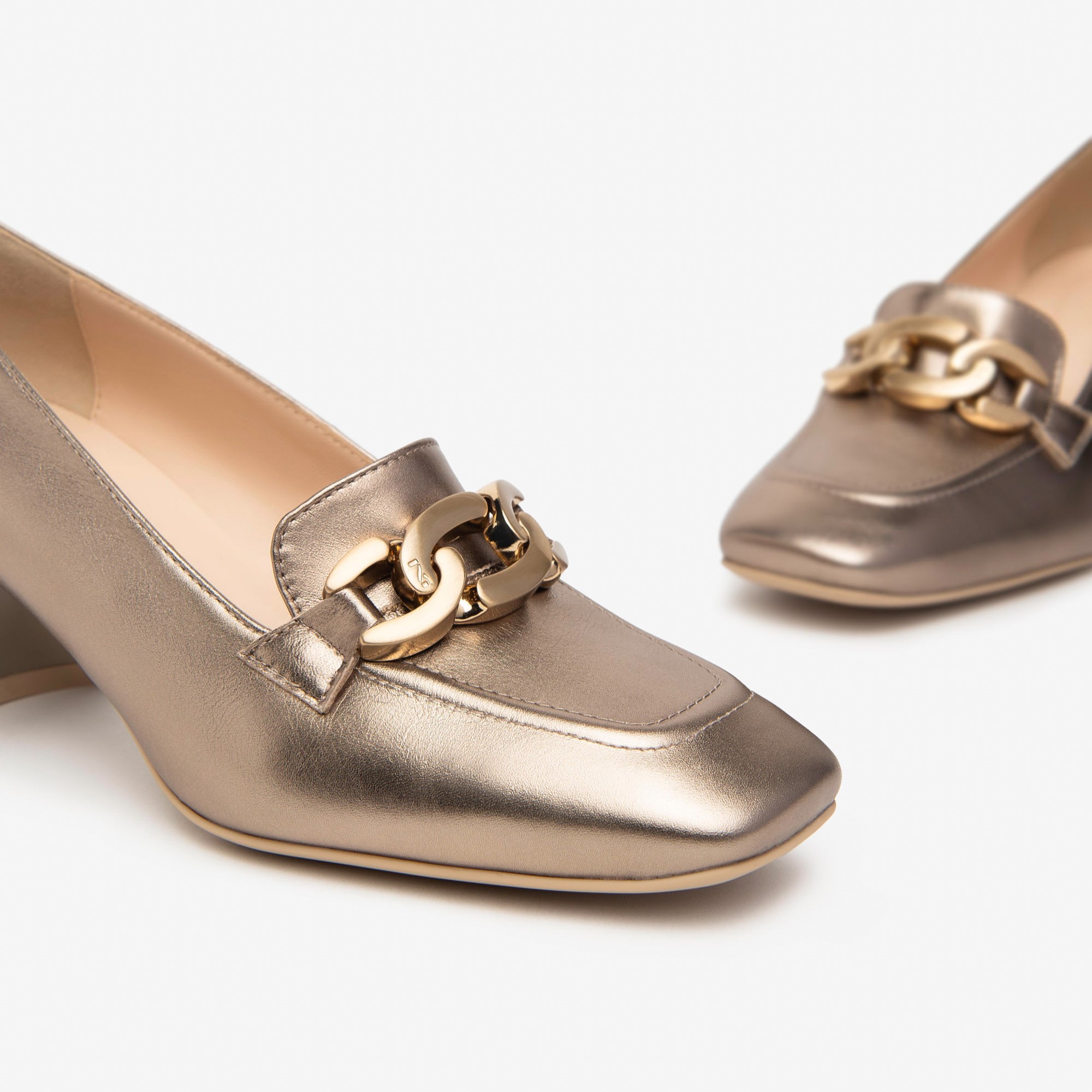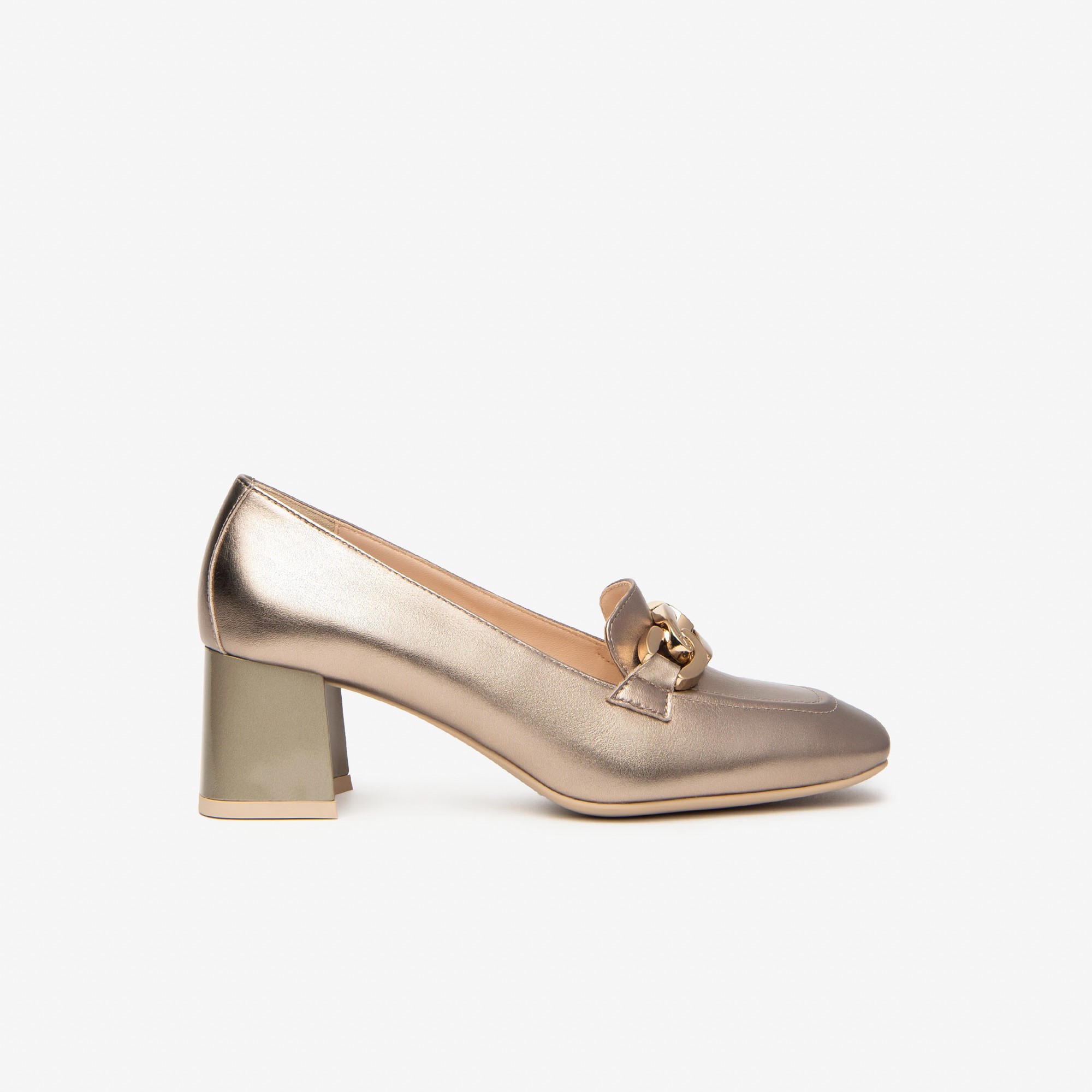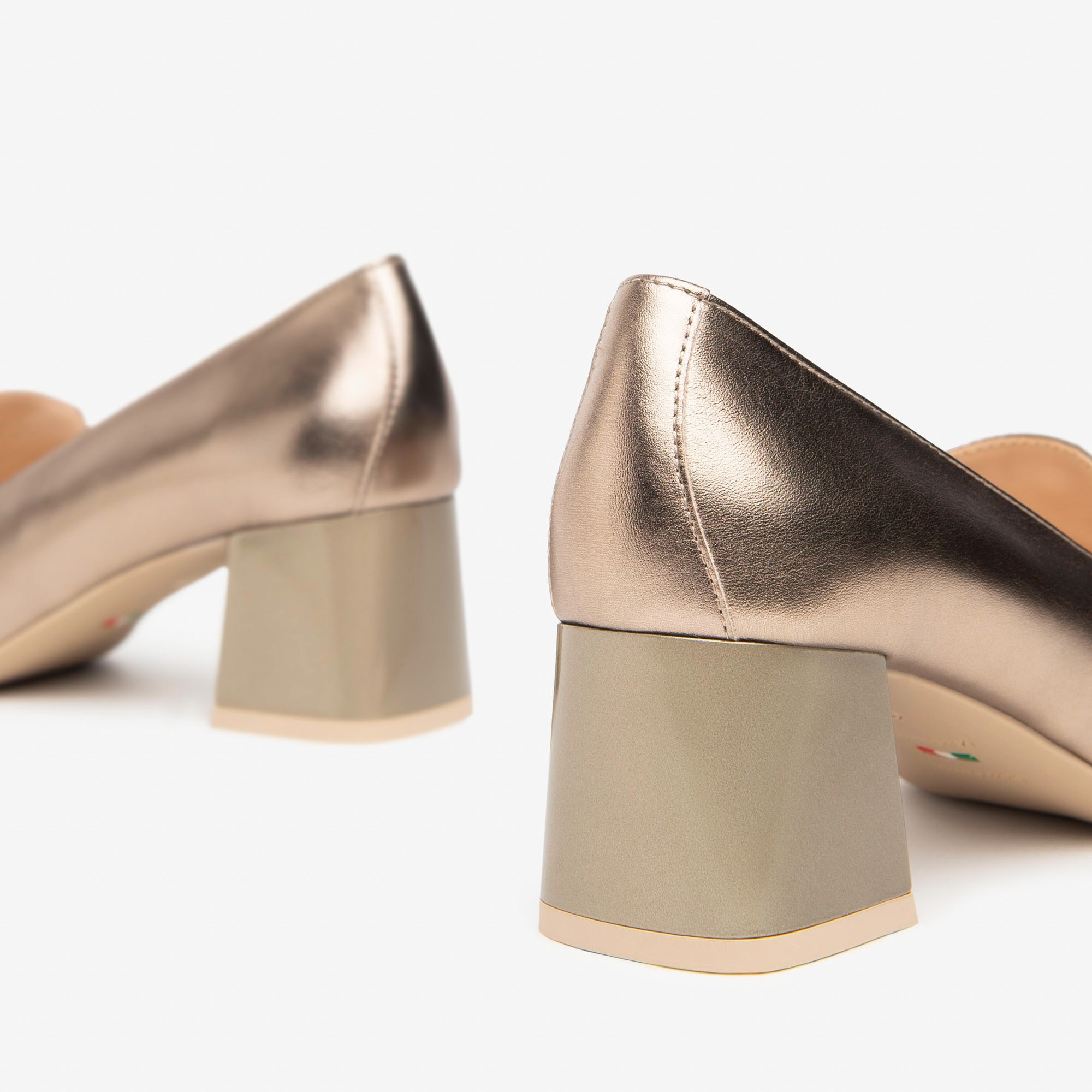 Nero Giardini laminat zlatne kožne cipele na srednju stabilnu punu petu.